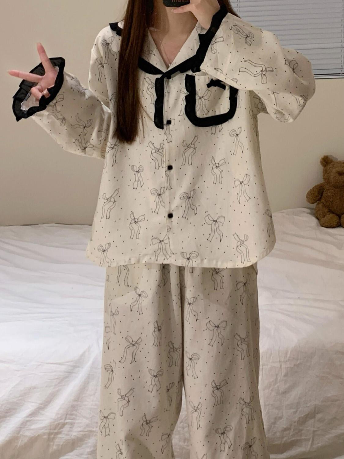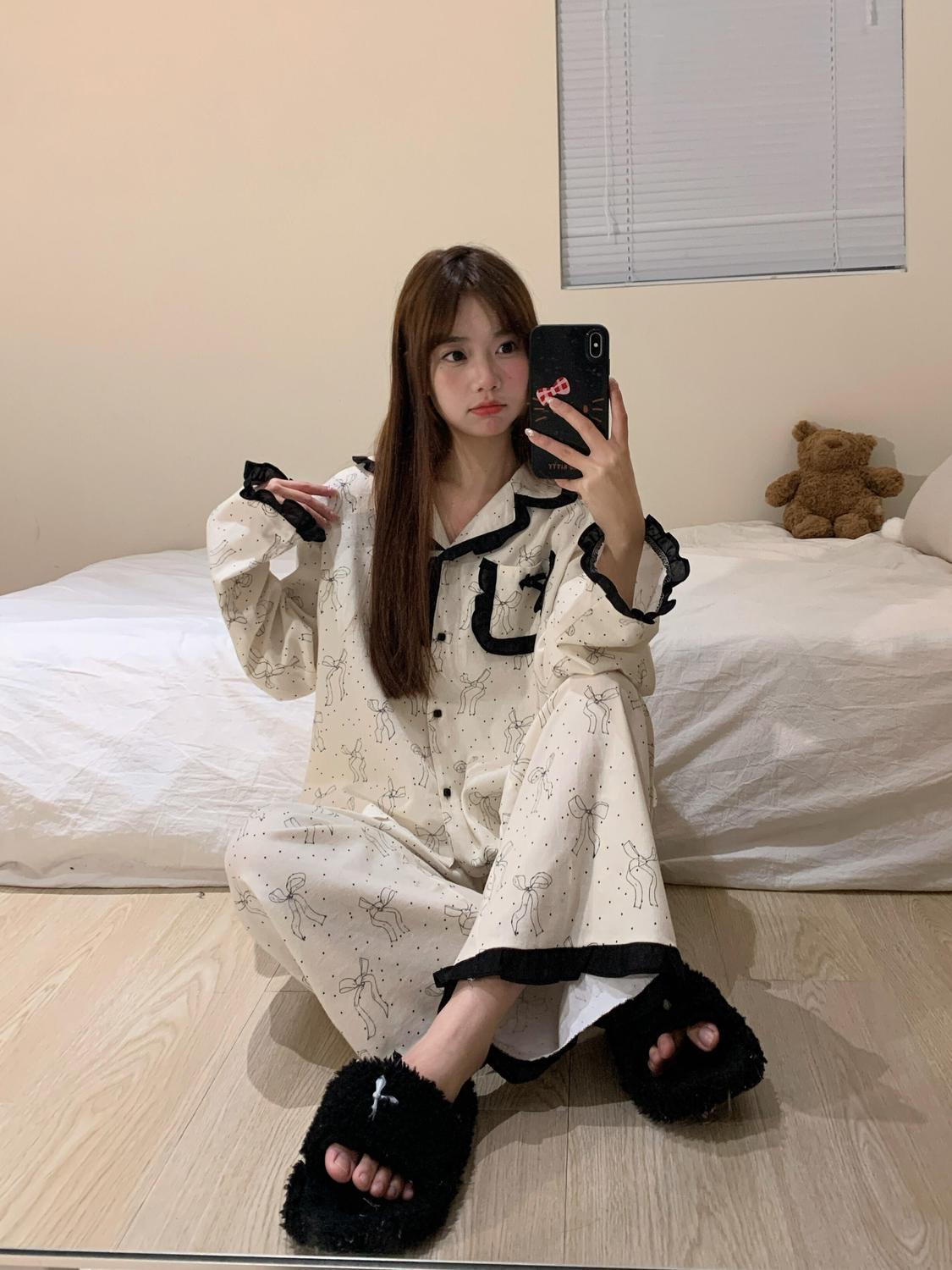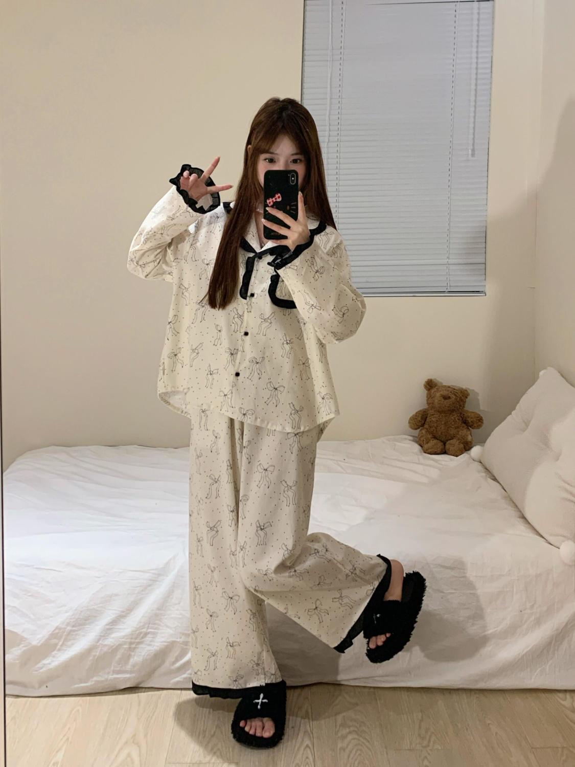 귀여운 활 파자마 여성의 봄과 가을 새 레이스 긴팔 바지 일본 학생 홈 의류 세트 외부 착용스토어 가기