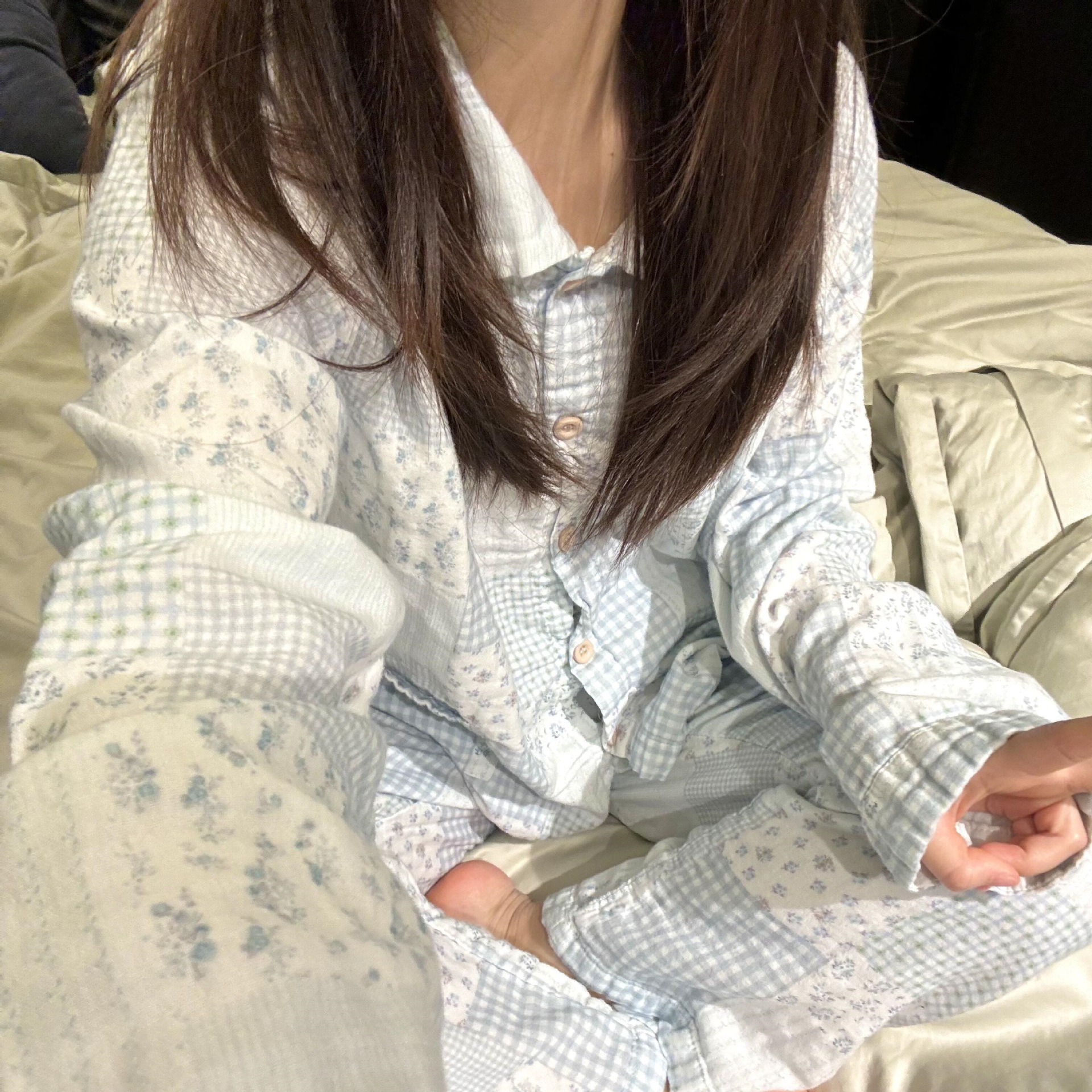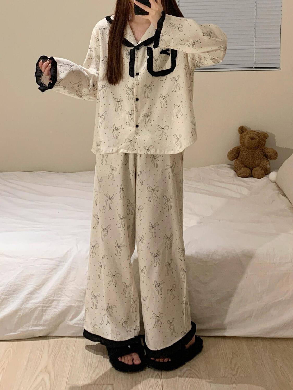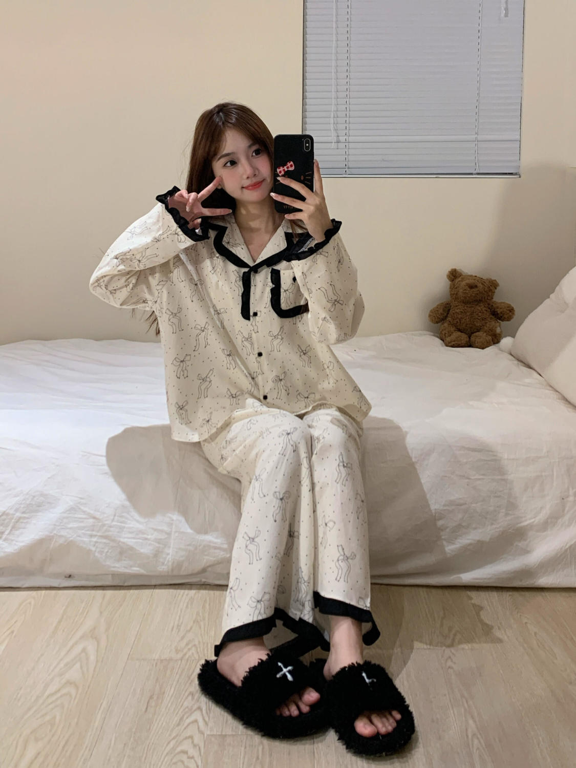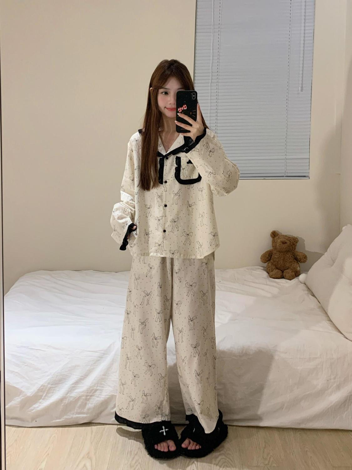 귀여운 활 파자마 여성의 봄과 가을 새 레이스 긴팔 바지 일본 학생 홈 의류 세트 외부 착용스토어 가기
