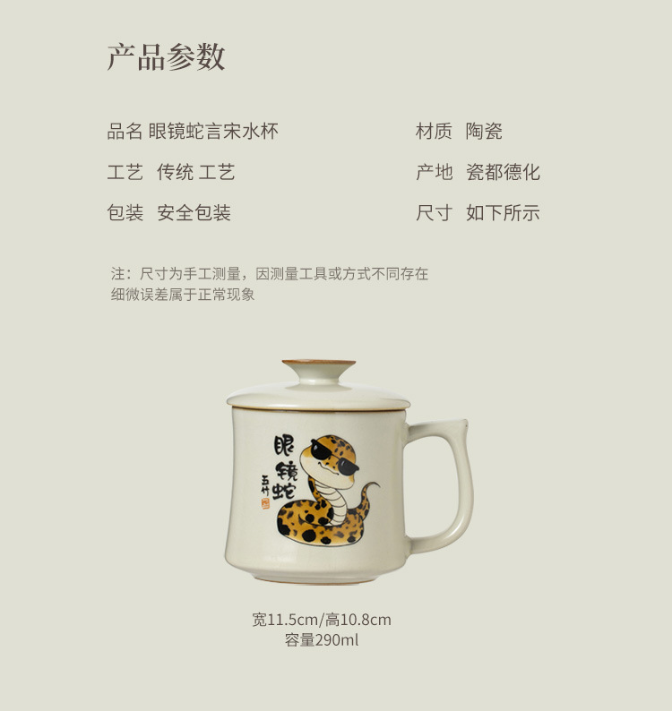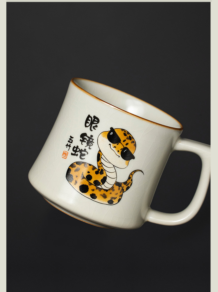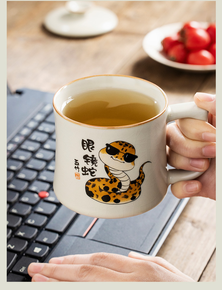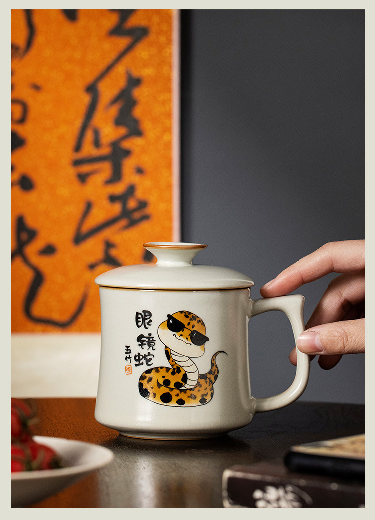 汝窑创意眼镜蛇马克杯带盖办公室茶杯陶瓷个人专用水杯子家用