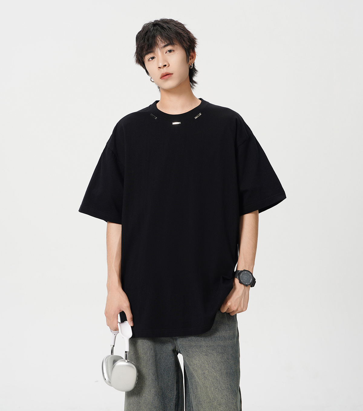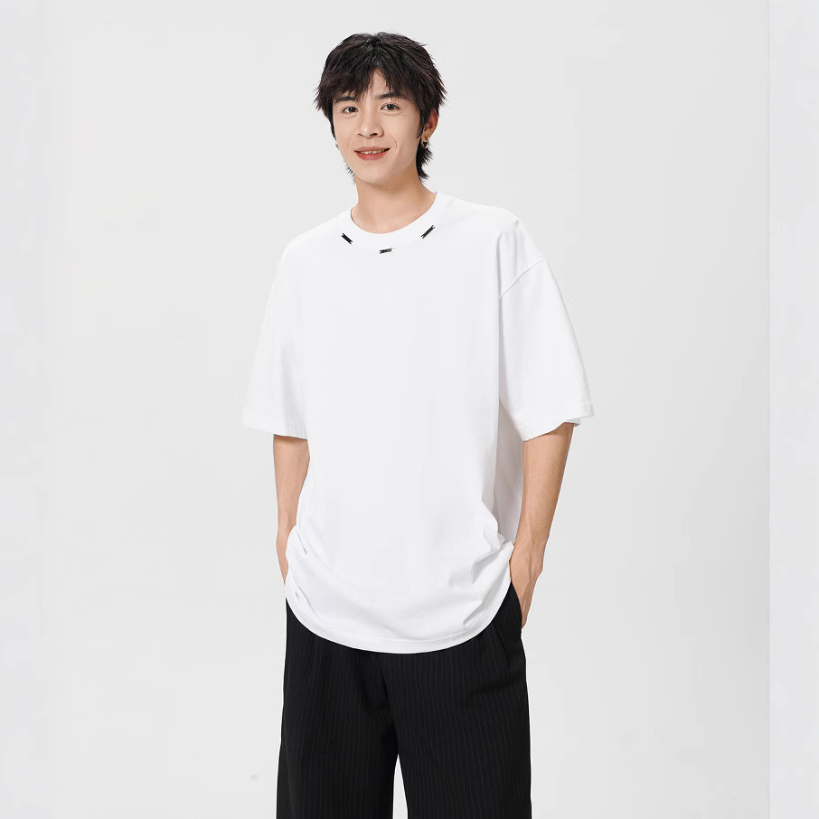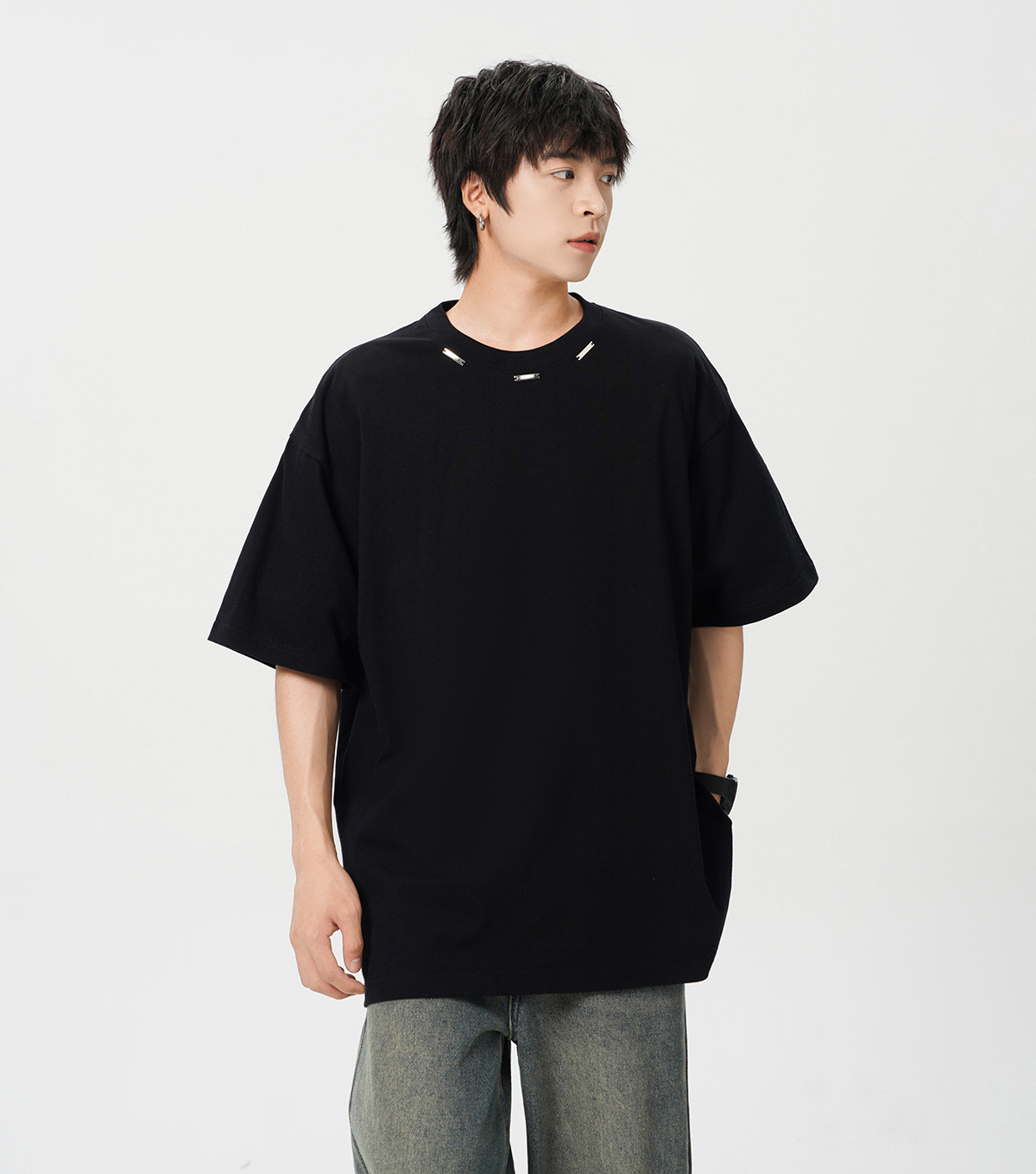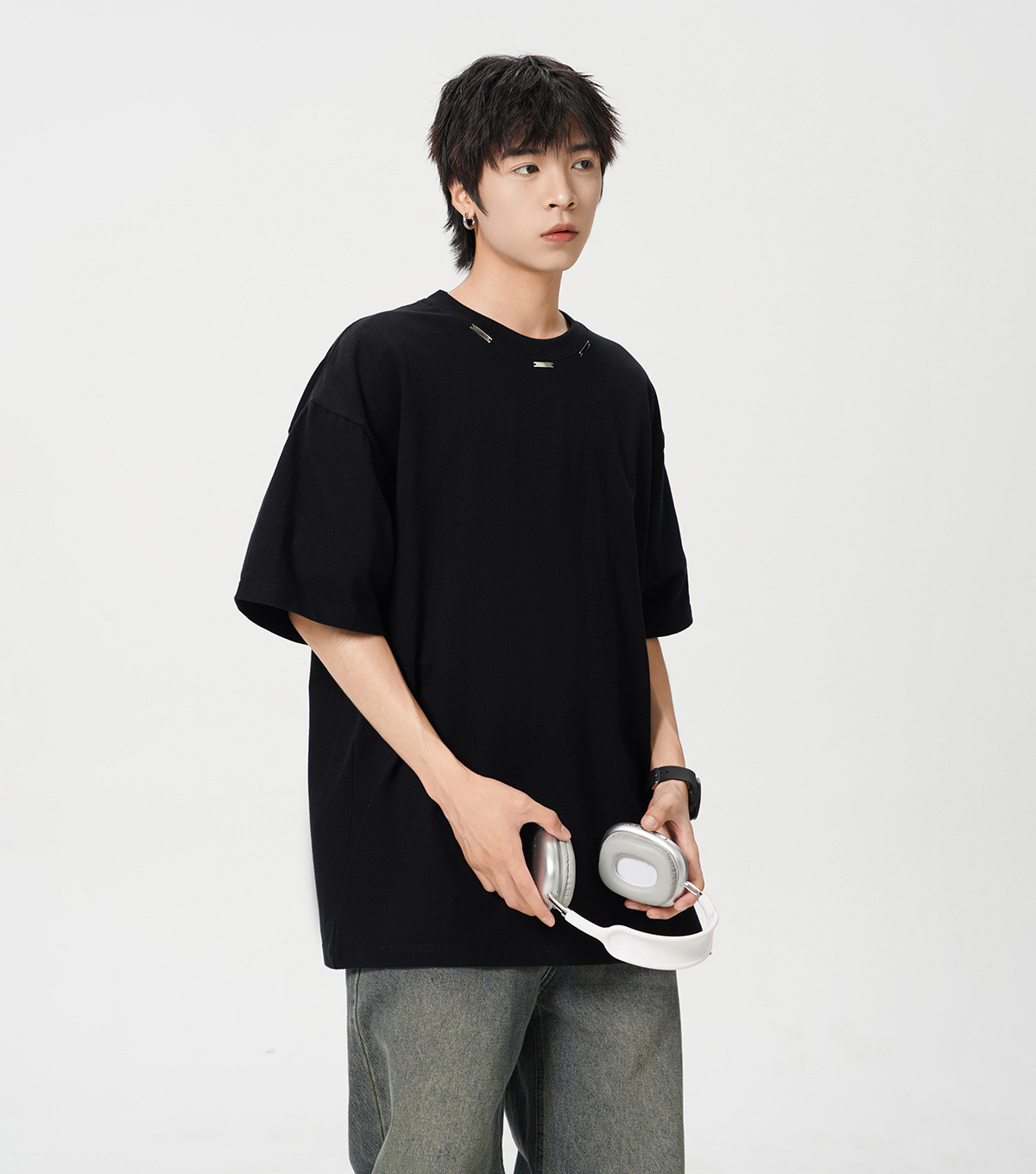 반팔 티셔츠 남자 2025 년 여름 새로운 작은 코 디자인 틈새 금속 무거운 무게 느슨한 반소매 티셔츠