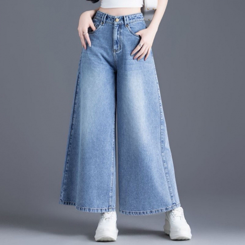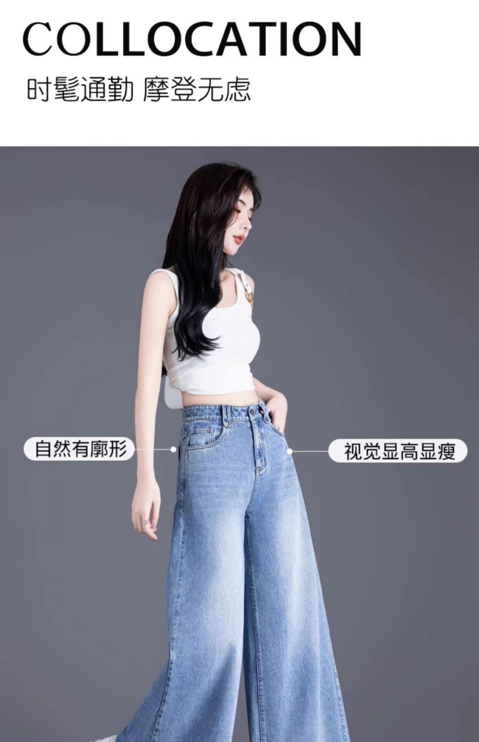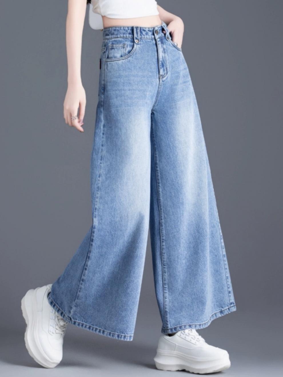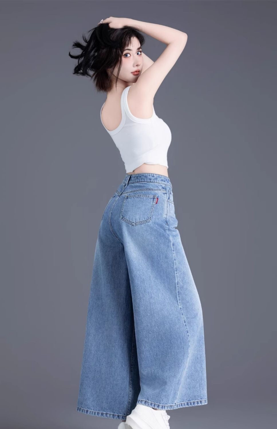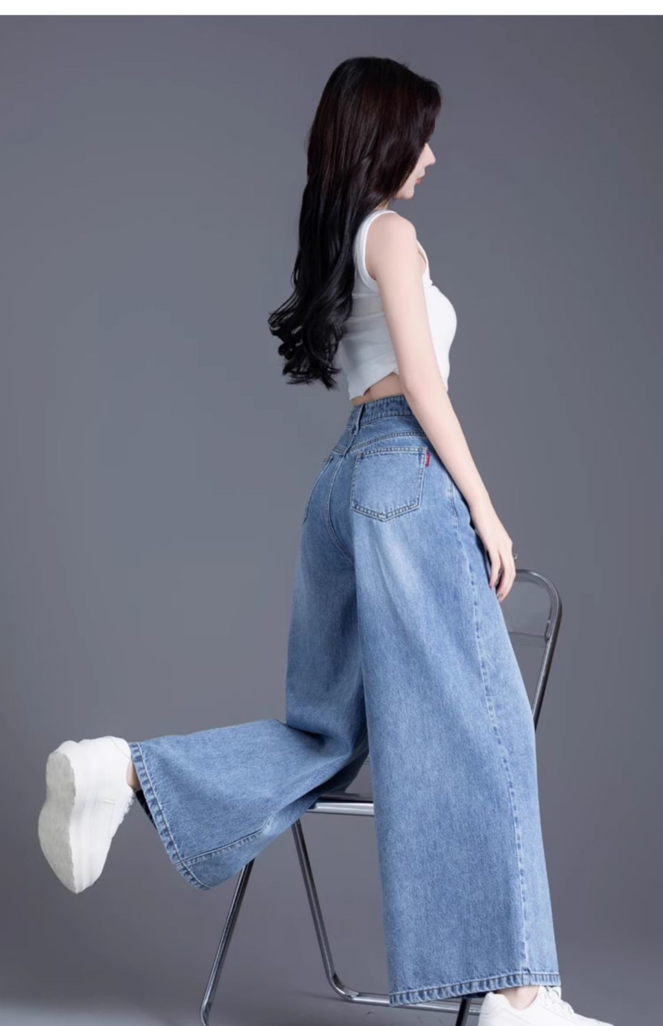 하이 엔드 라이트 컬러 청바지 여성의 새로운 도착 2025 봄/여름 느슨한 여성의 넓은 다리 바지 스커트 바지 작은 자른 바지