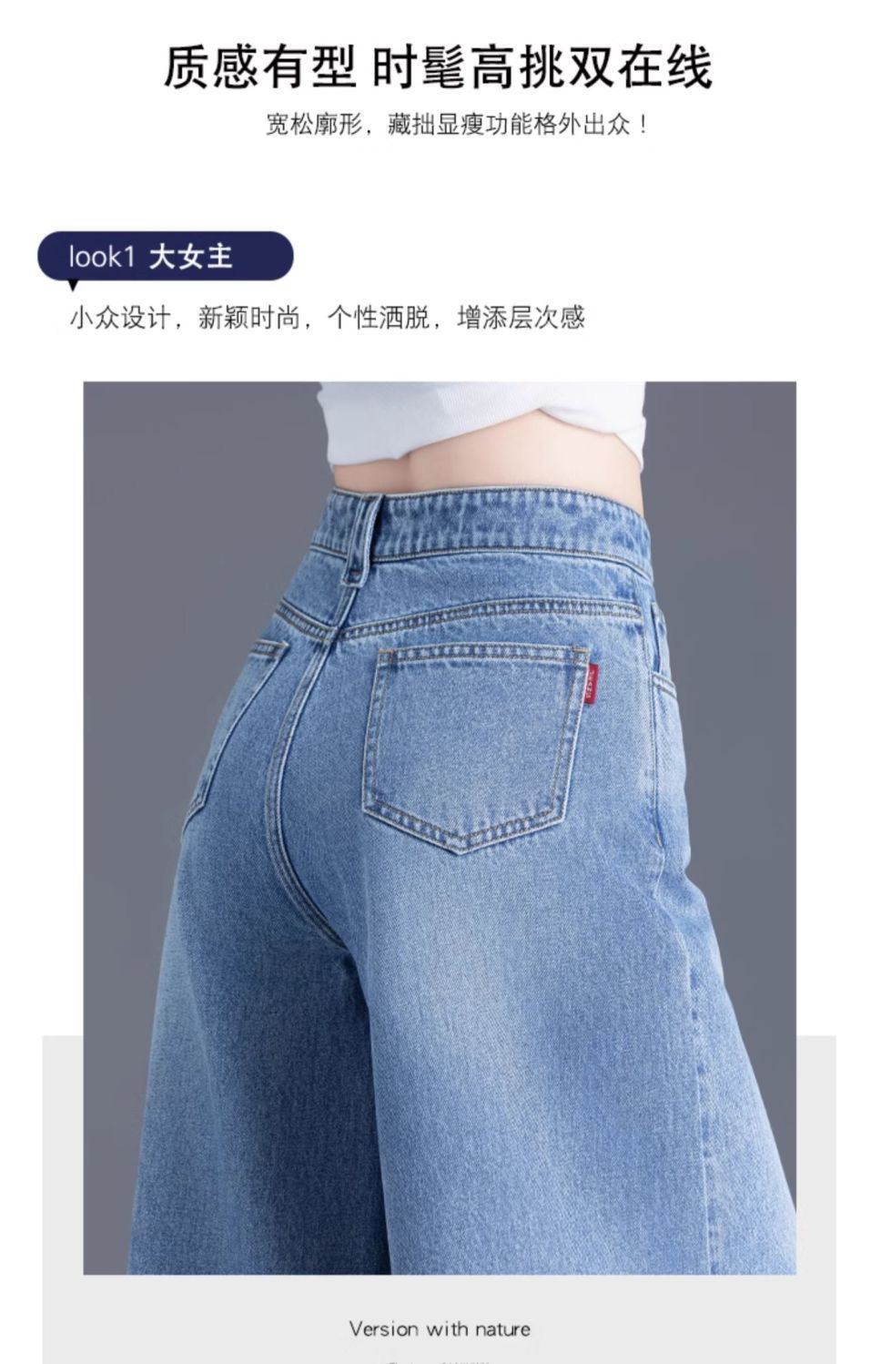 하이 엔드 라이트 컬러 청바지 여성의 새로운 도착 2025 봄/여름 느슨한 여성의 넓은 다리 바지 스커트 바지 작은 자른 바지스토어 가기
