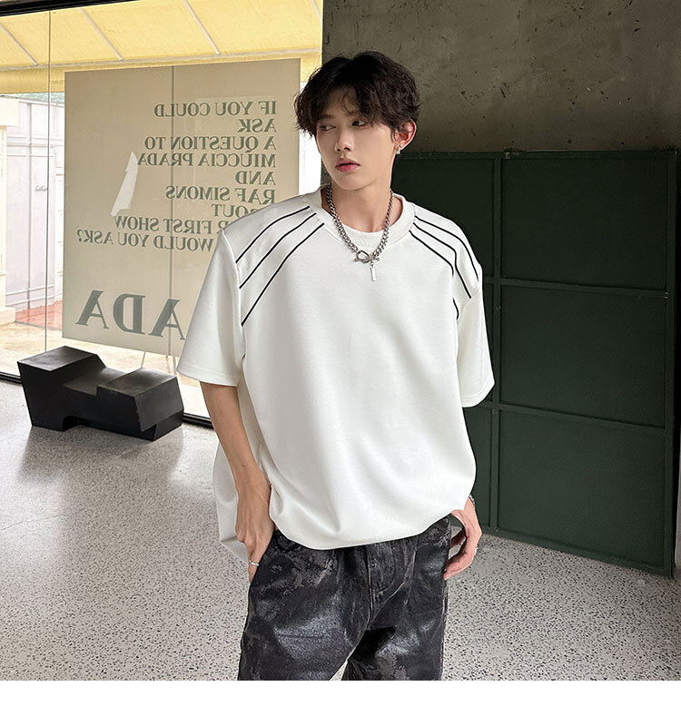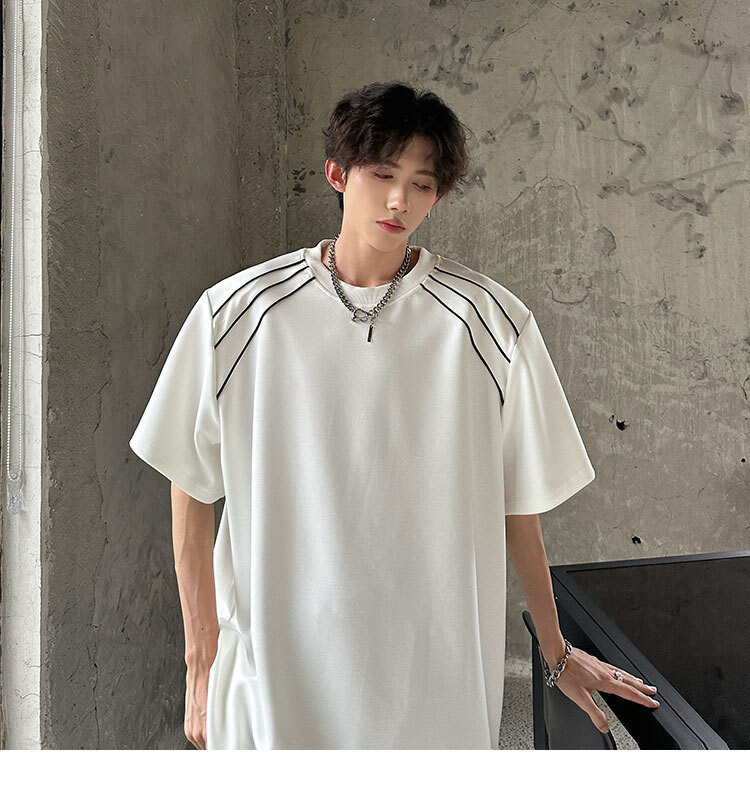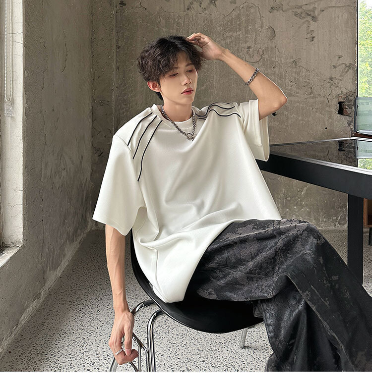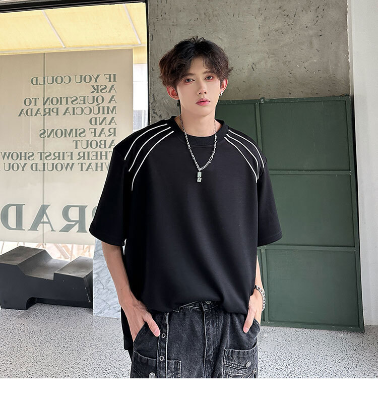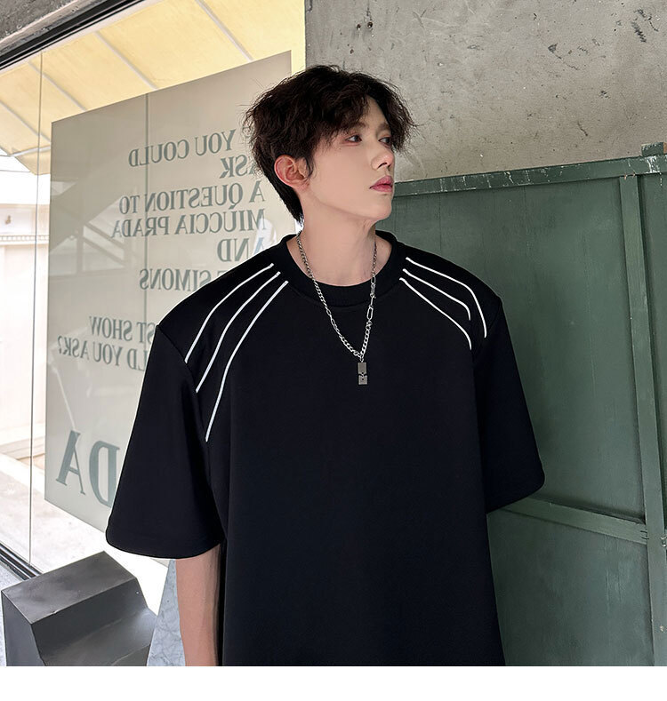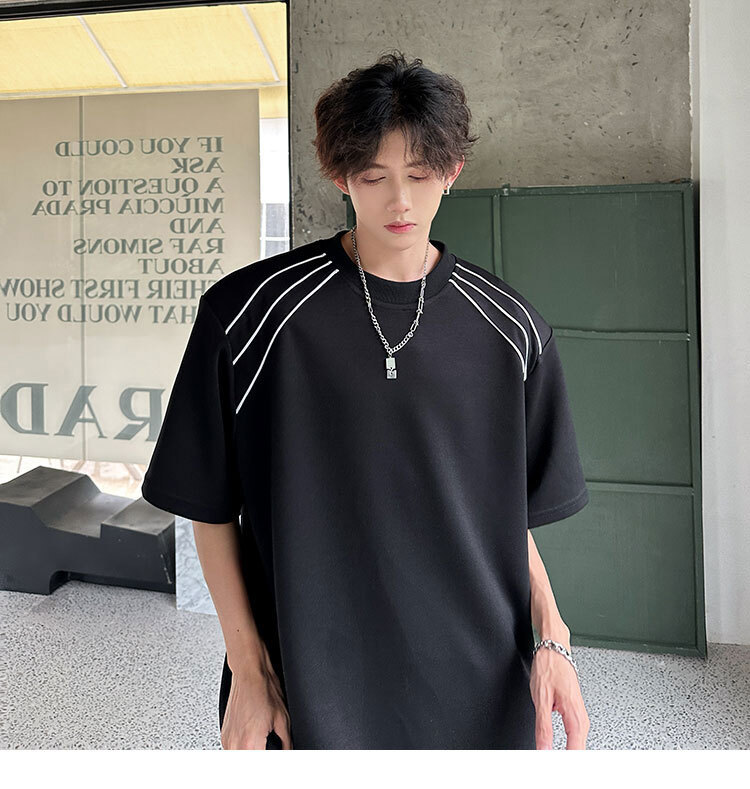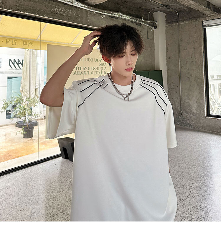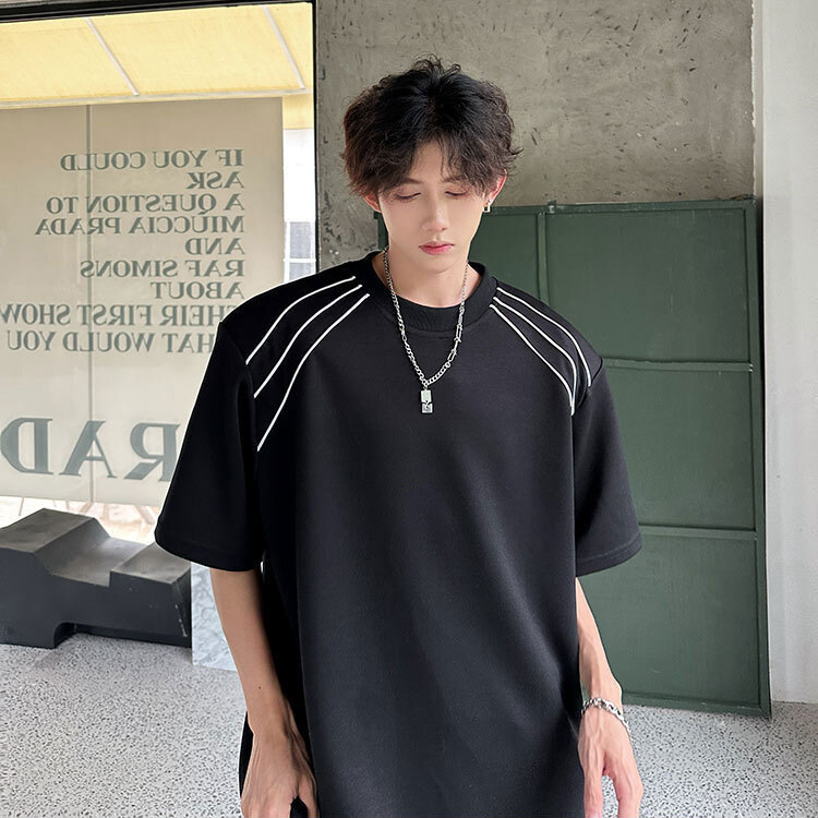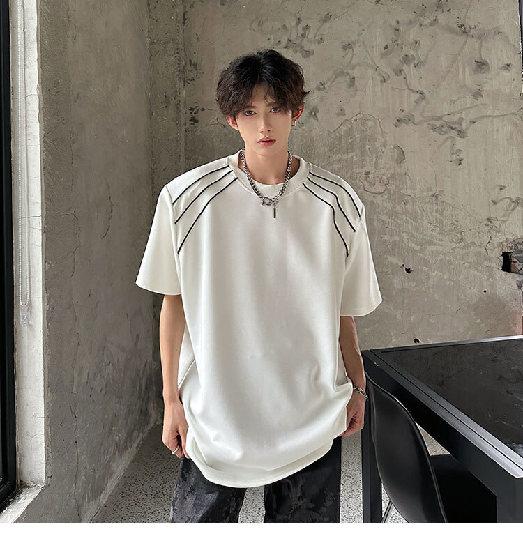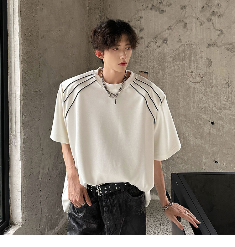 아메리칸 스타일 패션 브랜드 어깨 패드 반팔 티셔츠 남성용 여름 틈새 디자인 센스 반소매 느슨한 캐주얼 라운드 넥 탑