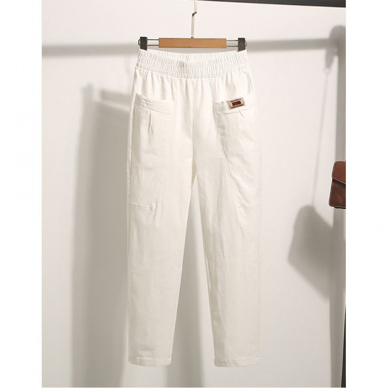 여름 얇은면 및 린넨 여성 바지 흰색 탄성 허리 깊은 높은 허리 중년 및 노인 어머니 하렘 바지 봄과 가을