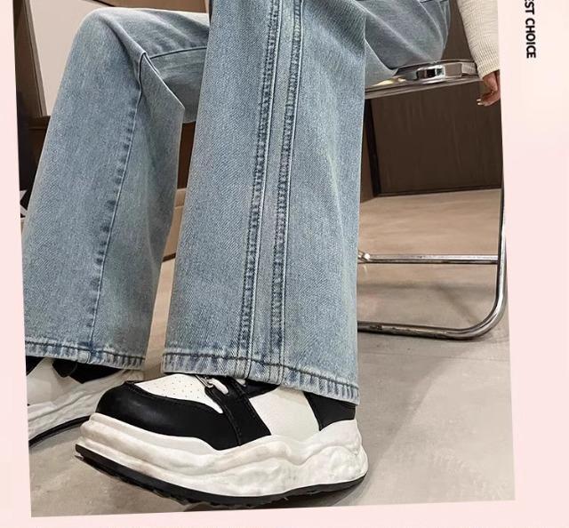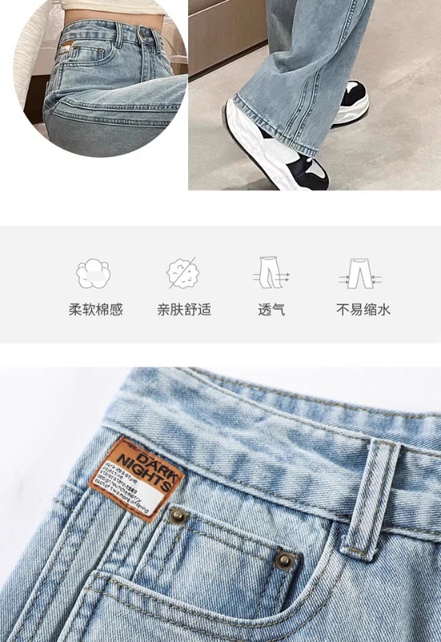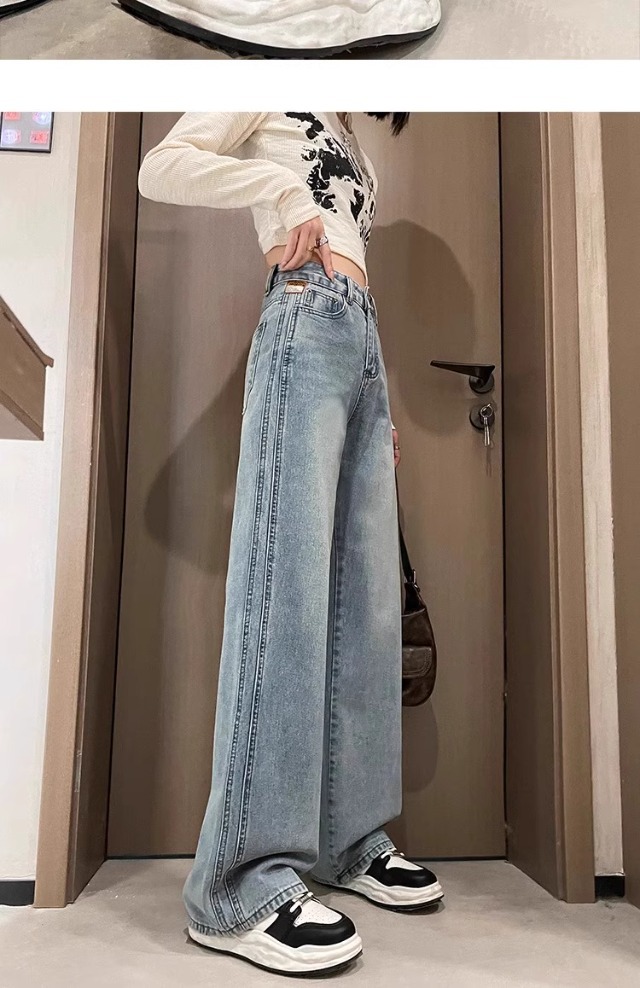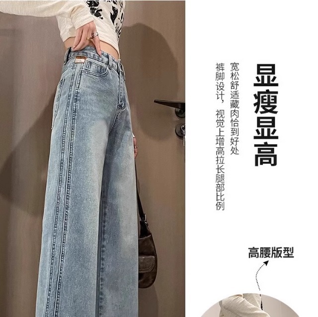 높은 허리 넓은 다리 청바지 여성의 봄과 가을 2025 새로운 슬리밍 느슨한 배 그림 밝은 색 직선 다리 바지스토어 가기