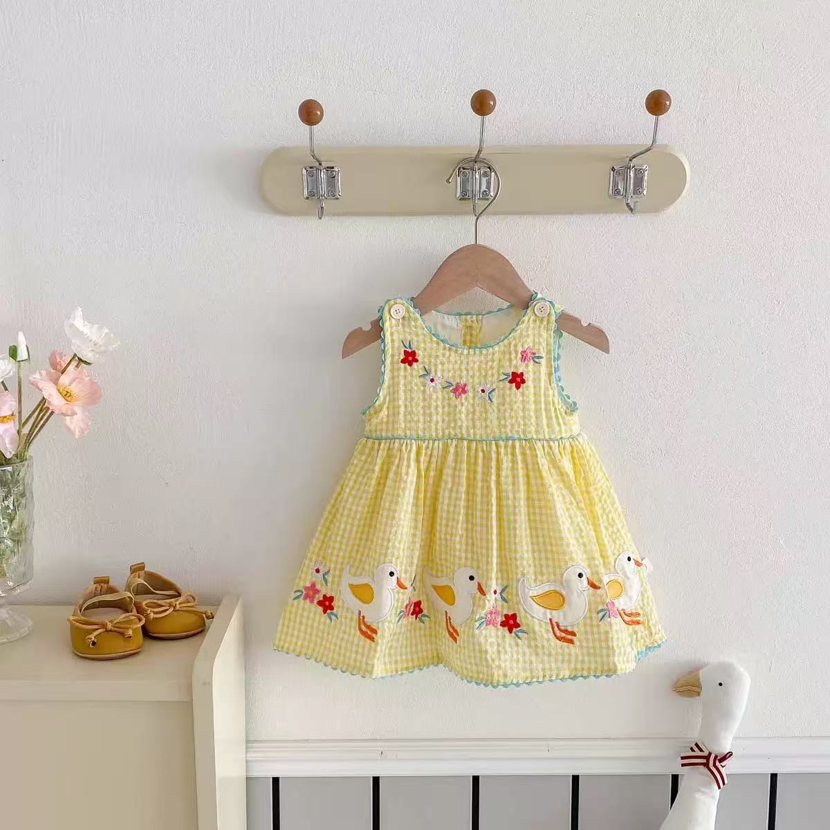 • 옐로우 덕 스위트 자수 민소매 드레스