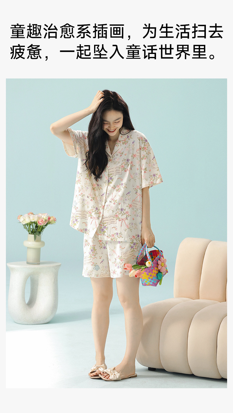 [일러스트 레이터 협력] 클래스 A 랙 코튼 여름 잠옷 여성 여름 반소매 코튼 카툰 홈 의류 세트