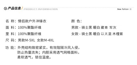产品名:连帽冲锋衣男女同款夹克外套春秋工作服防风防水户外运动情侣登山