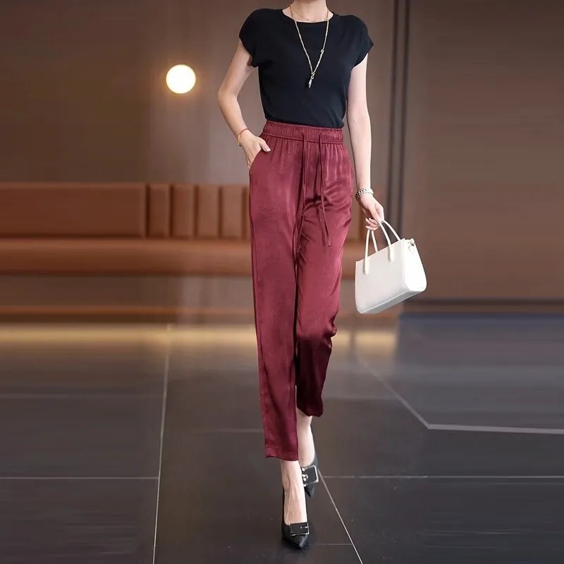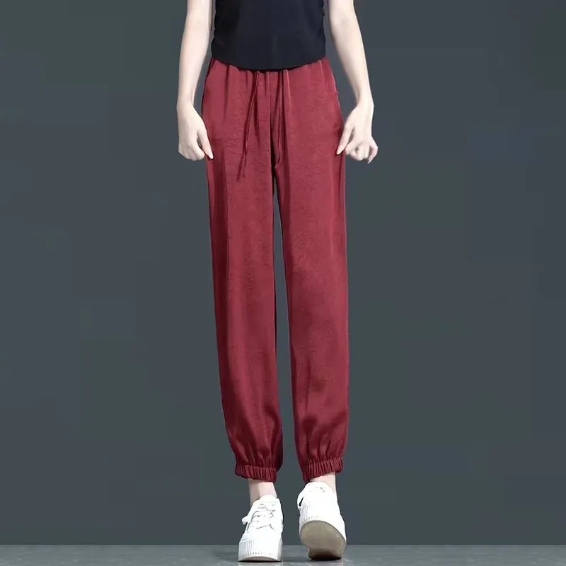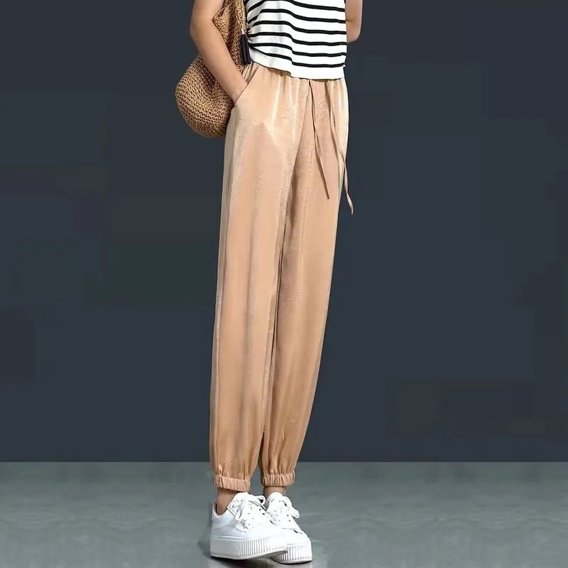 여름 새로운 아이스 실크 담근 할렌 바지 여자 높은 허리 슬리밍 얇은 느슨한 바지 올매치 유행 자른 바지