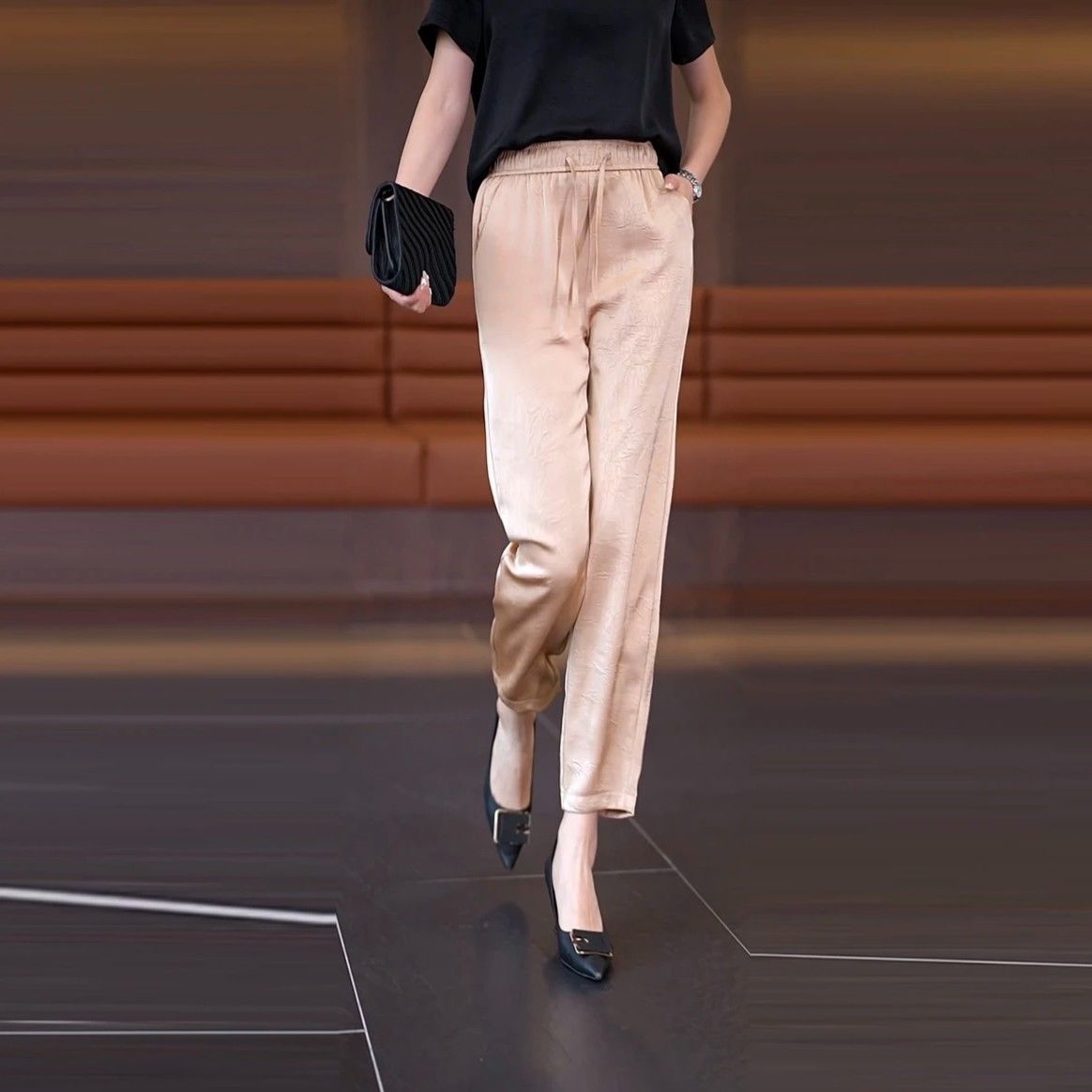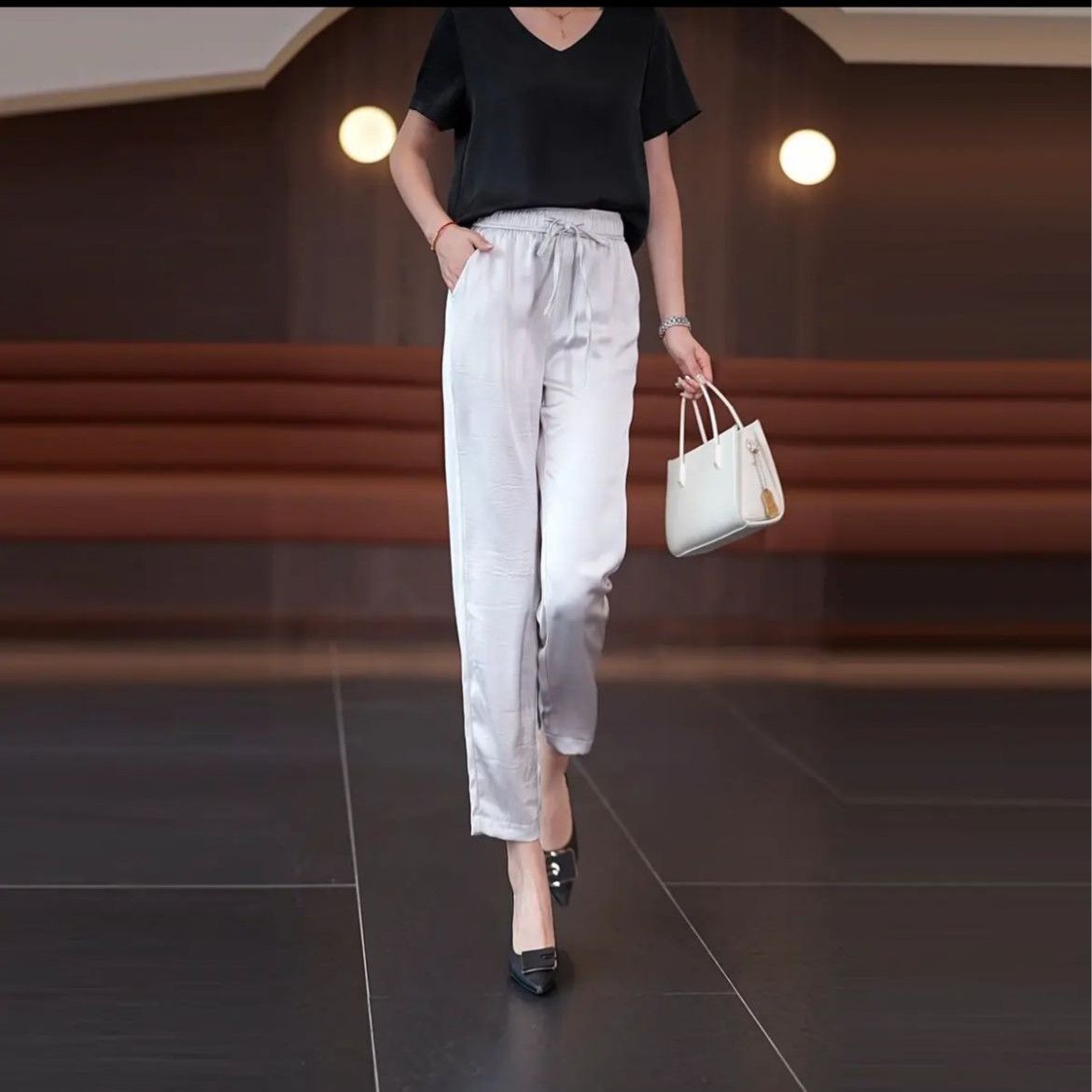 여름 새로운 아이스 실크 담근 할렌 바지 여자 높은 허리 슬리밍 얇은 느슨한 바지 올매치 유행 자른 바지스토어 가기