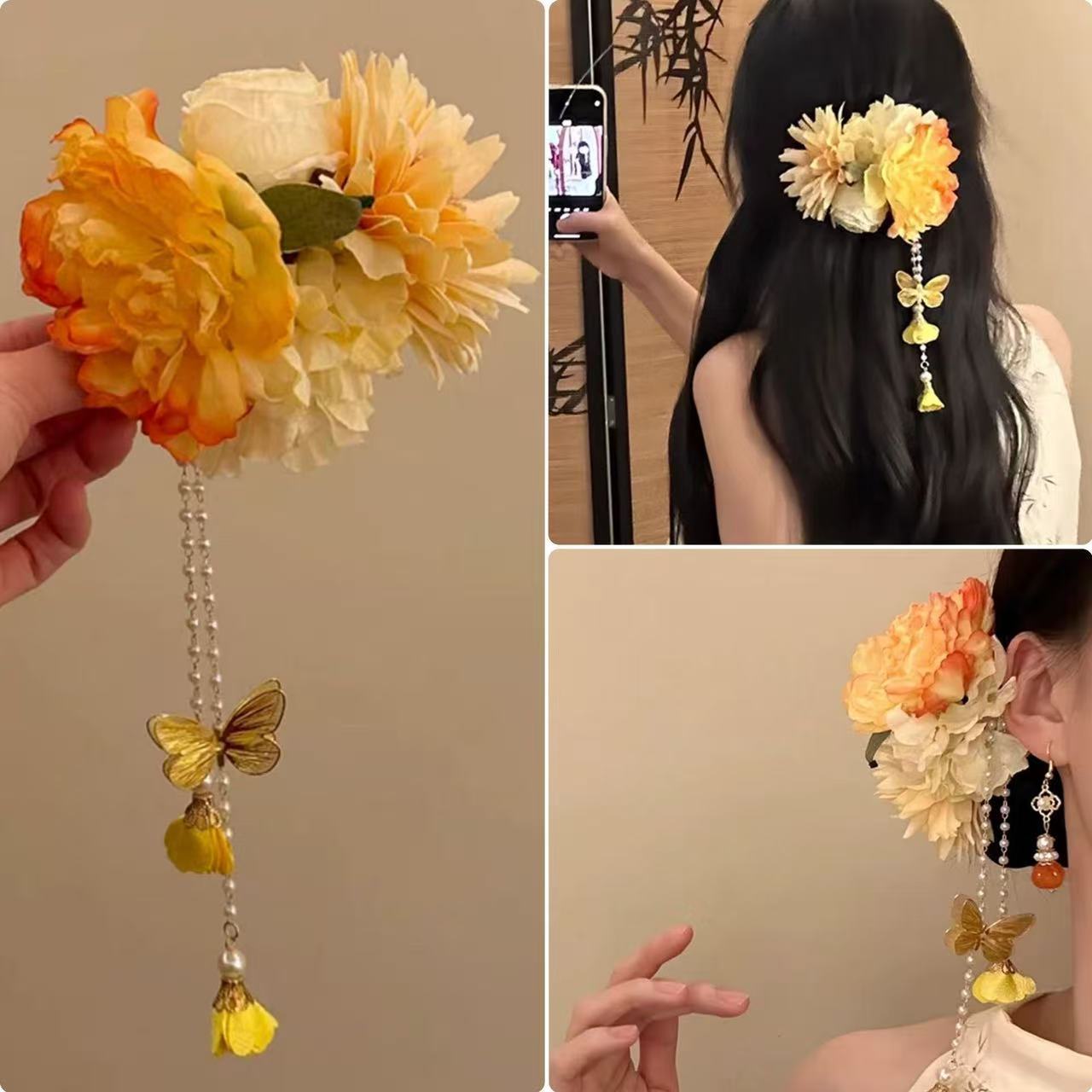 • 7355 골든 나비 꽃 술 머리핀