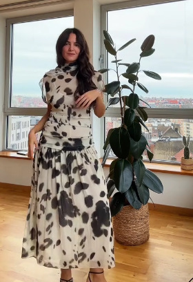 ZA 프린트 타이 염색 반팔 하이 웨이스트 슬림 핏 원피스 크로스 보더 유럽과 미국 패션 기질 중간 길이 스커트