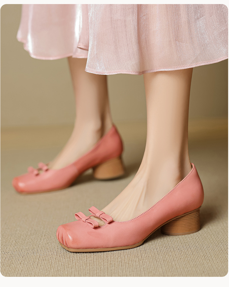 스퀘어 헤드 메리 제인 신발 여성 돼지 코 두꺼운 힐 신발 더블 활 미드 힐 신발 핑크 헤드 레이어 Cowhide 여성용 신발스토어 가기