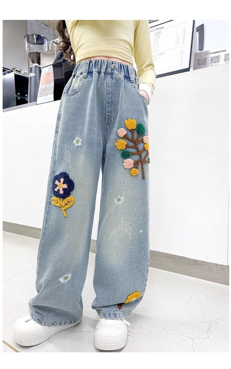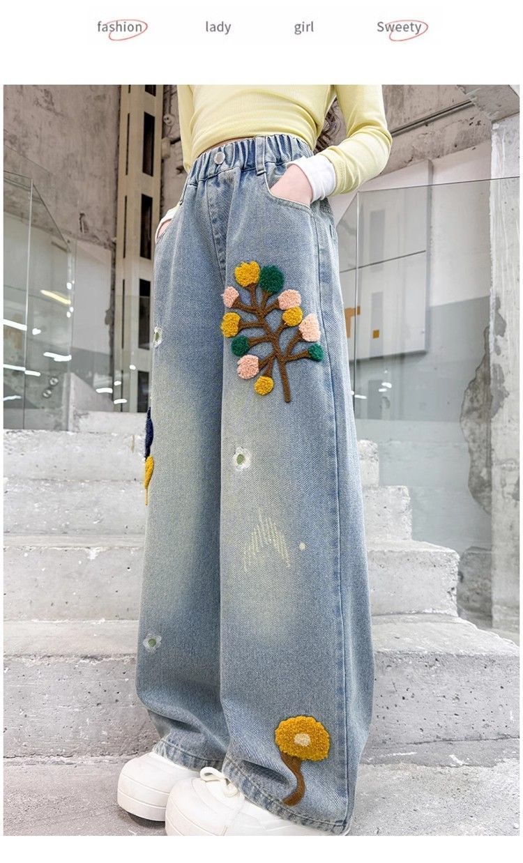 Youkaman Girls 'Jeants 봄과 가을 2025 새로운 어린이 서양식 봄 느슨한 바지 넓은 다리 바지