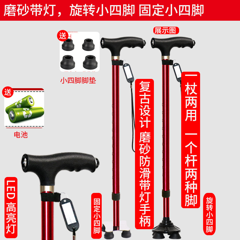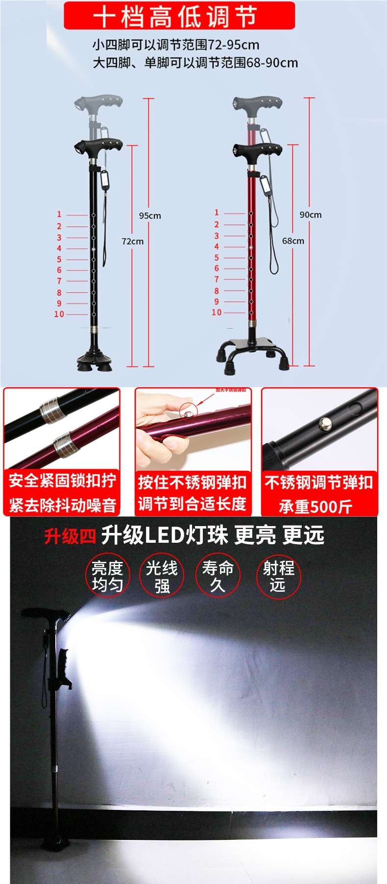 노인 미끄럼 방지 워킹 스틱 4 발 보행 스틱 알루미늄 합금 텔레스코픽 라이트 워킹 스틱 조명 조절 기능이있는 다기능 워킹 스틱