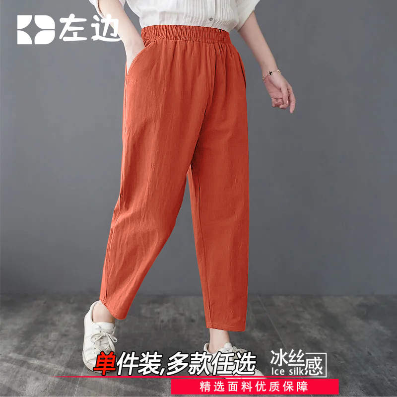 할란 바지 여자 여름 얇은 바지 아이스 실크 자른 중년 어머니 바지 느슨한 플러스 사이즈 캐주얼 여성 당근 바지스토어 가기