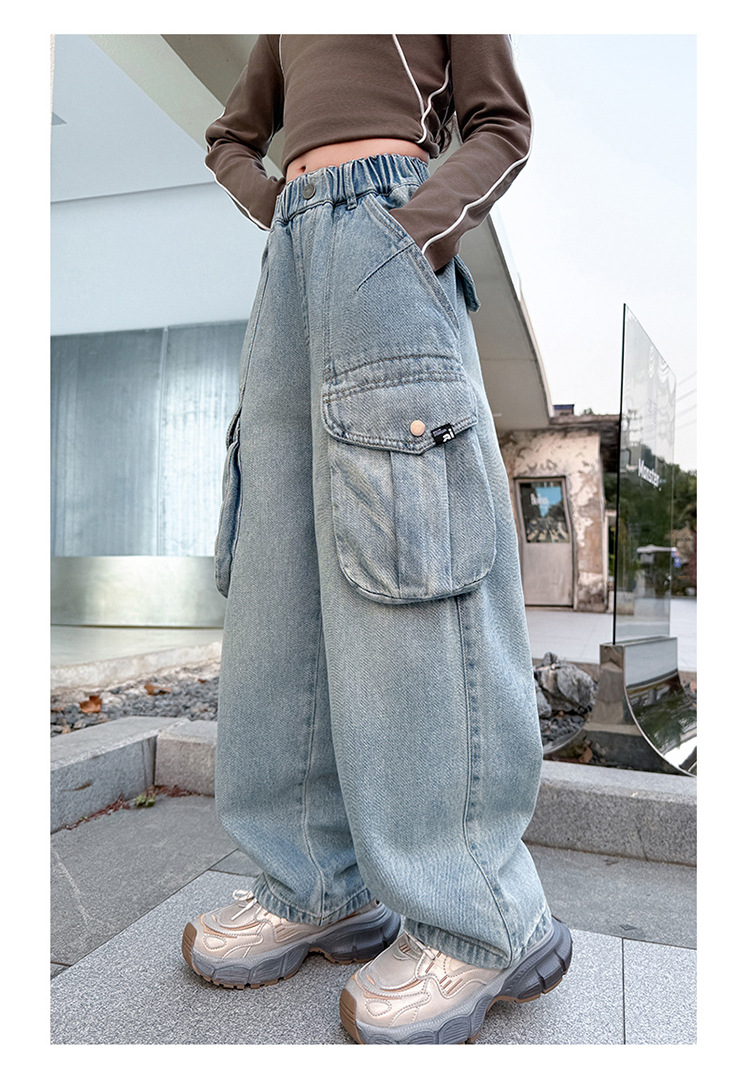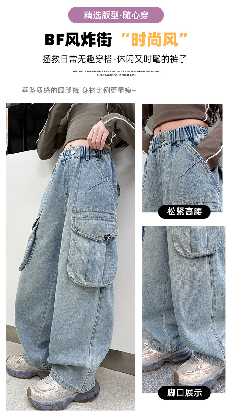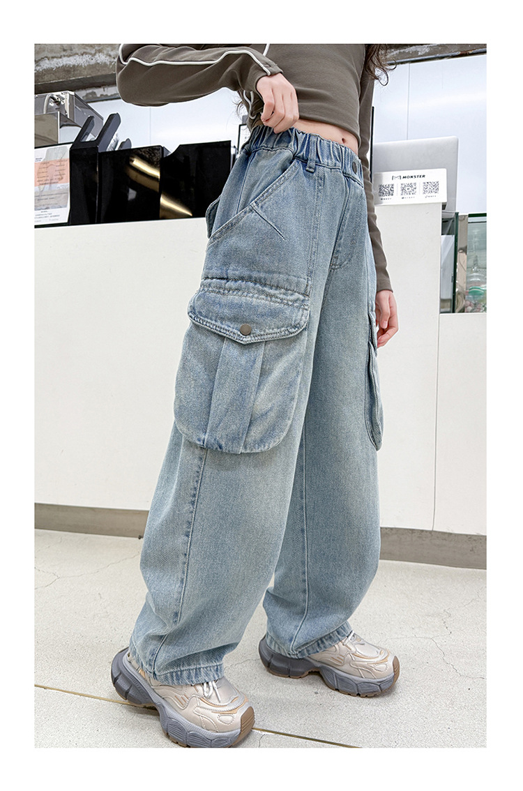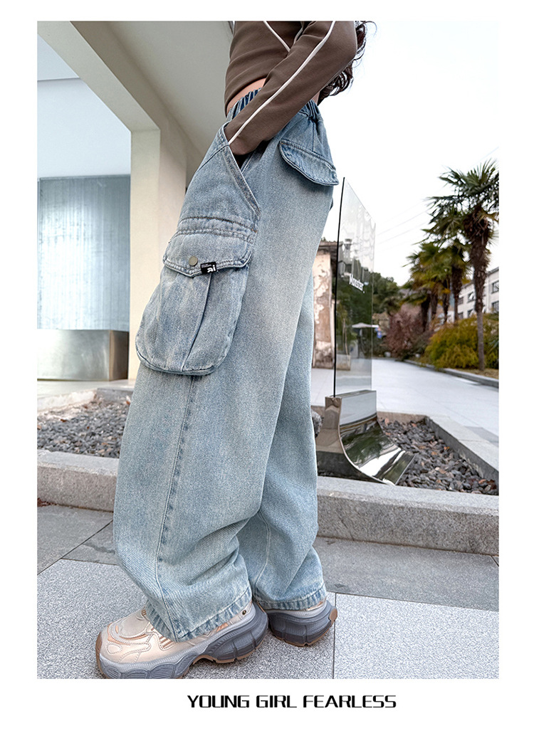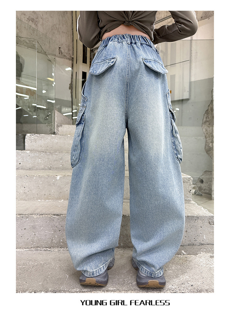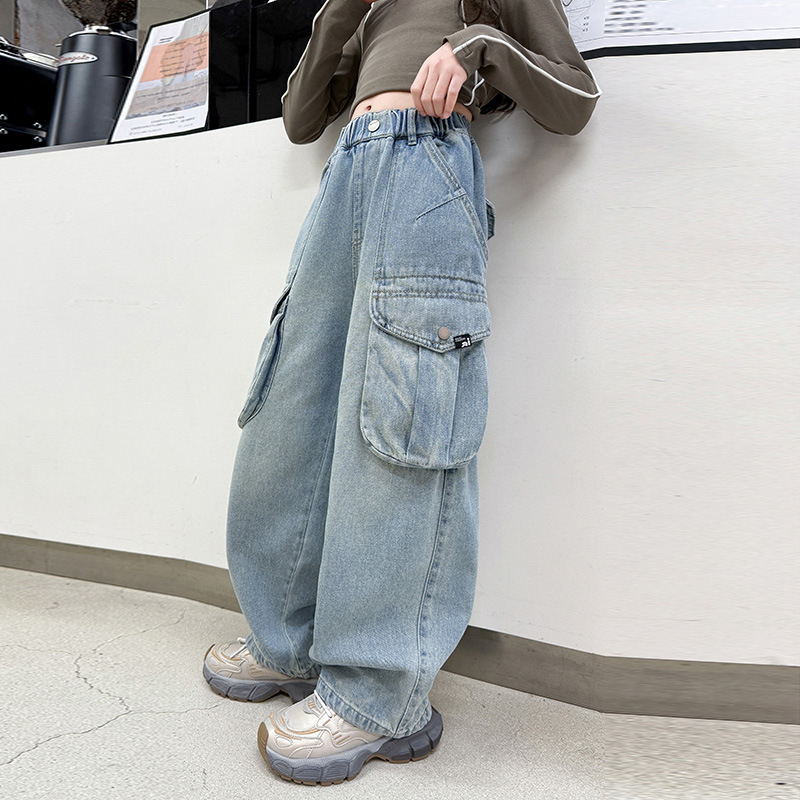 소녀 청바지 봄과 가을 2025 새로운 서양 스타일 유행 느슨한 바지 3 차원 큰 포켓 어린이 넓은 다리 바지스토어 가기