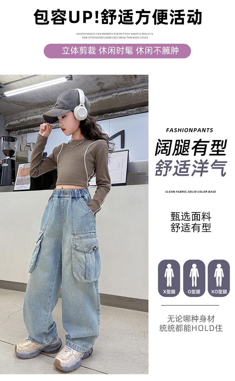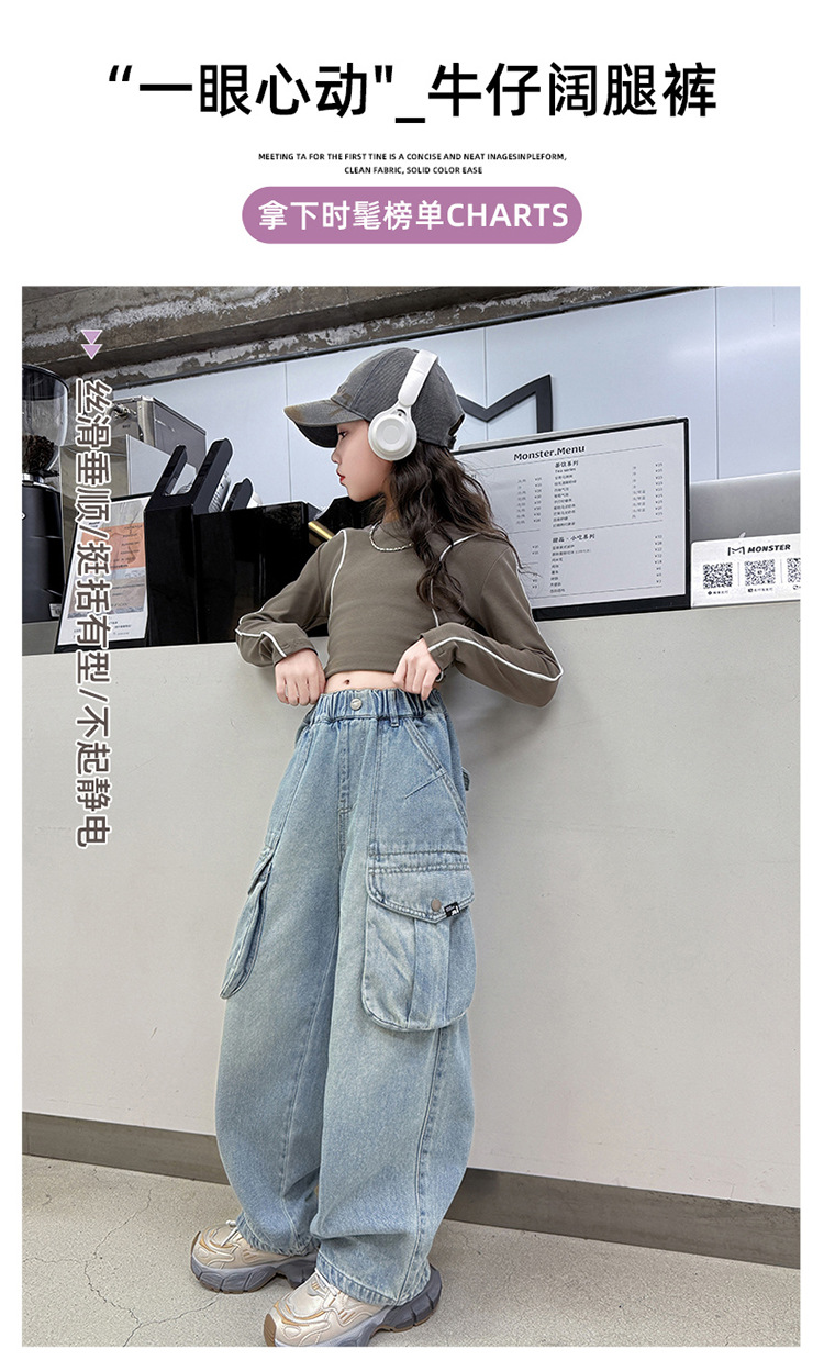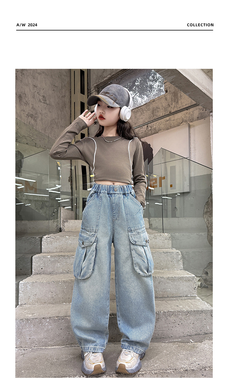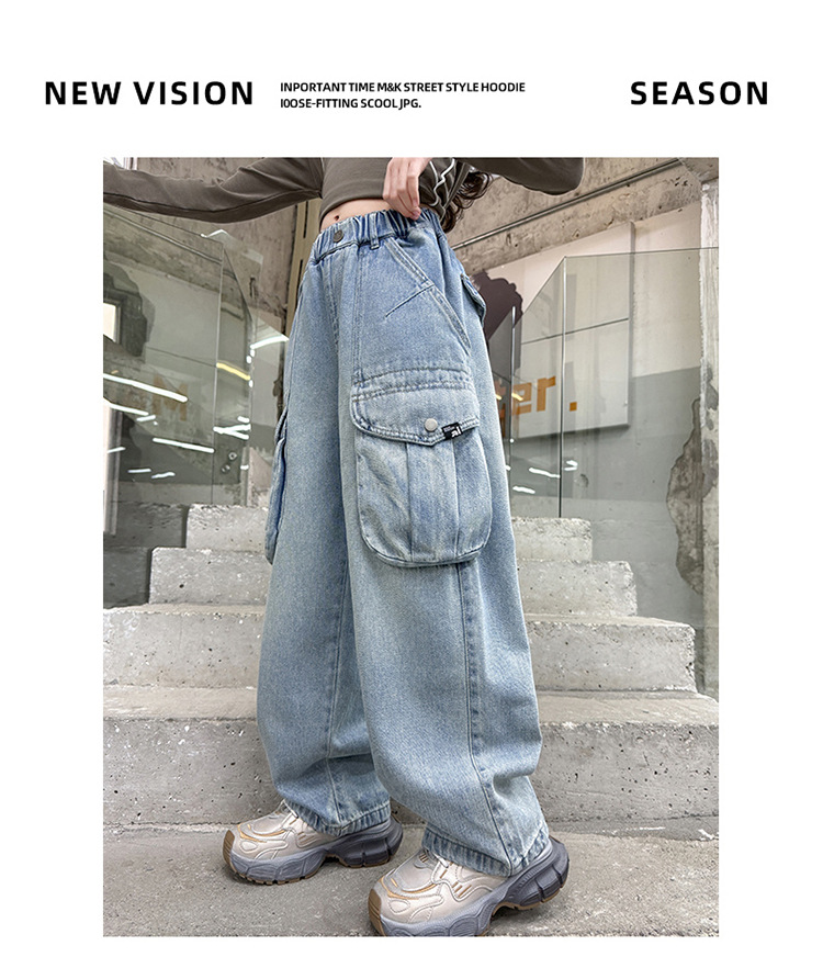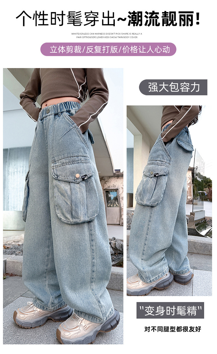 소녀 청바지 봄과 가을 2025 새로운 서양 스타일 유행 느슨한 바지 3 차원 큰 포켓 어린이 넓은 다리 바지스토어 가기