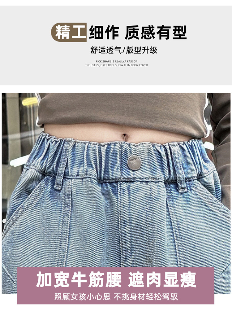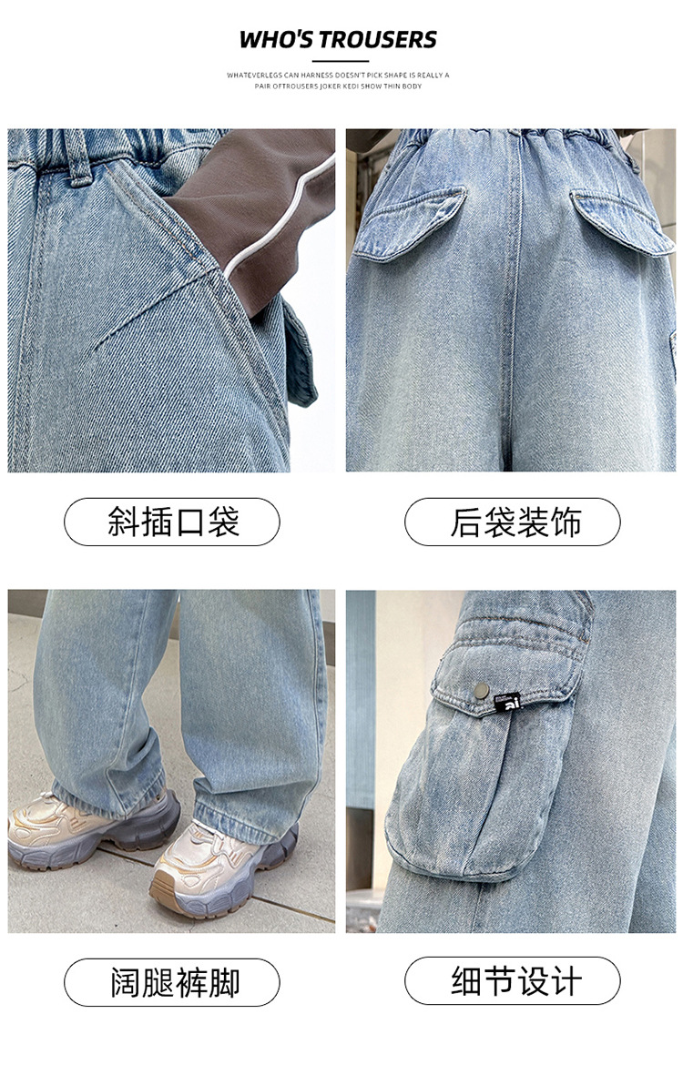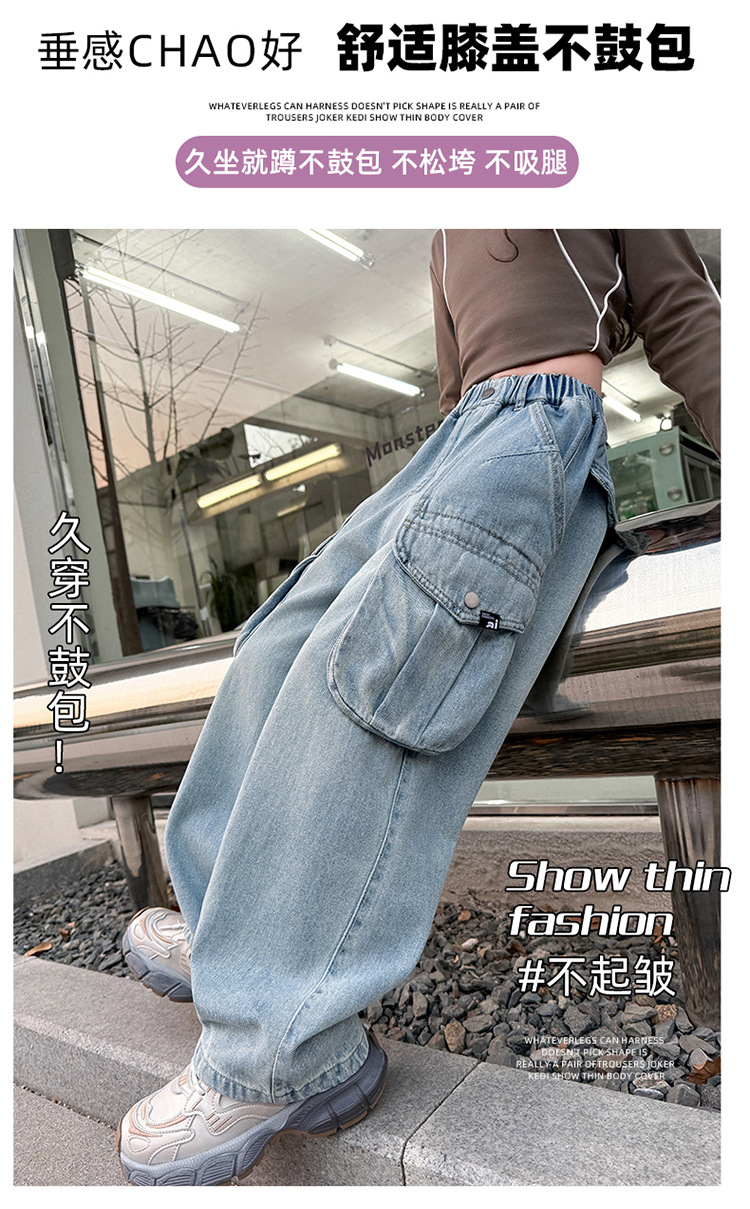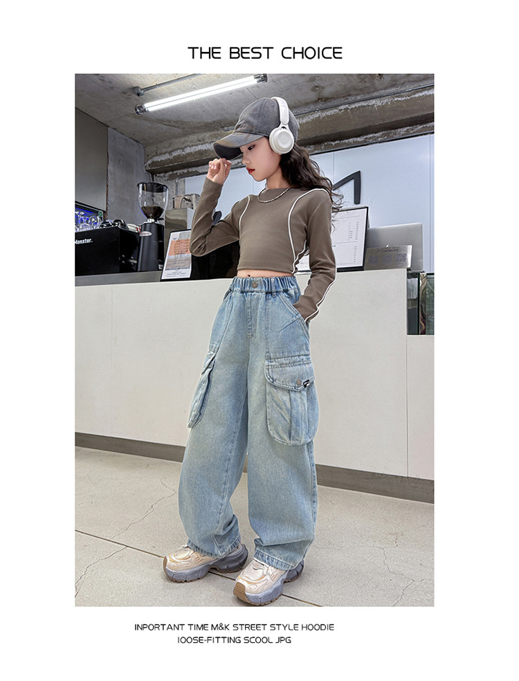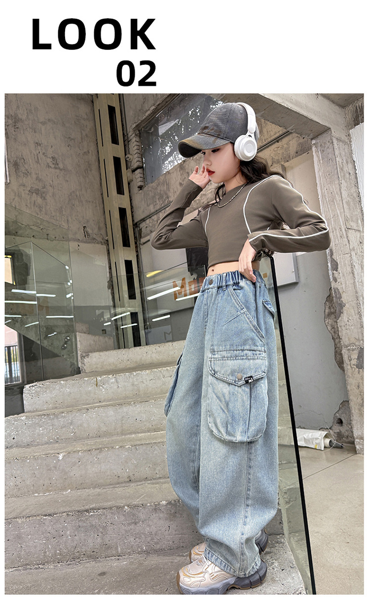 소녀 청바지 봄과 가을 2025 새로운 서양 스타일 유행 느슨한 바지 3 차원 큰 포켓 어린이 넓은 다리 바지스토어 가기