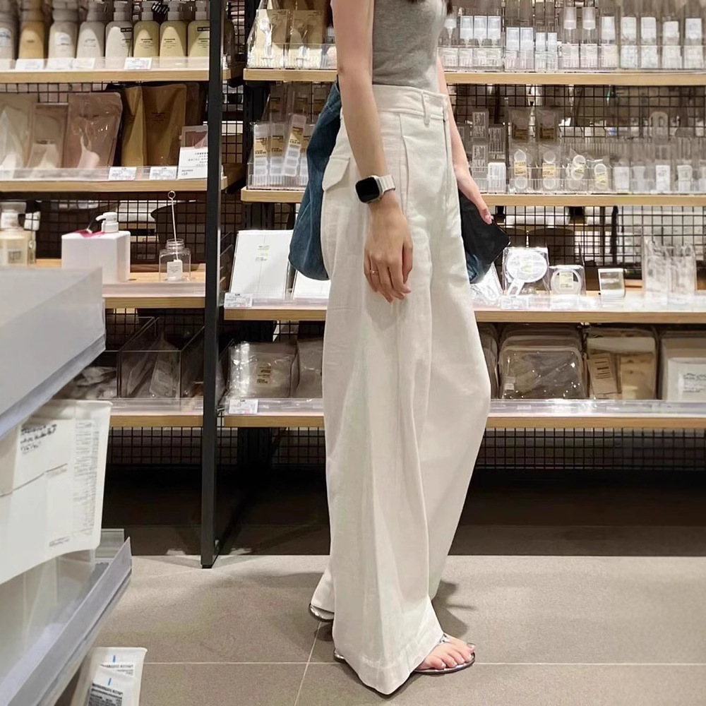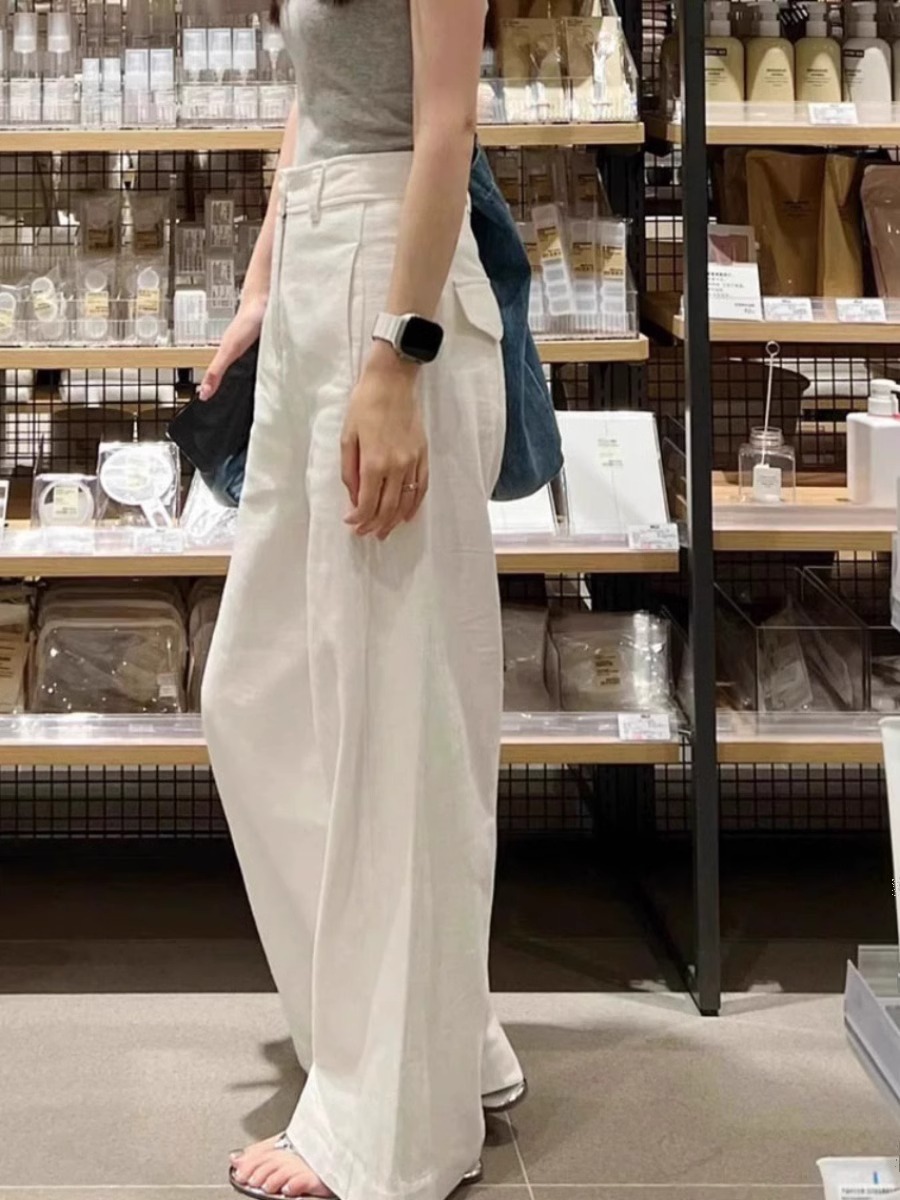 白色高腰棉麻阔腿裤女夏季高级感垂感直筒休闲裤宽松显瘦拖地裤春