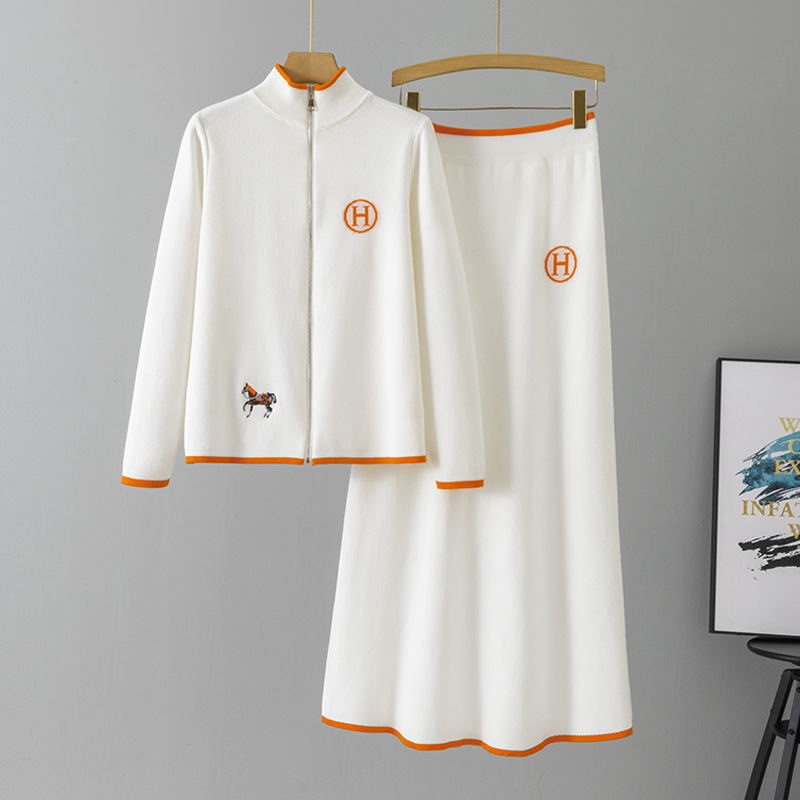 국경 유럽과 미국의 니트 패션 정장 여성 가을, 겨울 크리 에이 티브 말 자수 스웨터 재킷 캐주얼 롱 스커트 투피스 세트스토어 가기