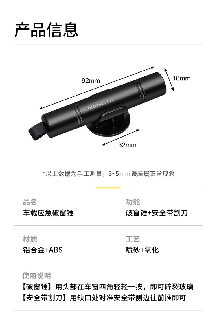 【产品名称】:汽车破窗器逃生锤应急消防多功能安全锤撞针隐藏割刀车载安全用品