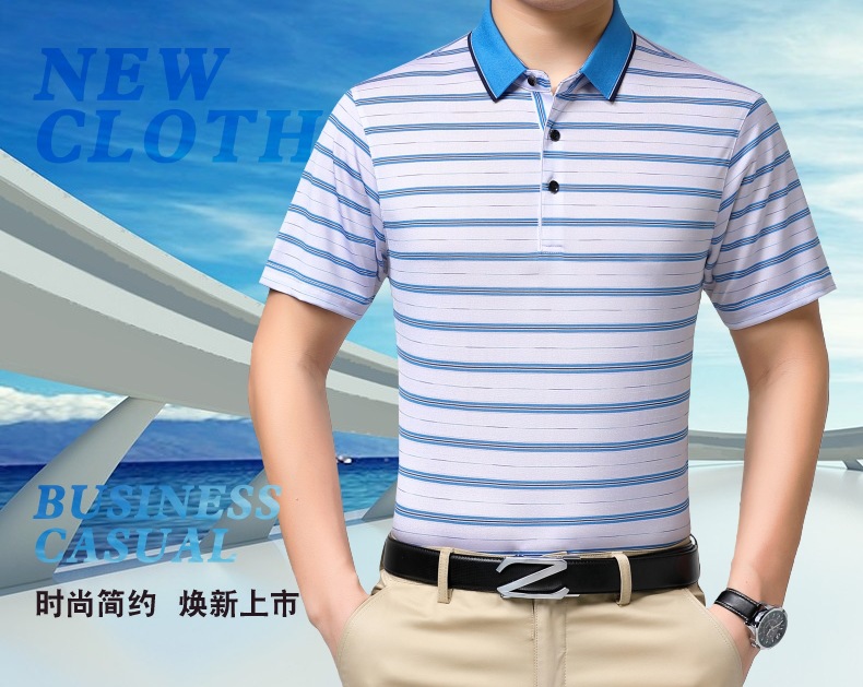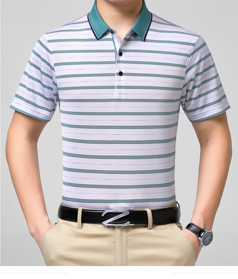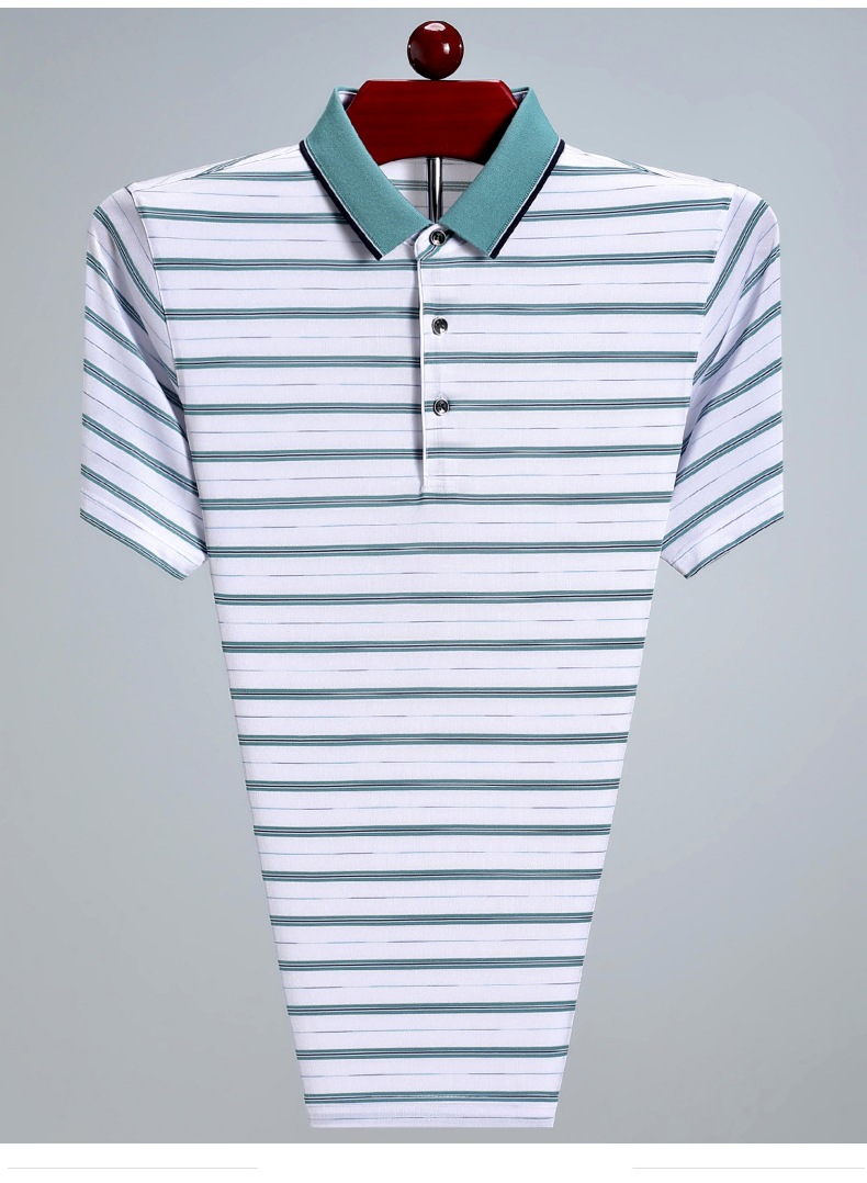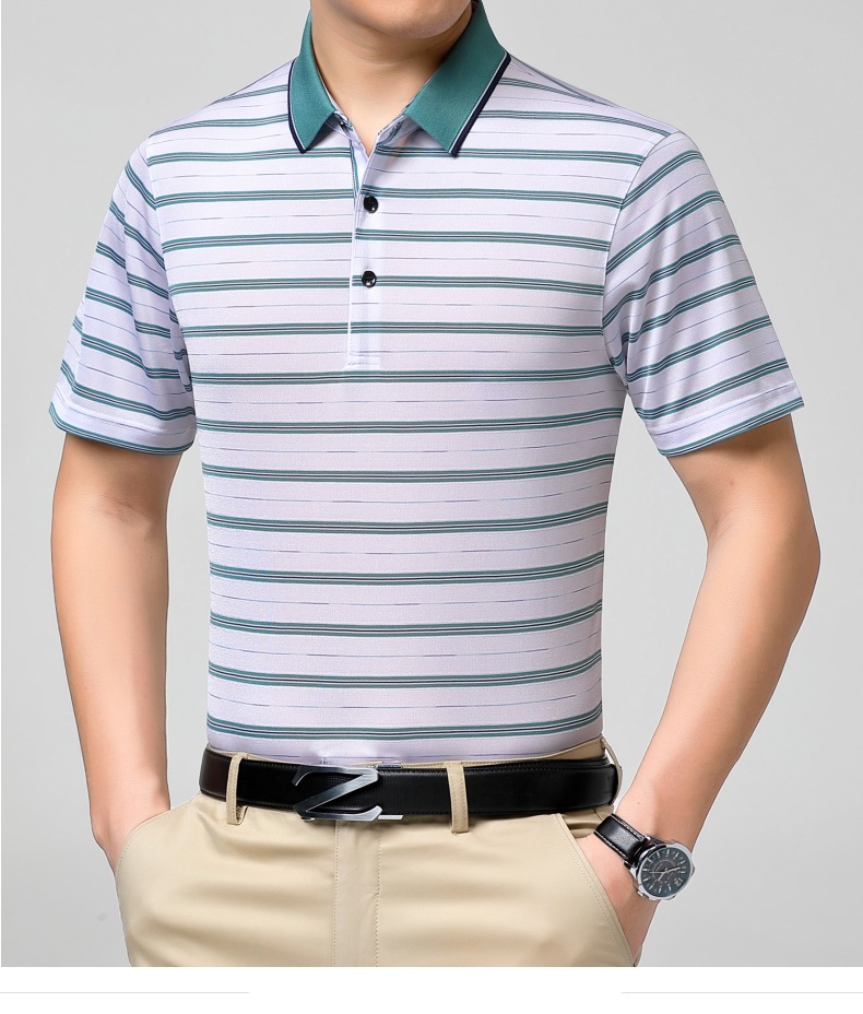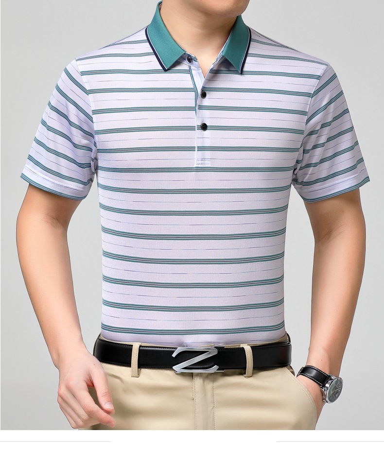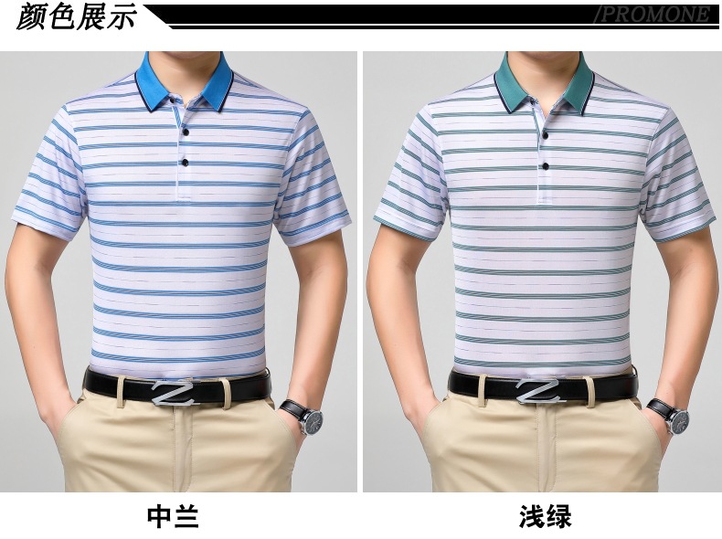 가벼운 고급 고급 남성 폴로 셔츠 여름 새로운 스타일 중년 및 노인 아빠의 실크 줄무늬 비즈니스 캐주얼 짧은 소매스토어 가기