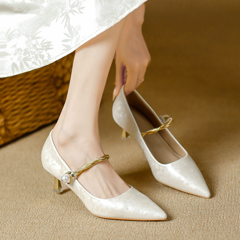 새틴 빈티지 청삼 여성 신발 2025 봄과 가을 새로운 중국 스타일 국가 스타일 하이힐 포인팅 발가락 단층 신발