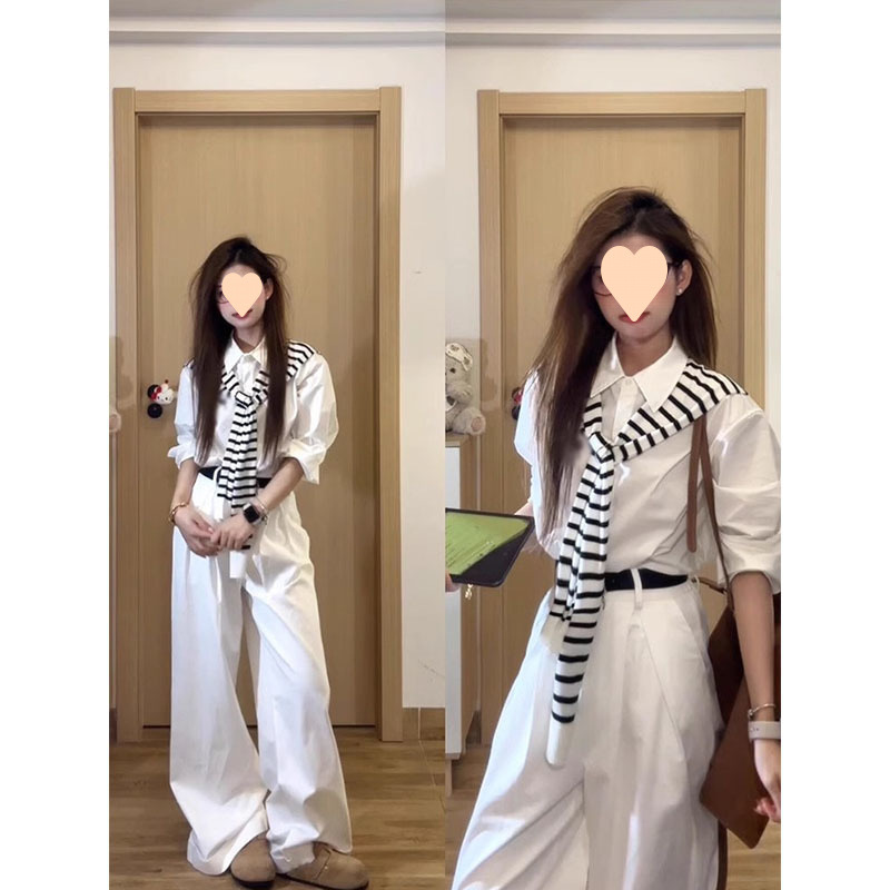 세 조각 세트 여성 2025 봄 한국 스타일 나이 줄이기 긴 소매 칼라 셔츠 줄무늬 목도리 높은 허리 슬리밍 넓은 다리 바지스토어 가기
