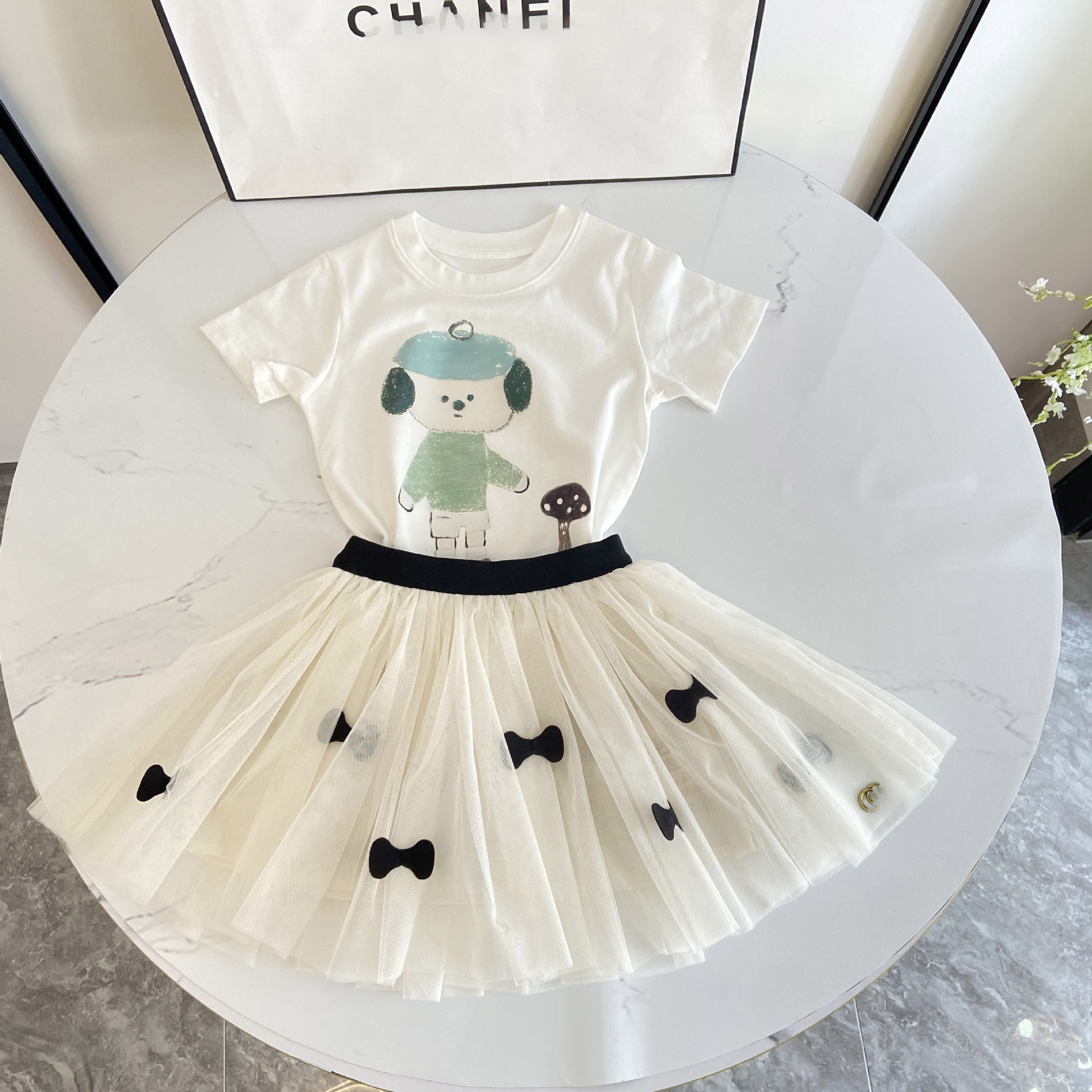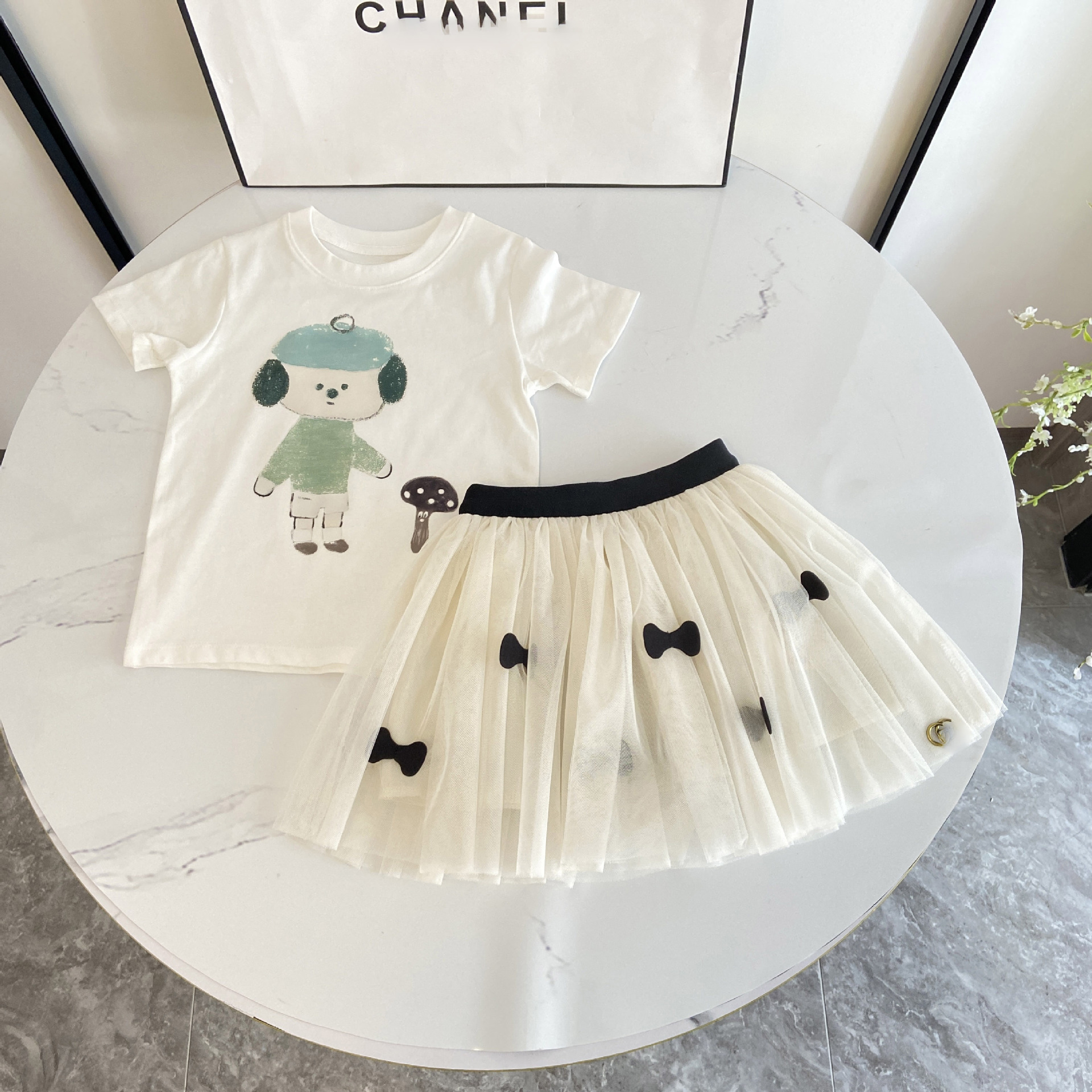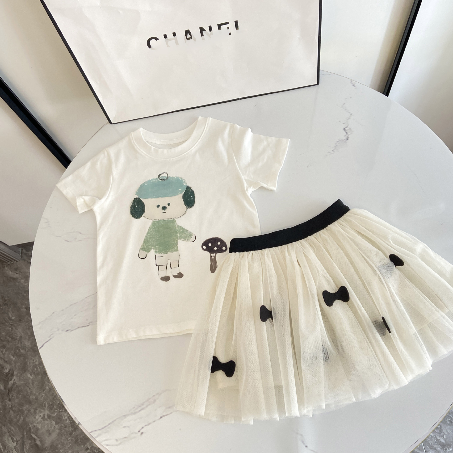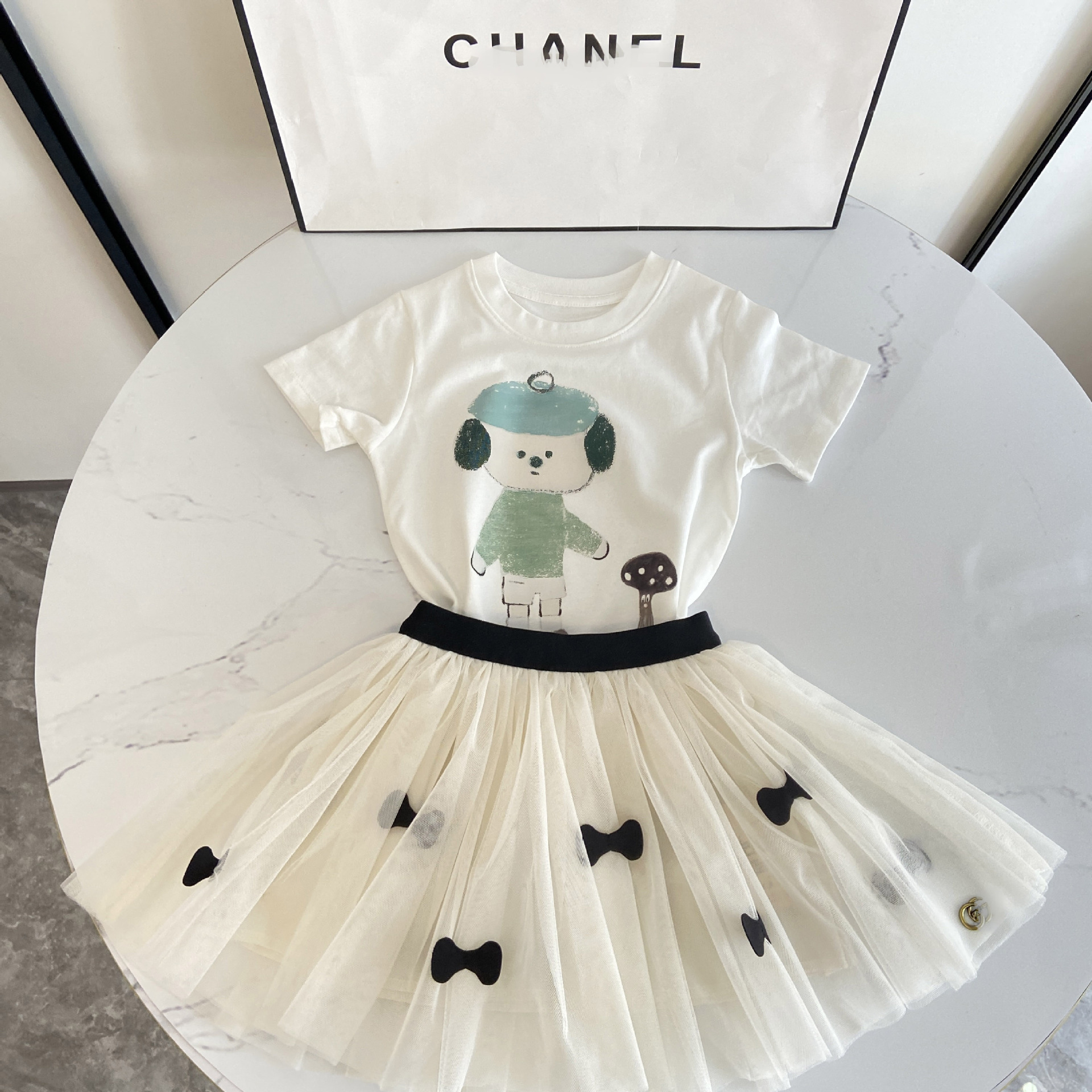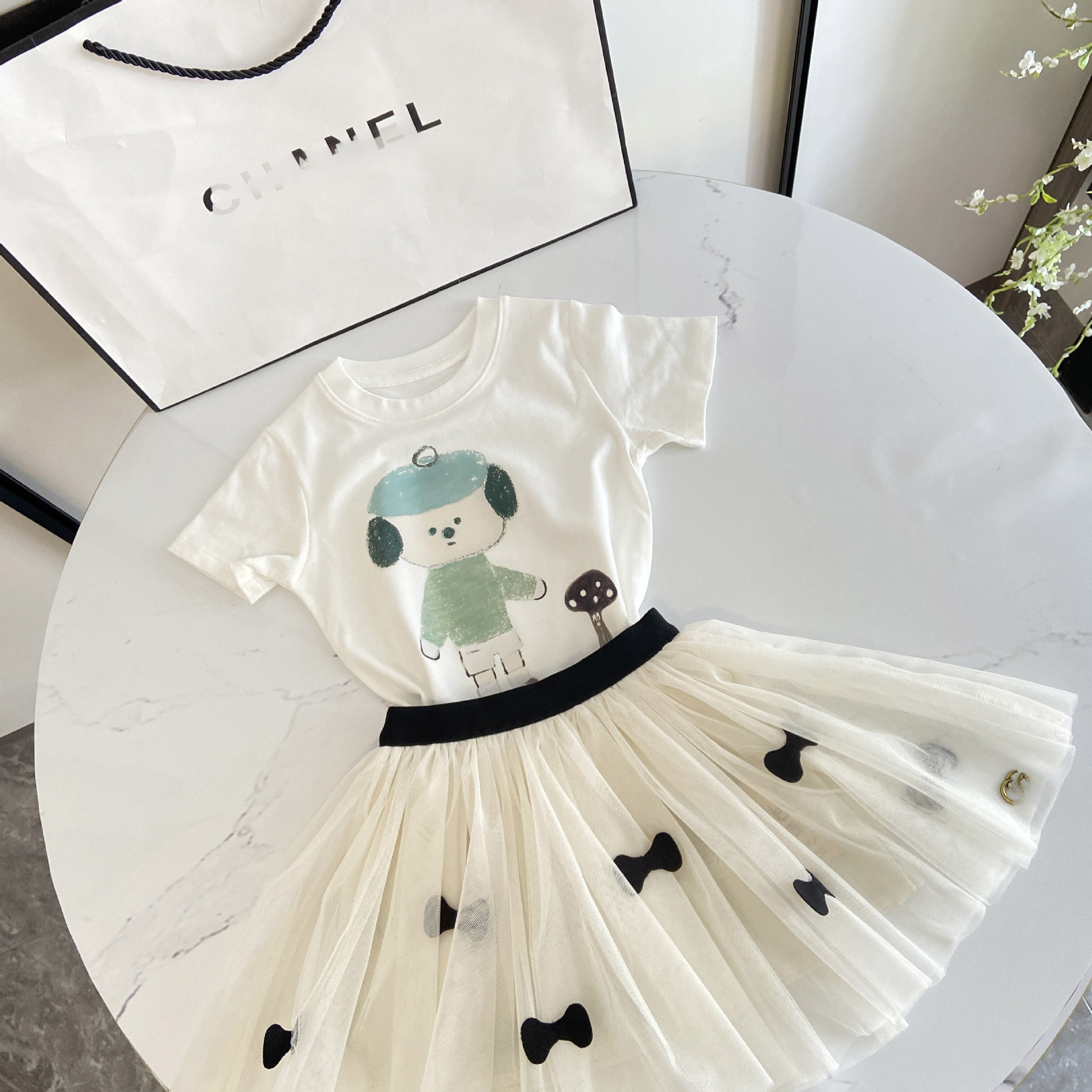 2025 여아 화이트 인형 티셔츠 + 화이트 하프 길이 거즈 스커트, 패셔너블한 코튼 티셔츠 반팔 탑, 투투 스커트, 공주 스타일스토어 가기