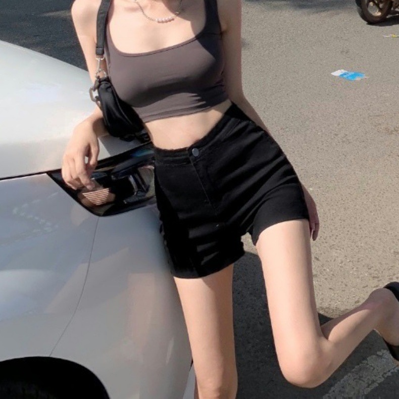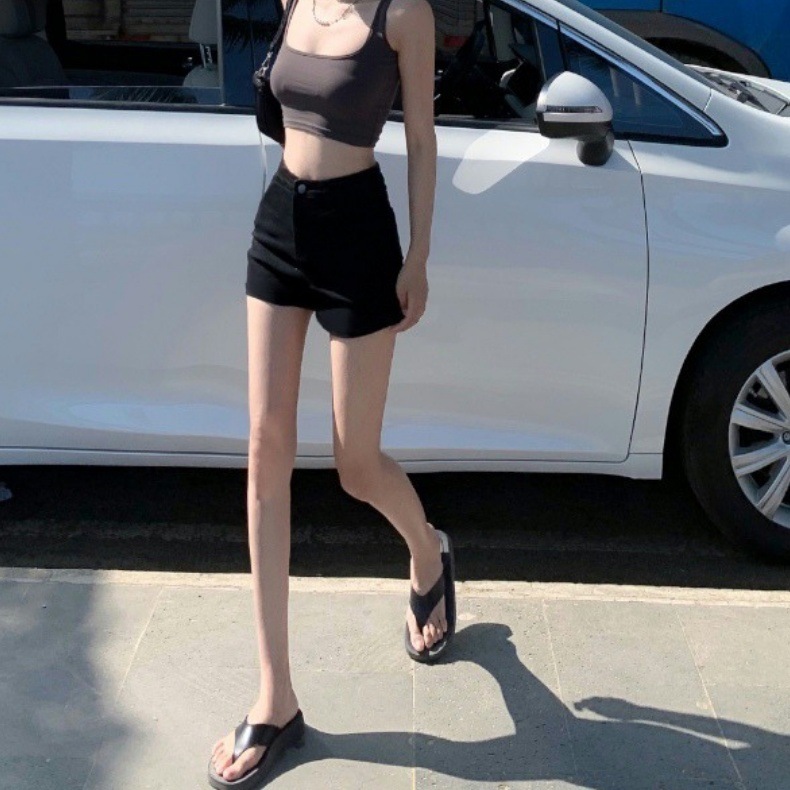 검은 색 높은 허리 스트레치 데님 반바지 여성의 2025 새로운 슬림 모양 뜨거운 바지 봄과 여름
