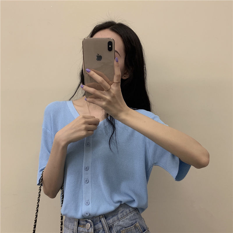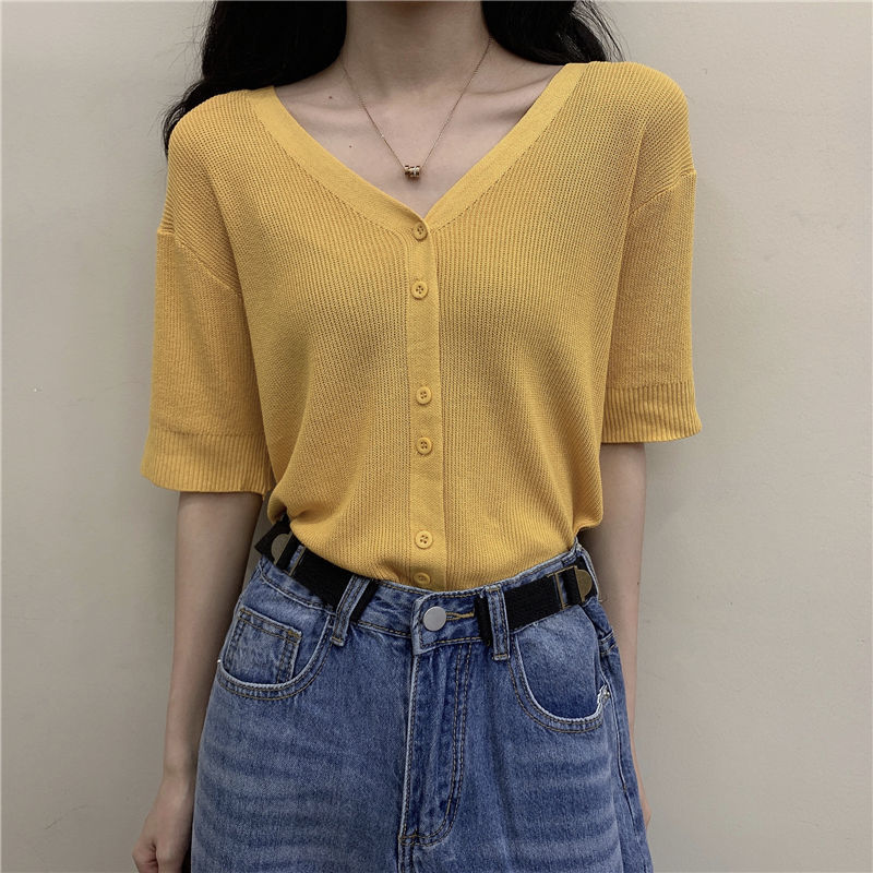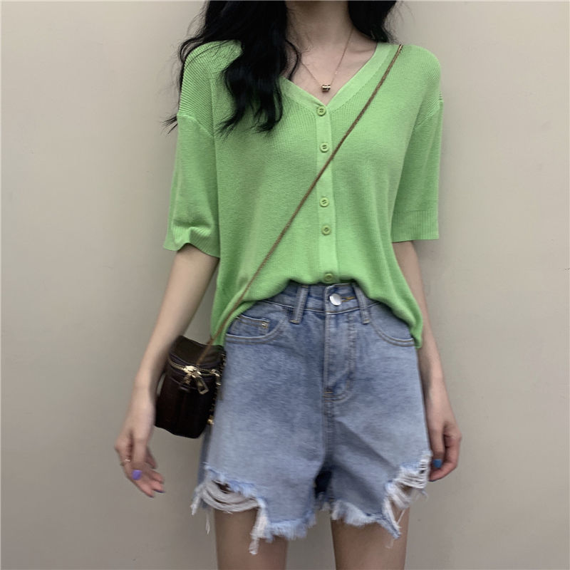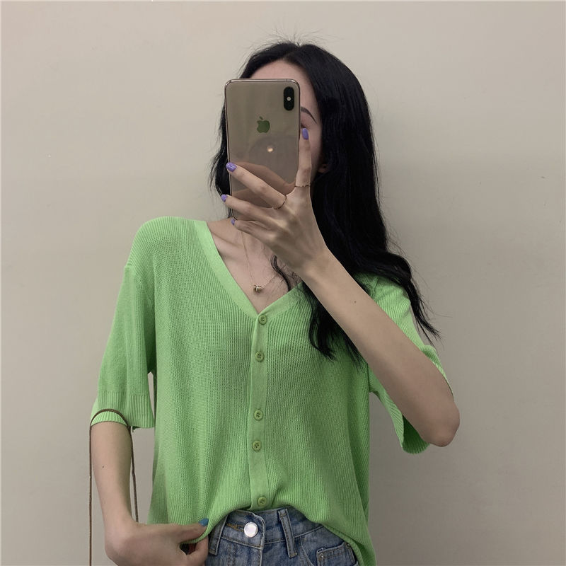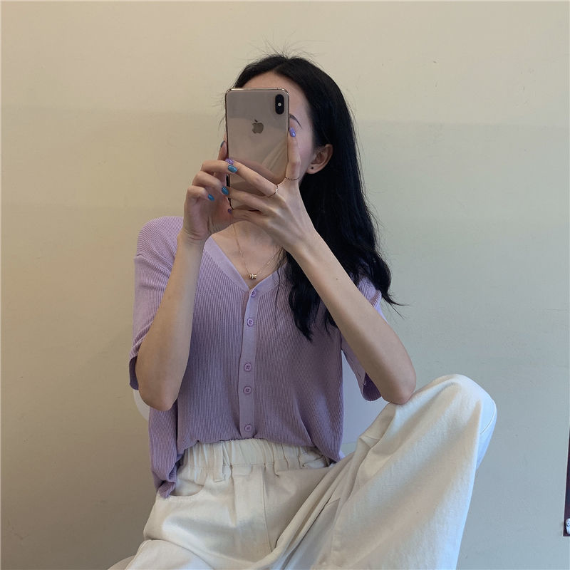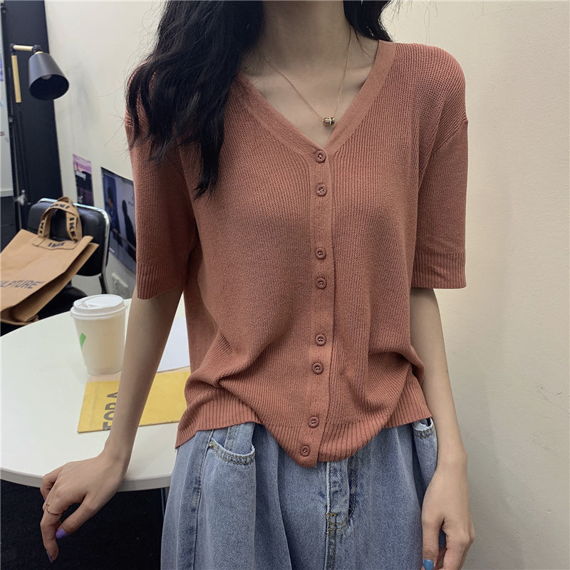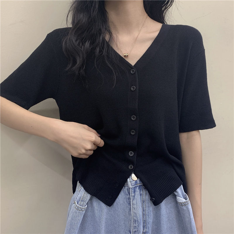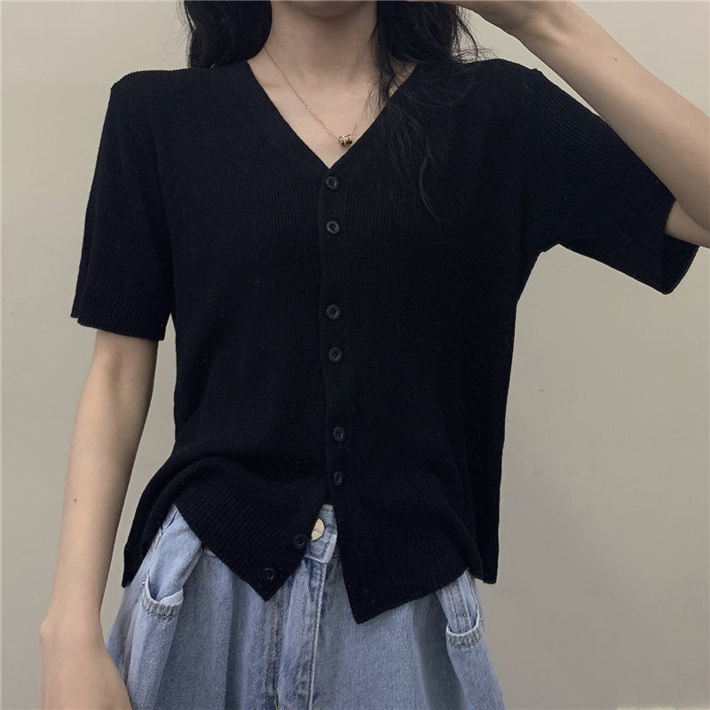 V 넥 탑 여성 봄과 여름 2025 새로운 빈티지 부드러운 얇은 아이스 실크 짧은 소매 블랙 짧은 bm 니트 카디건스토어 가기