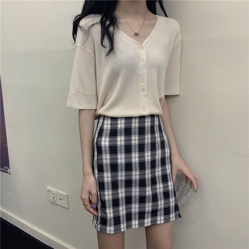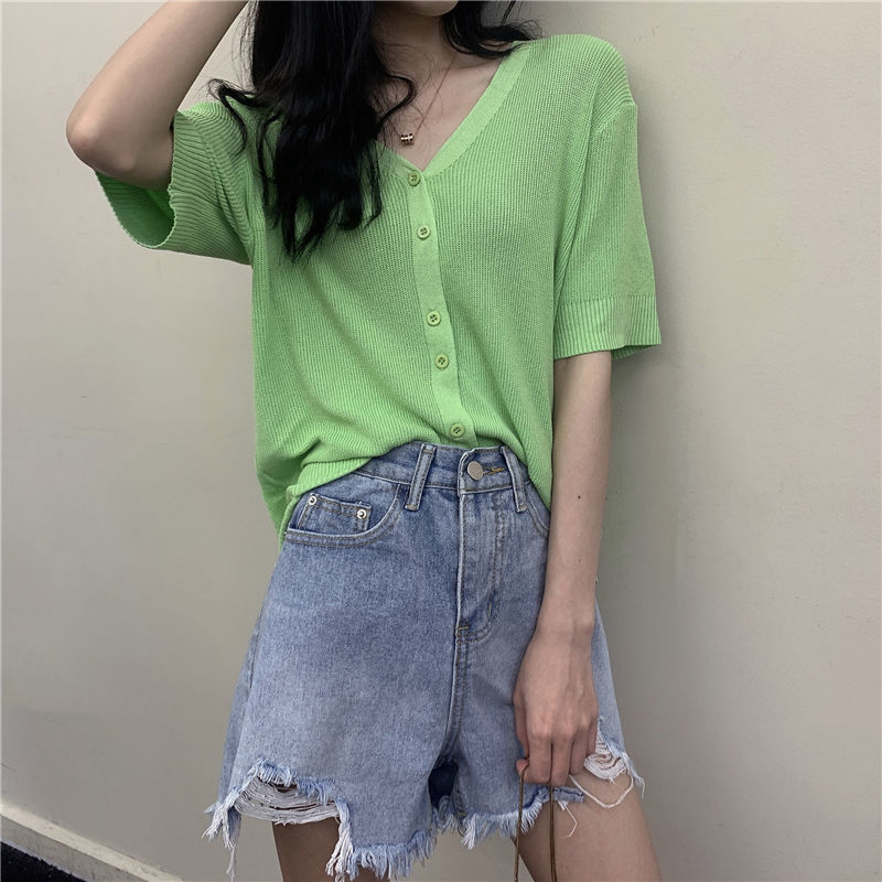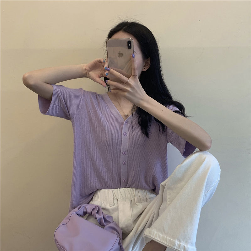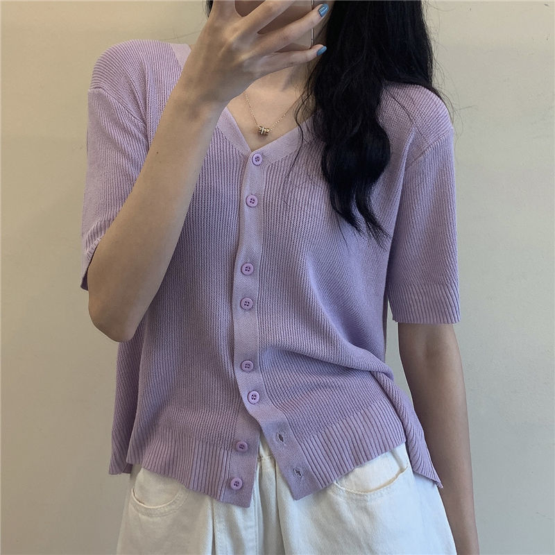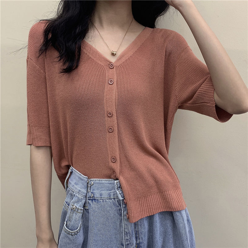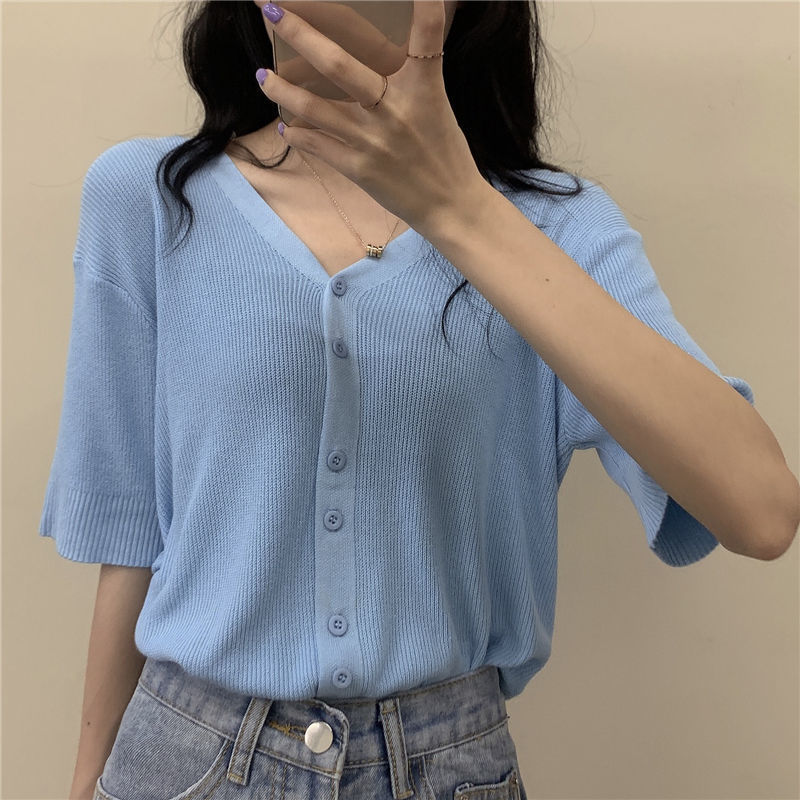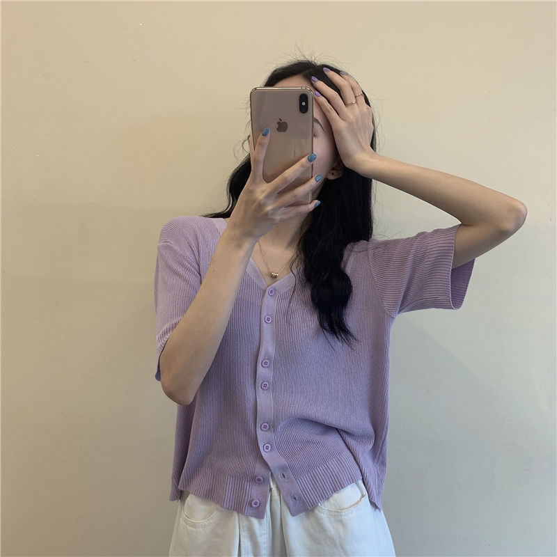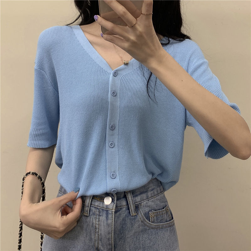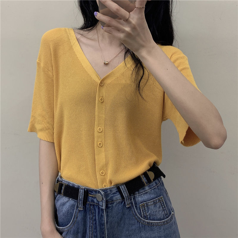 V 넥 탑 여성 봄과 여름 2025 새로운 빈티지 부드러운 얇은 아이스 실크 짧은 소매 블랙 짧은 bm 니트 카디건스토어 가기