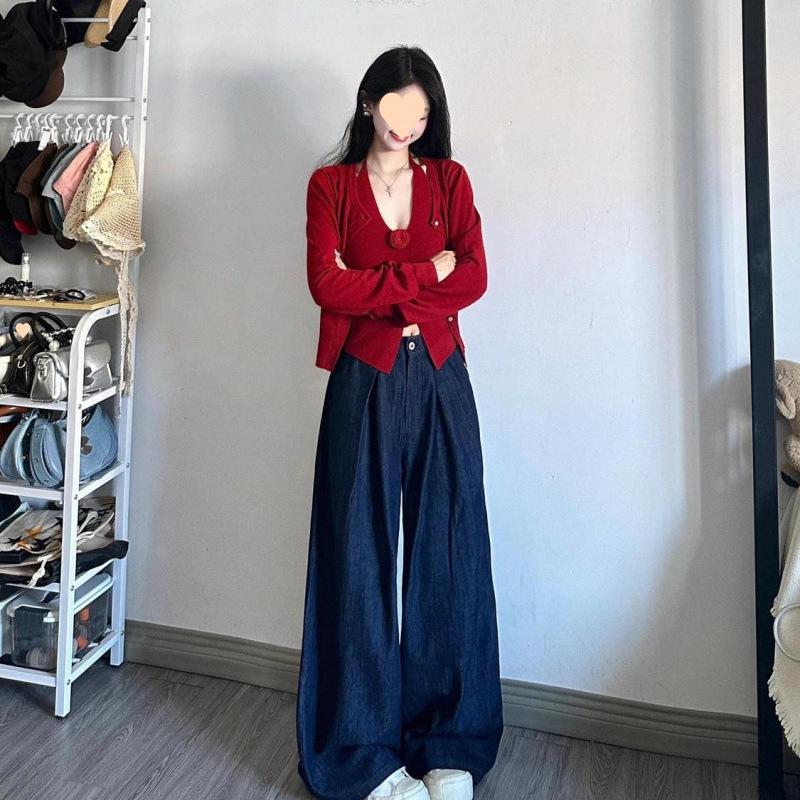 빨간 긴팔 니트 카디건 여성용 3 피스 세트 2025 봄 새로운 게으른 스타일 짧은 얇은 스웨터 재킷스토어 가기