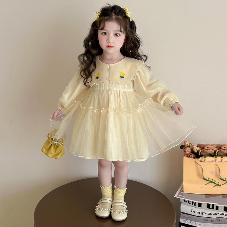 여아 원피스 봄 가을 2025 신상 한국 스타일 아동복 세련된 긴팔 인형 칼라 여자아이 망사 드레스스토어 가기