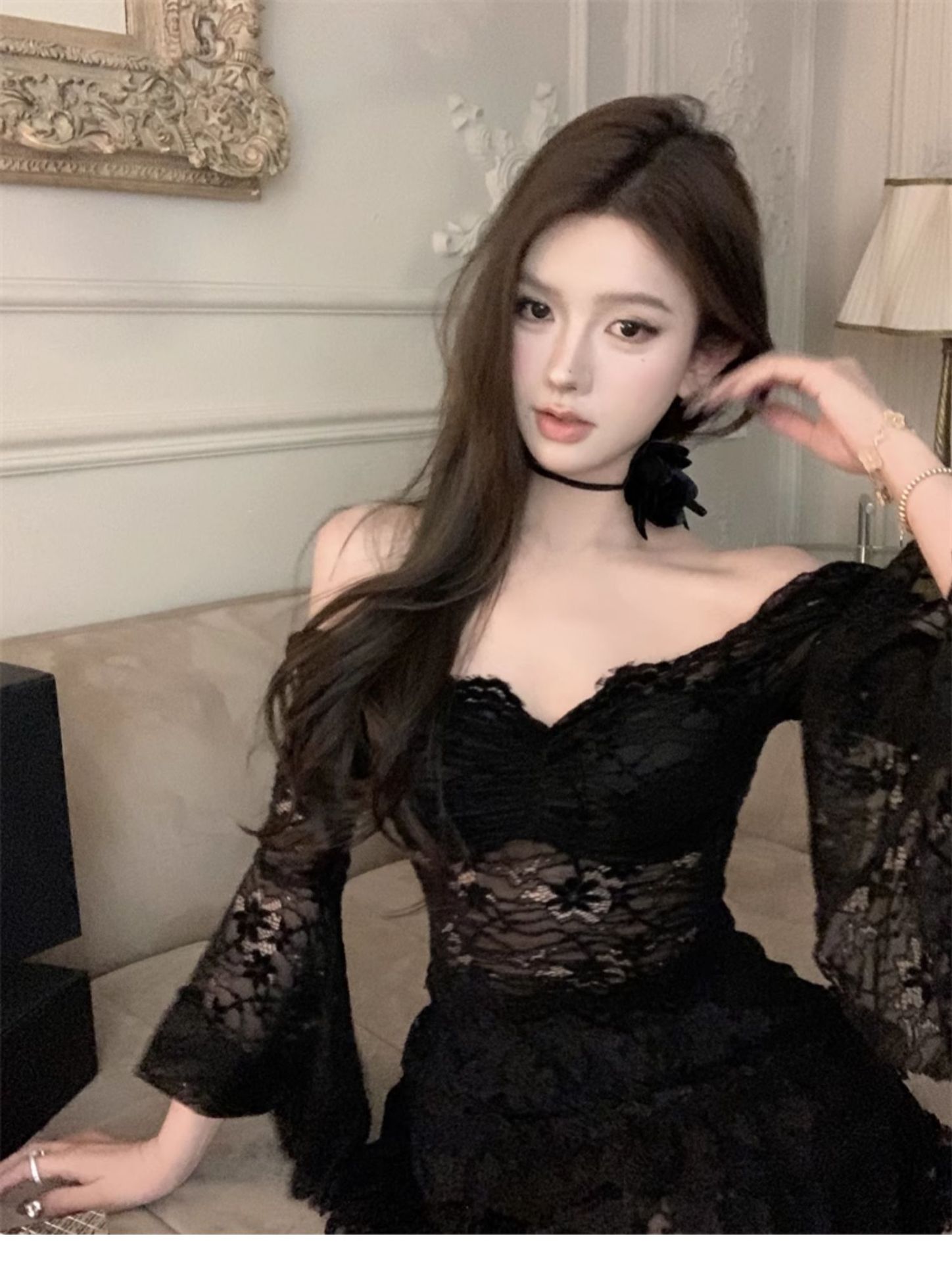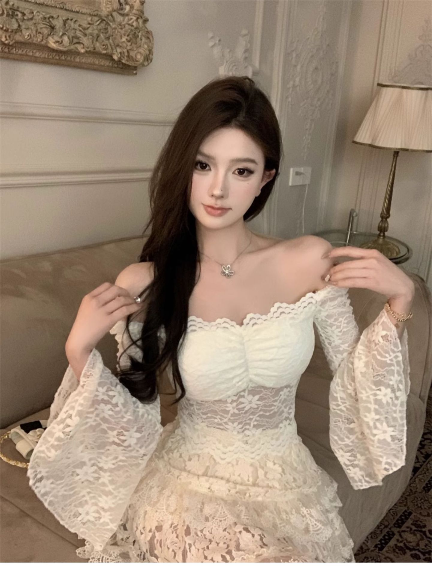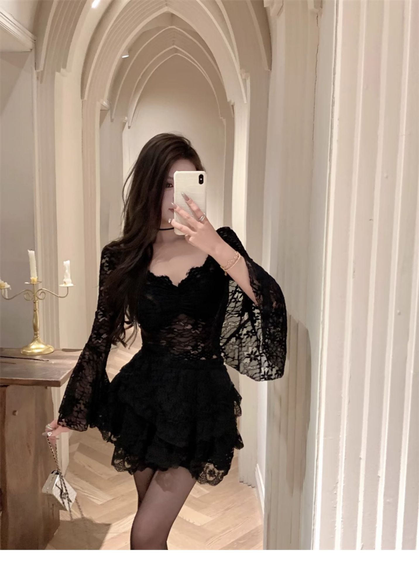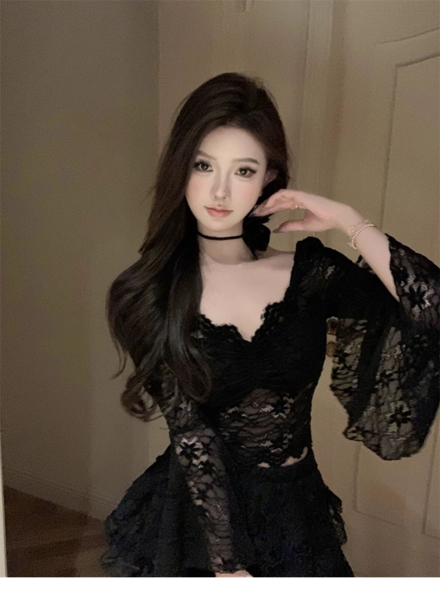 봄 순수한 욕망 트럼펫 소매 타이트 허리 슬리밍 자족 가슴 패드 그림 배꼽 짧은 레이스 탑베이스 셔츠