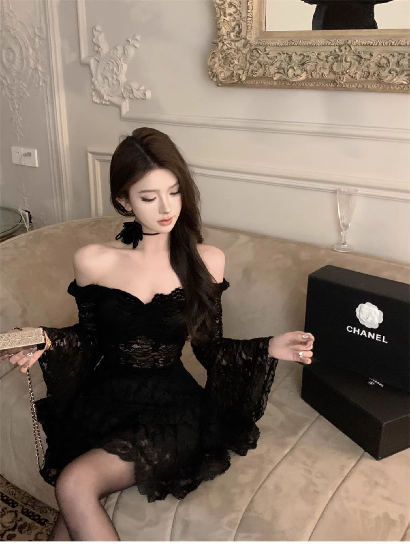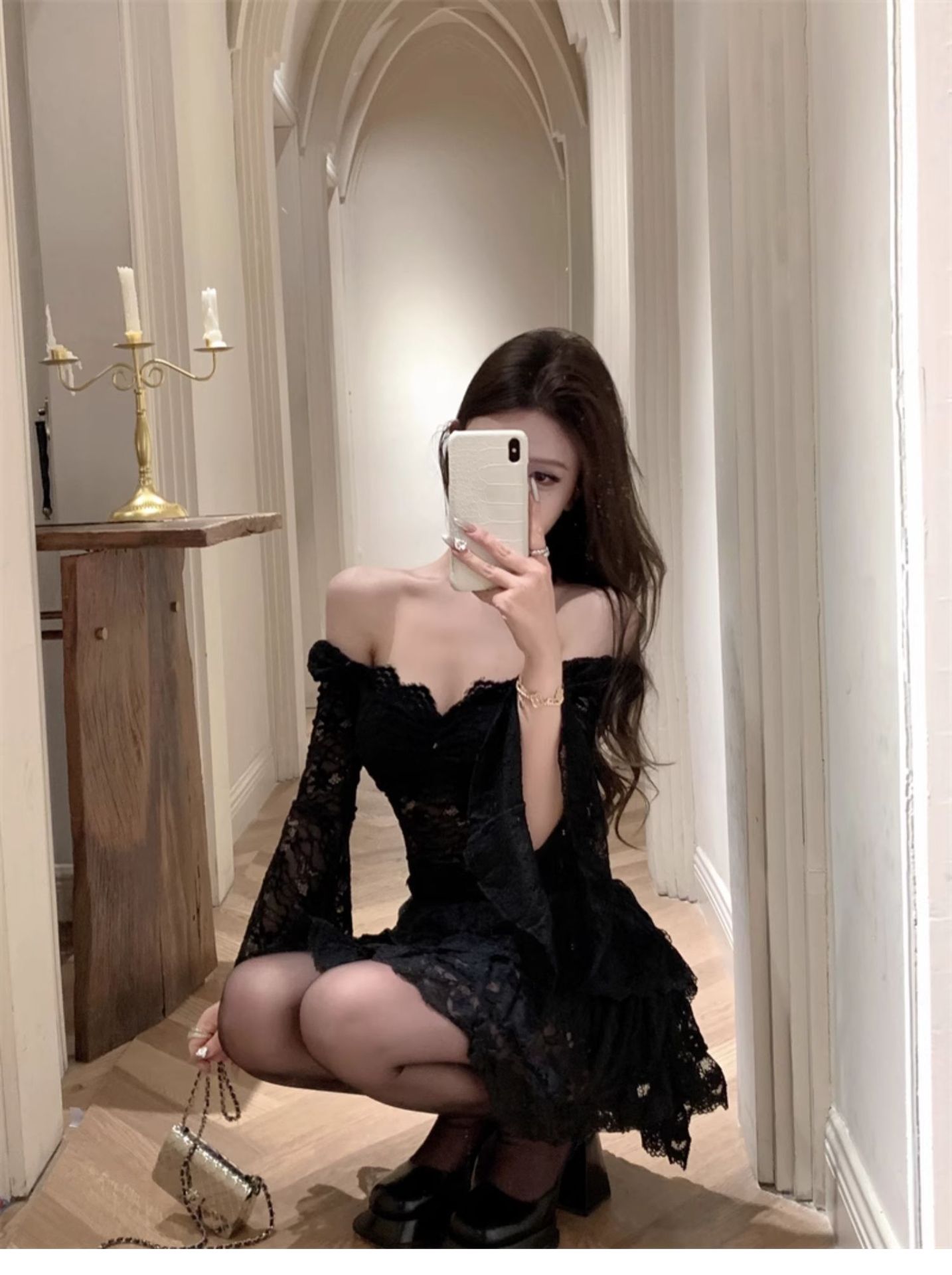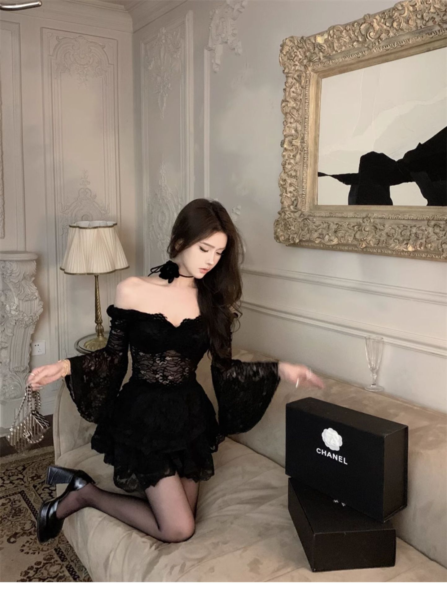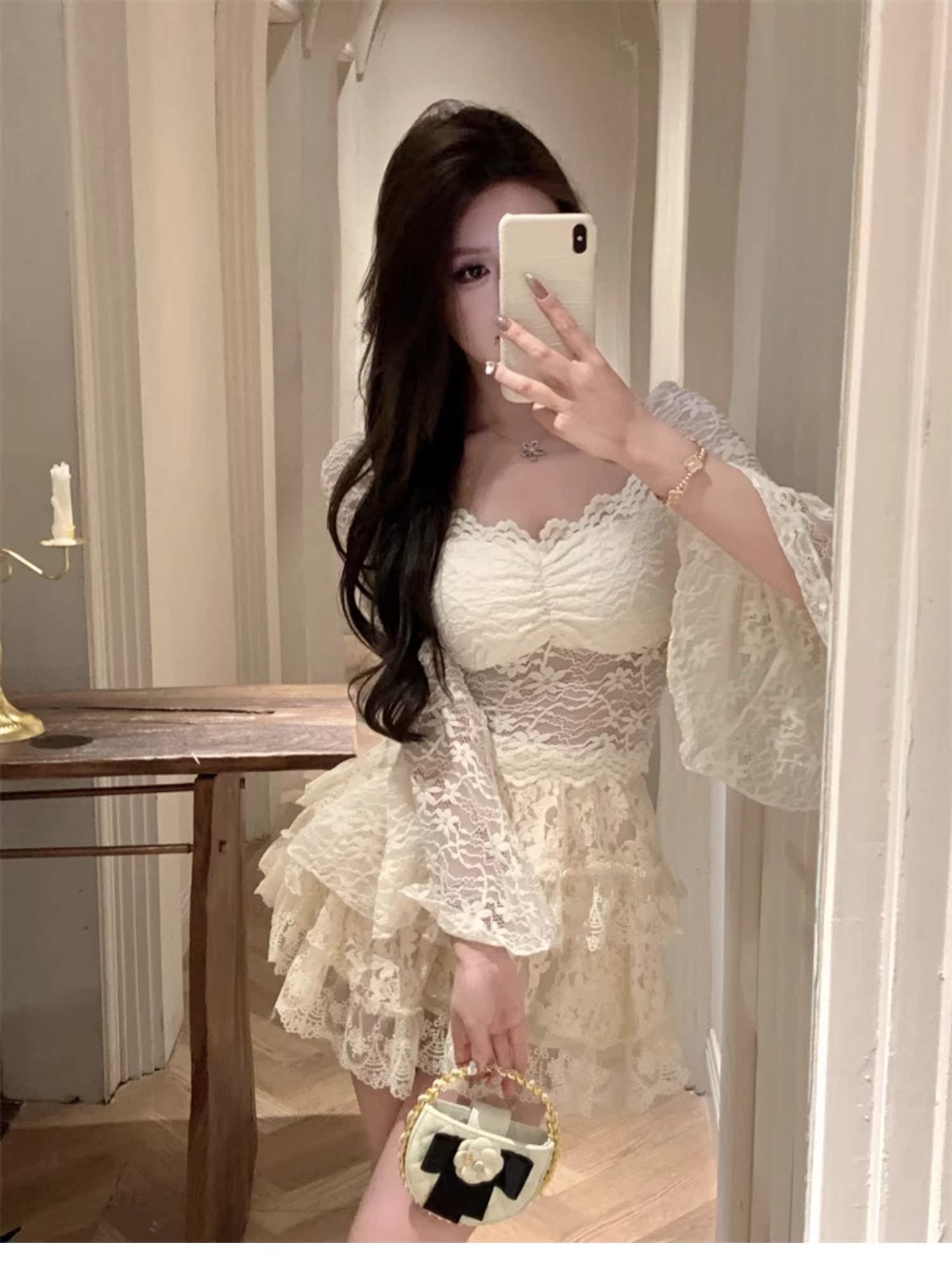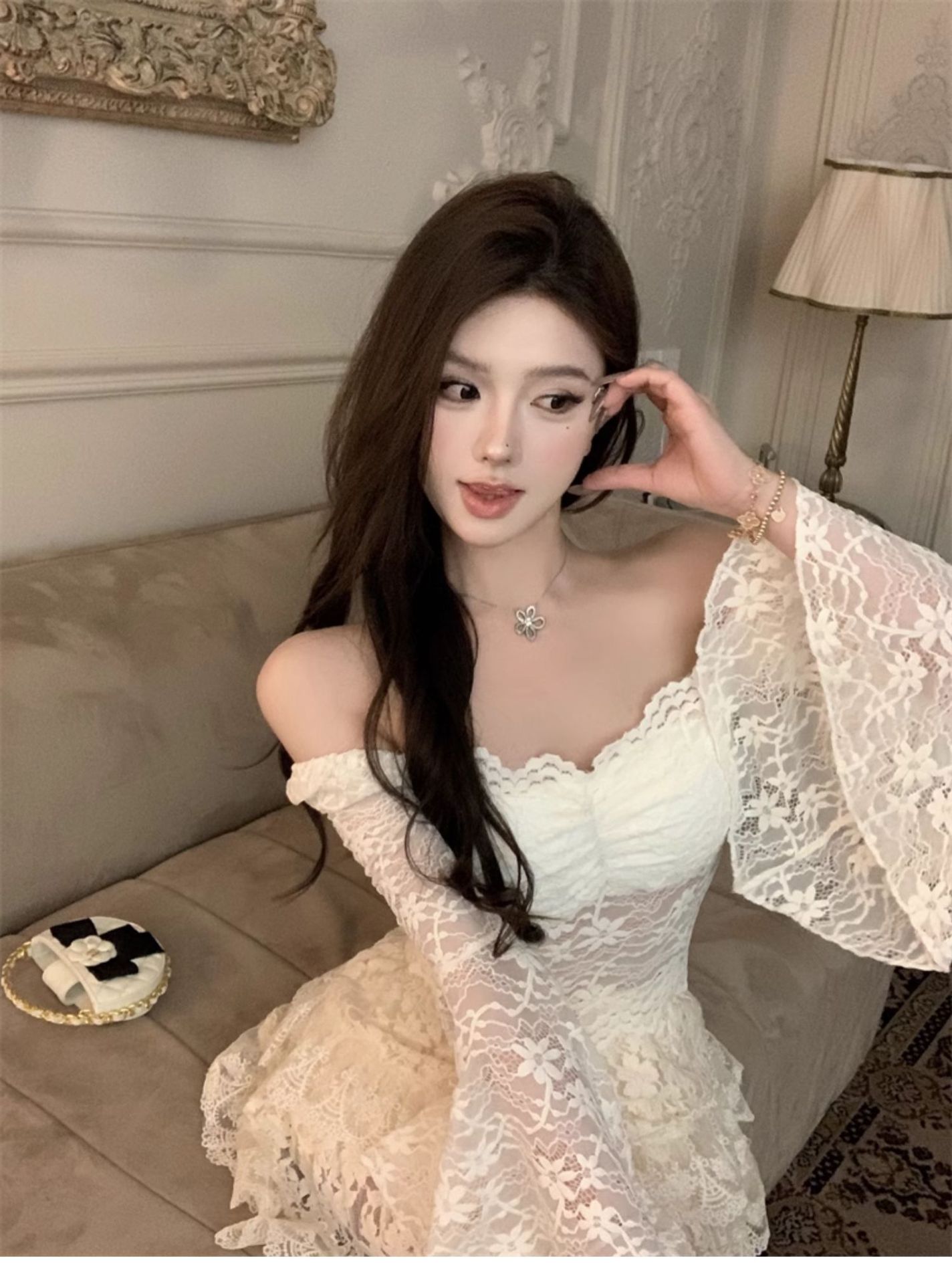 봄 순수한 욕망 트럼펫 소매 타이트 허리 슬리밍 자족 가슴 패드 그림 배꼽 짧은 레이스 탑베이스 셔츠