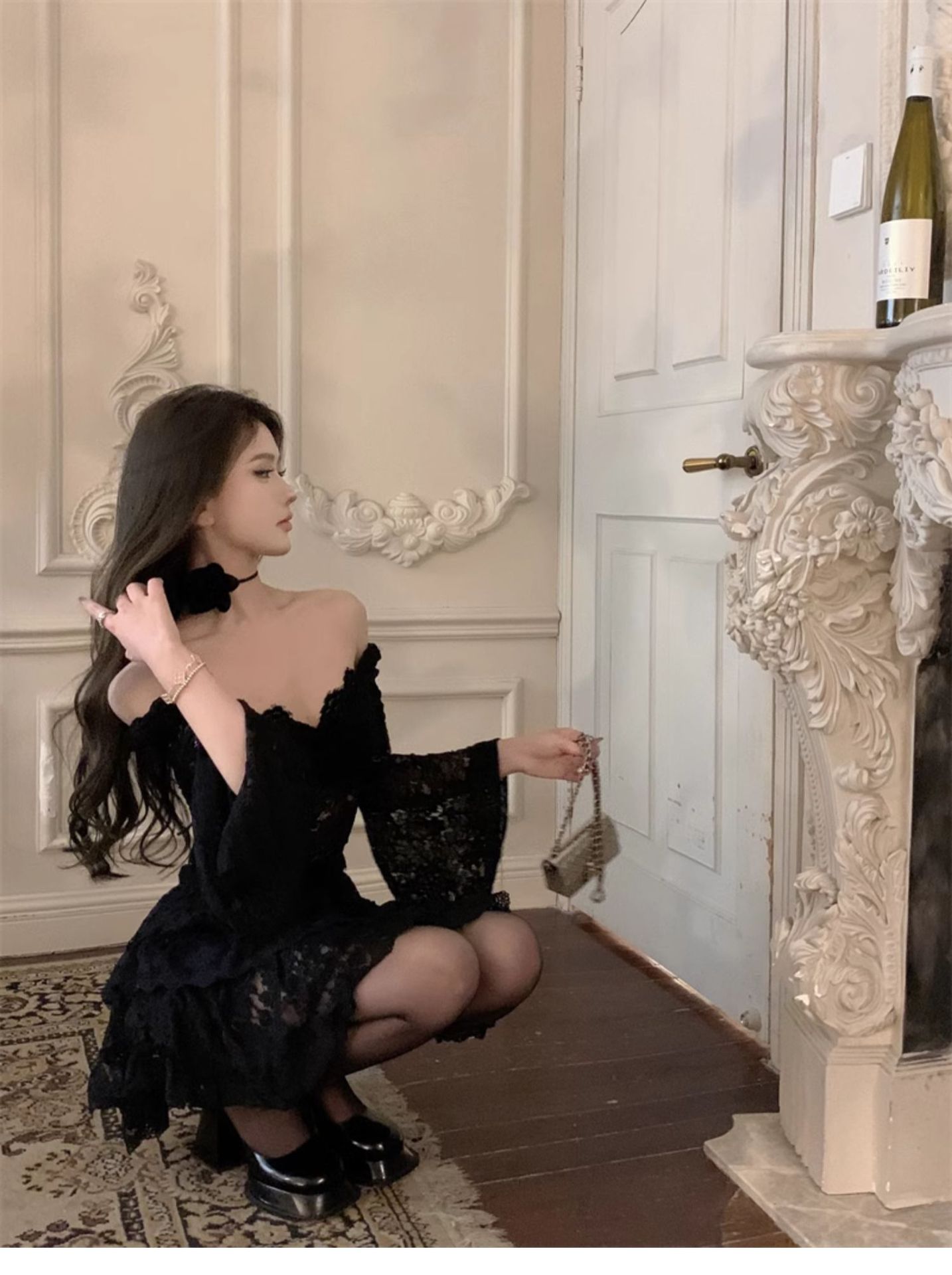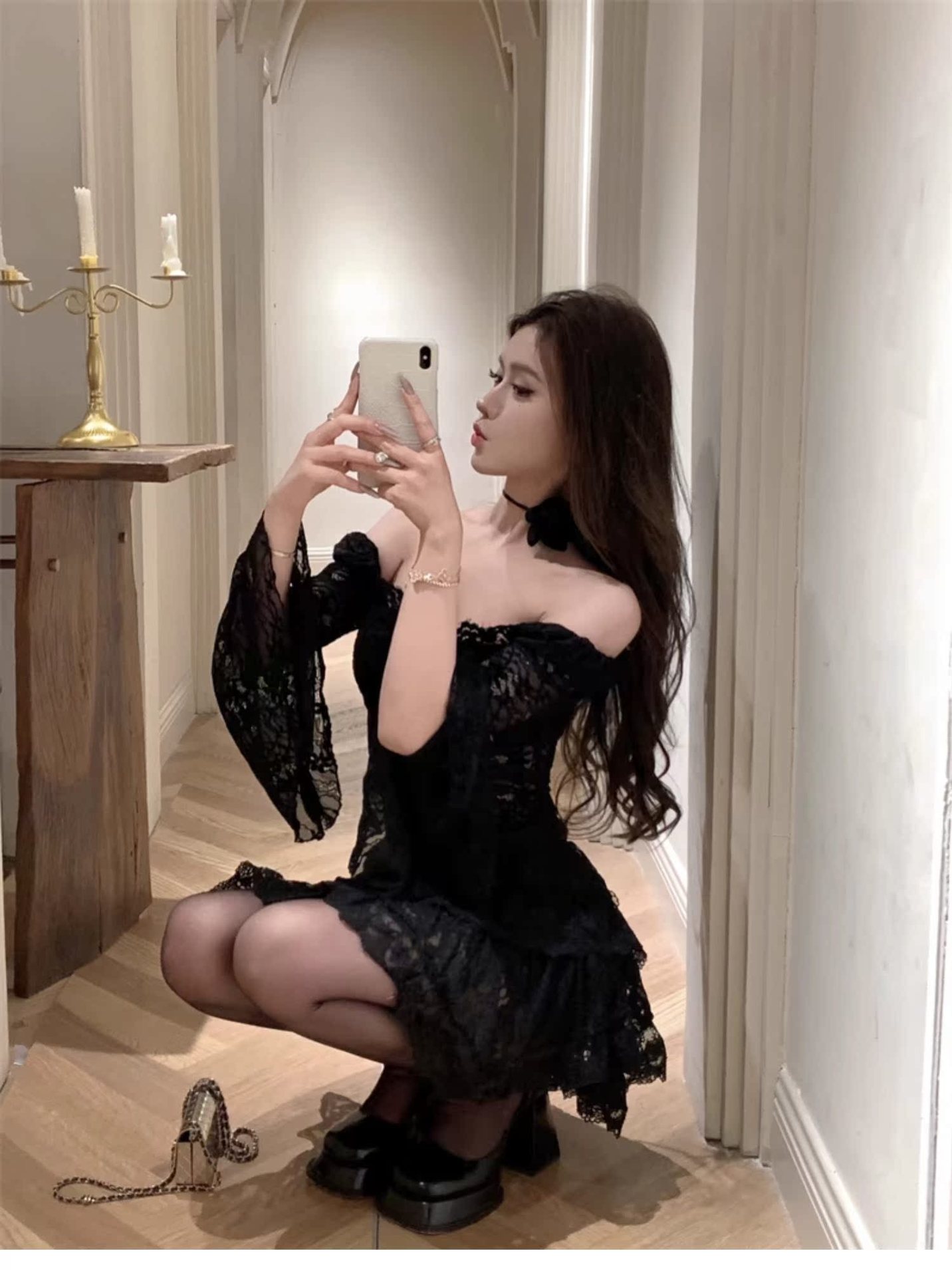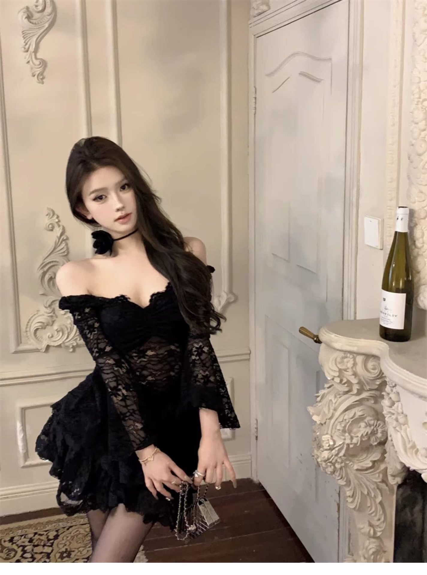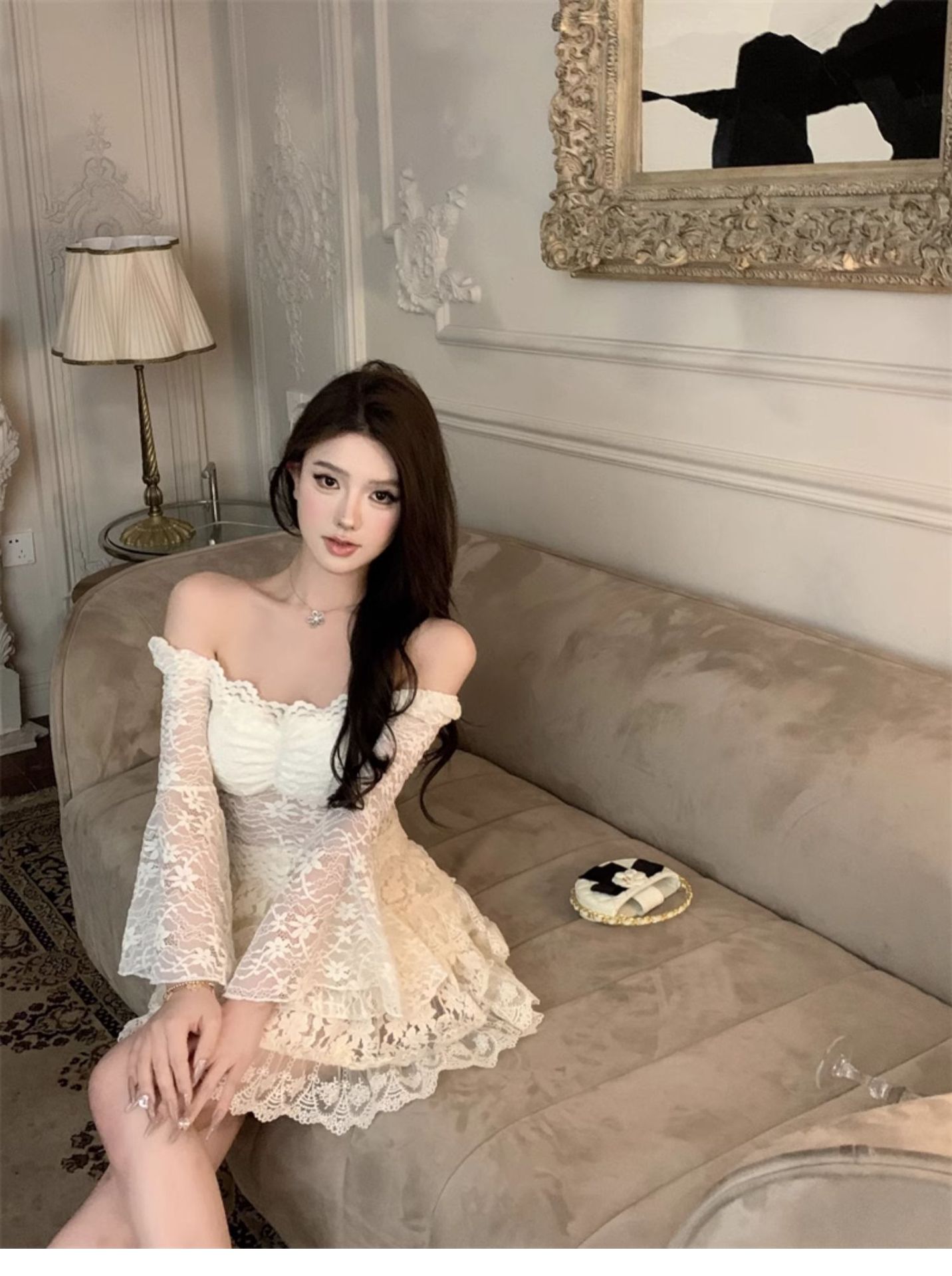 봄 순수한 욕망 트럼펫 소매 타이트 허리 슬리밍 자족 가슴 패드 그림 배꼽 짧은 레이스 탑베이스 셔츠
