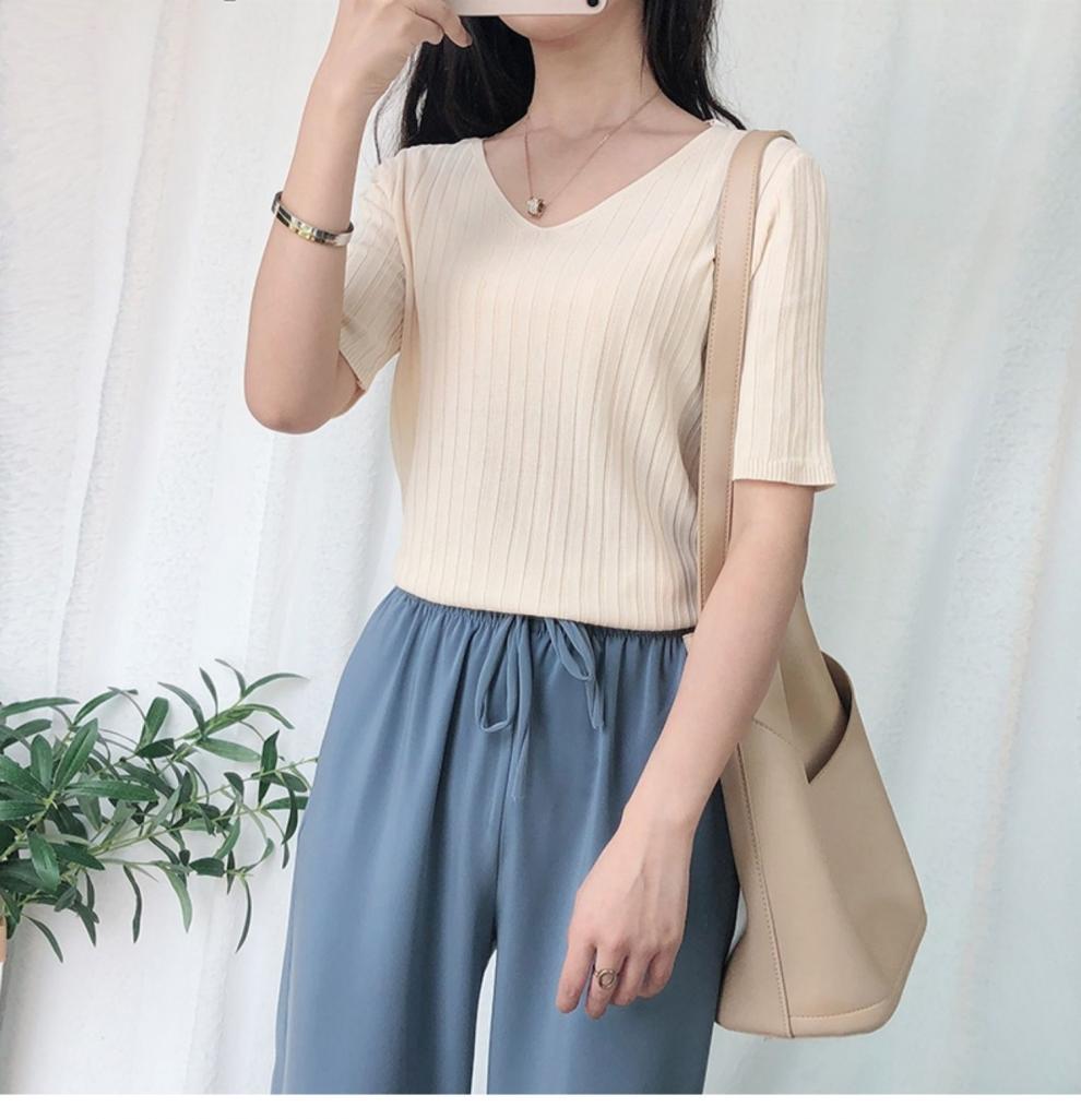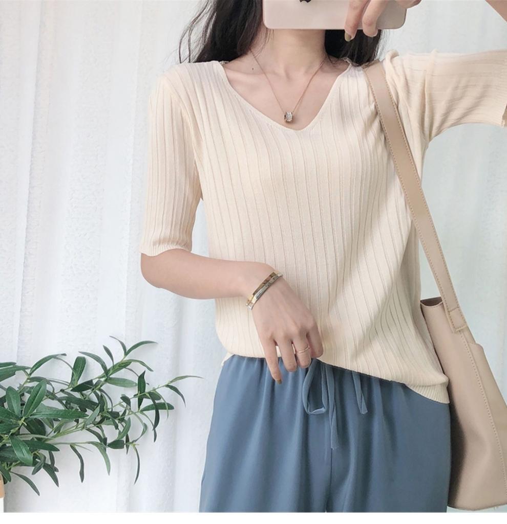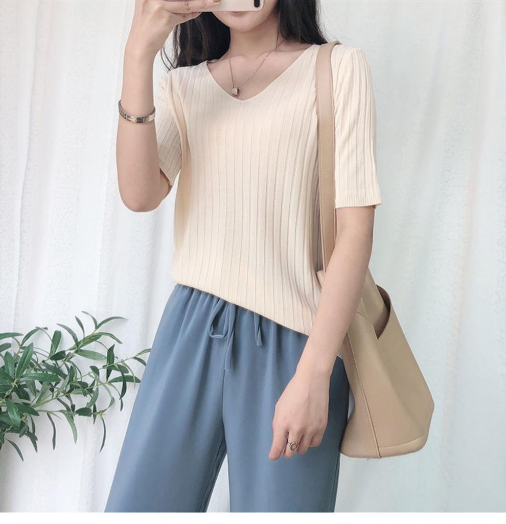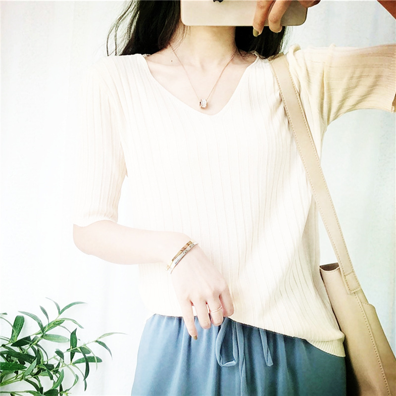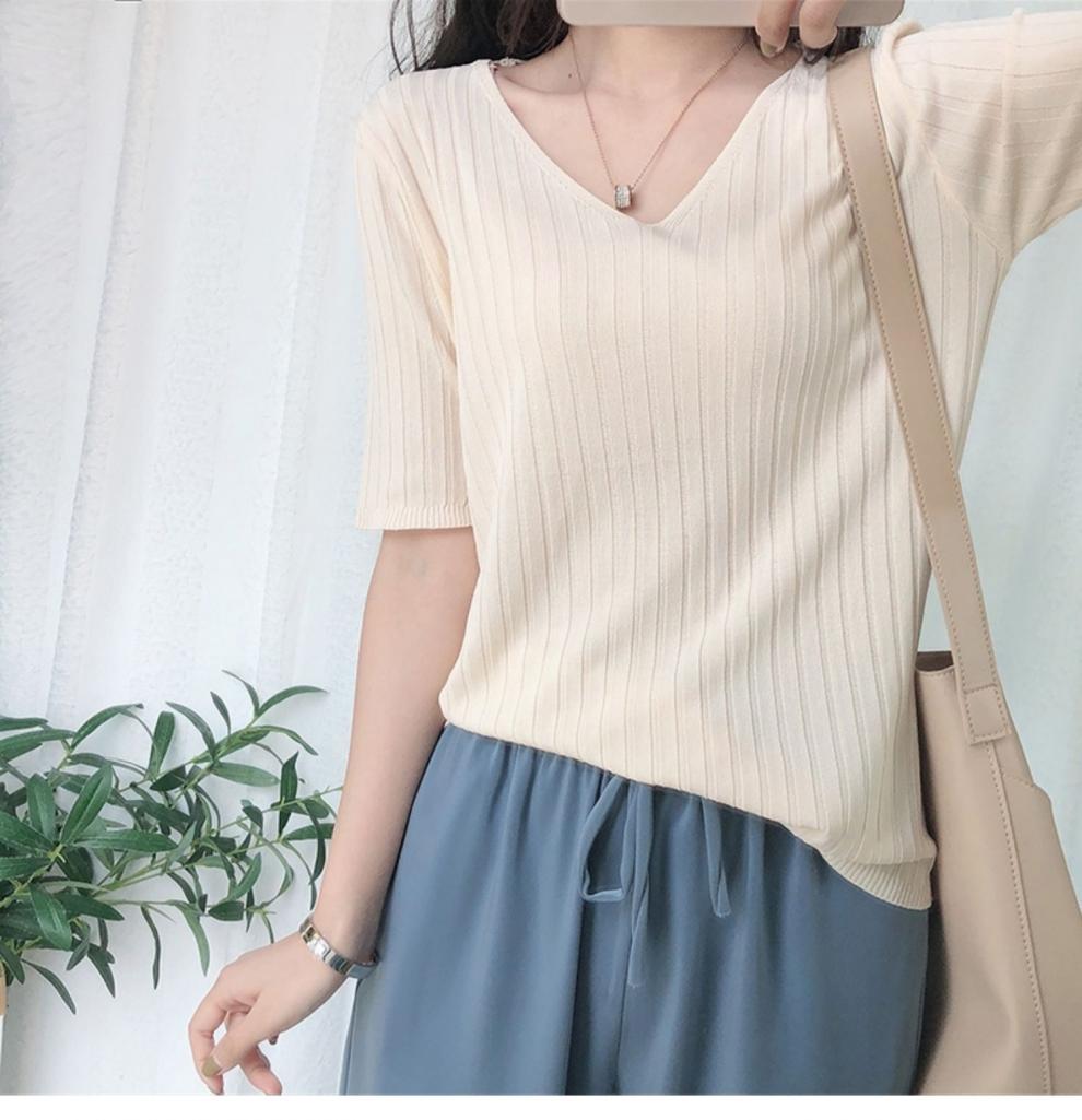 2025 년 여름 새로운 니트 아이스 실크 쿨 V 넥 반팔 티셔츠 여성용 얇은 화이트 올 매치 루즈 탑스토어 가기