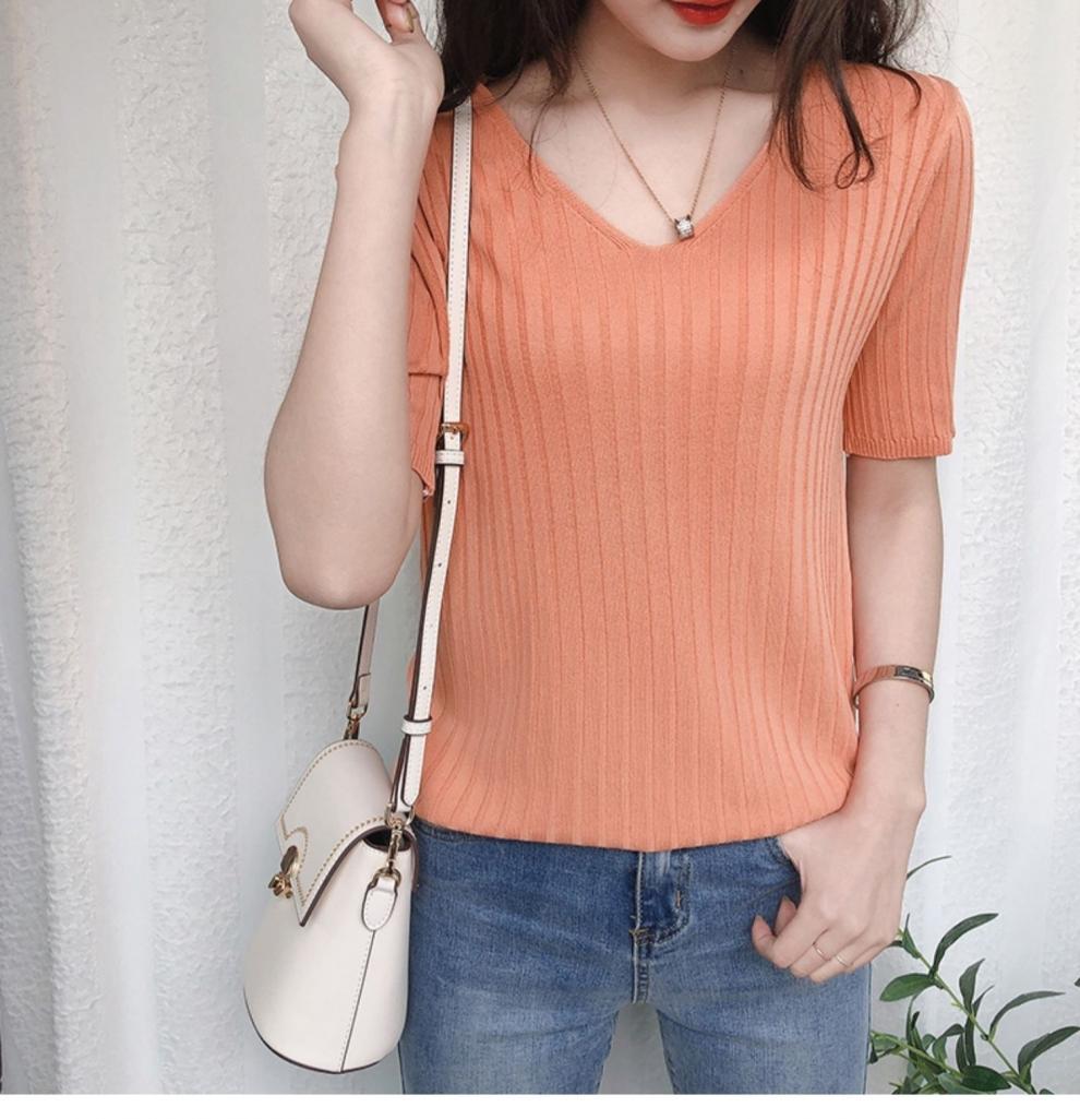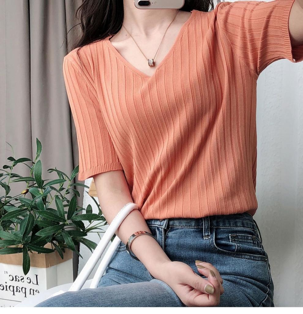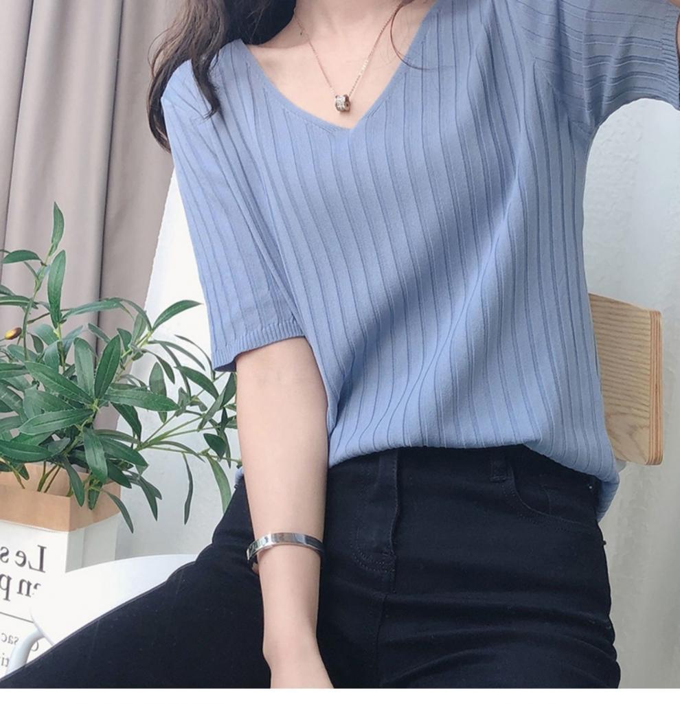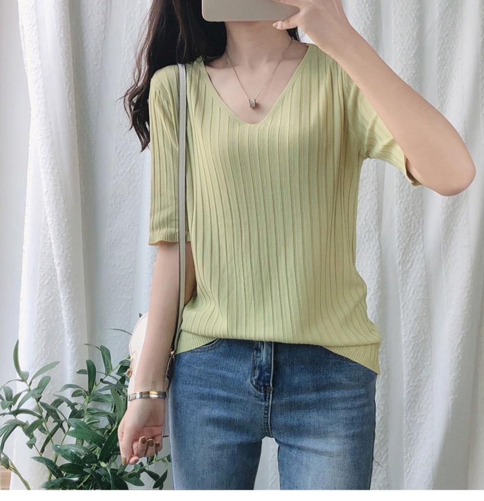 2025 년 여름 새로운 니트 아이스 실크 쿨 V 넥 반팔 티셔츠 여성용 얇은 화이트 올 매치 루즈 탑스토어 가기