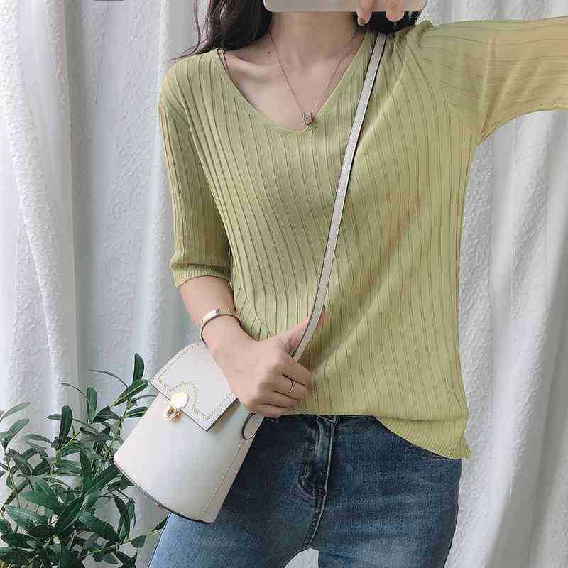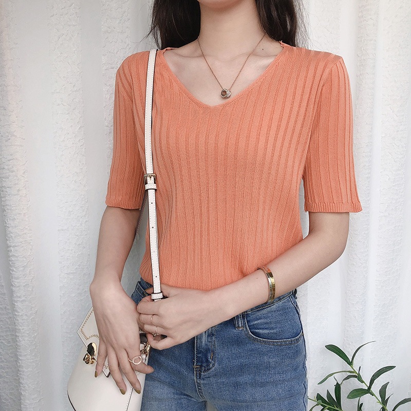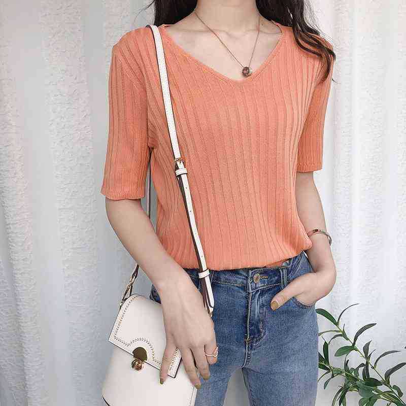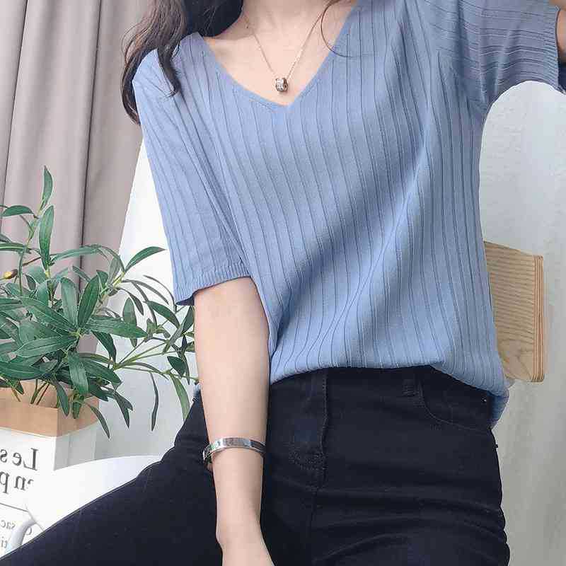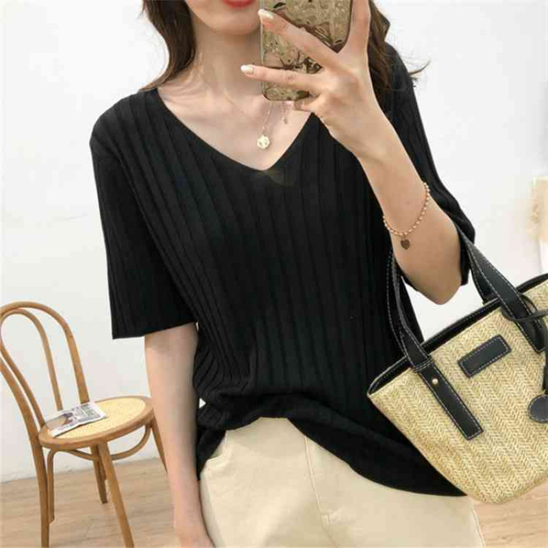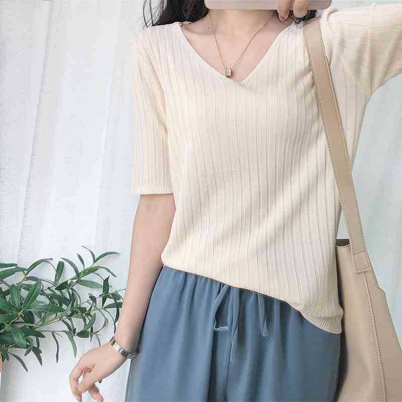 2025 년 여름 새로운 니트 아이스 실크 쿨 V 넥 반팔 티셔츠 여성용 얇은 화이트 올 매치 루즈 탑