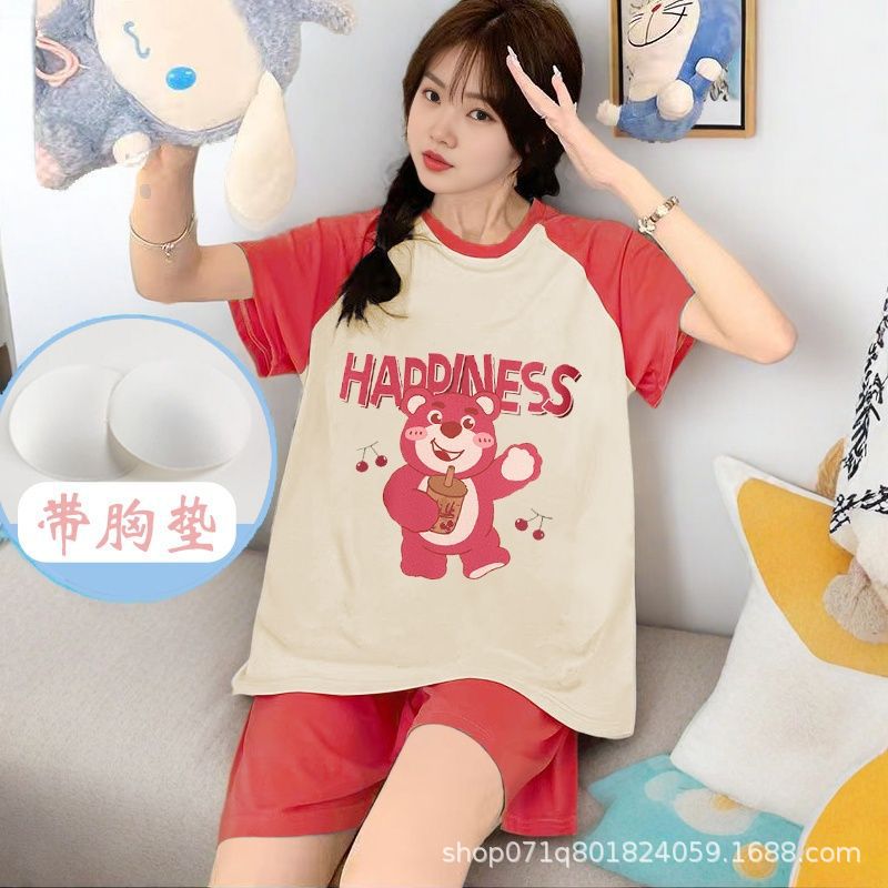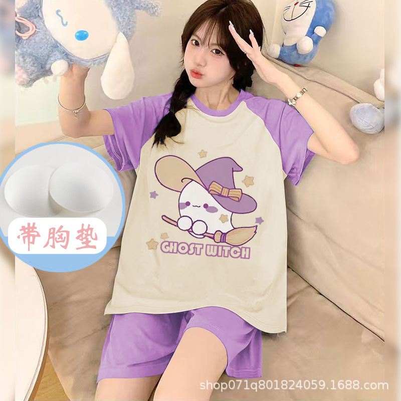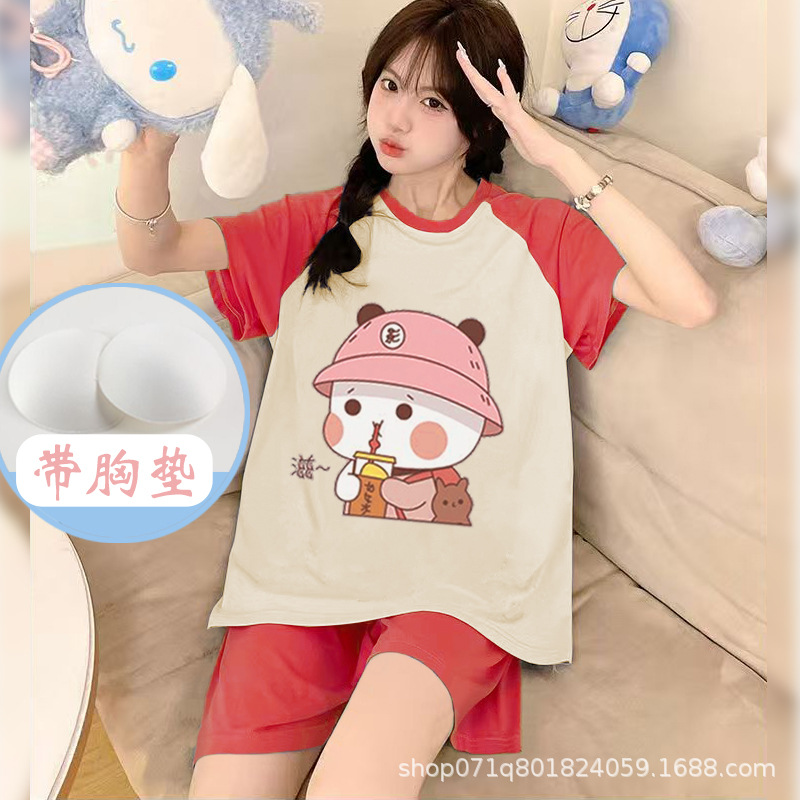 둥근 목 플러스 가슴 패드 잠옷 여성의 여름 2025 만화 반팔 반바지 느슨한 얇은 학생 홈 의류 세트스토어 가기