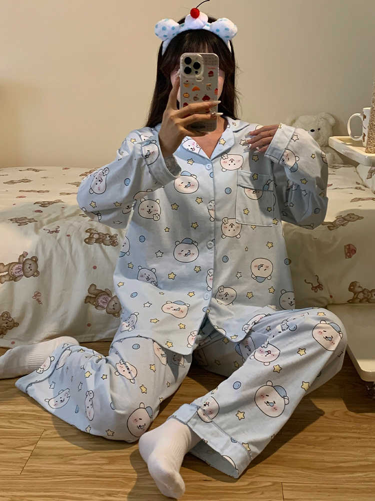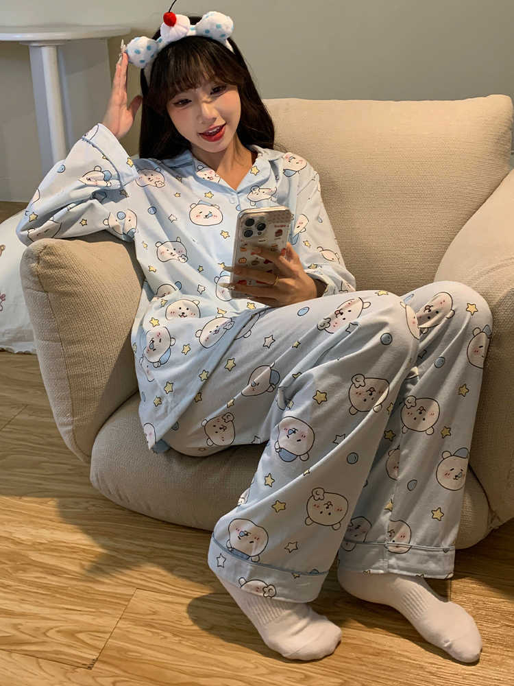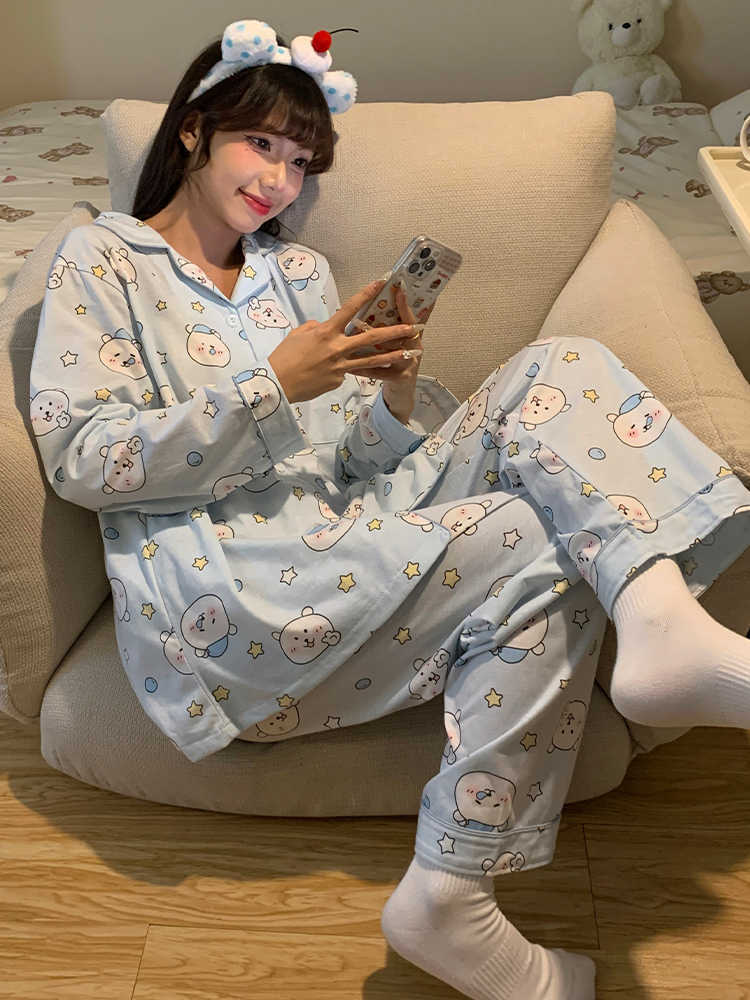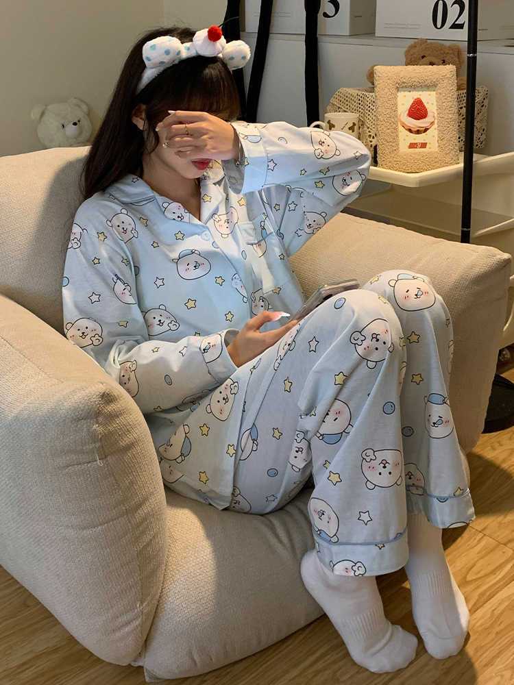 졸린 사람들을 위한 자조적인 곰 잠옷 여성용 봄 가을 긴팔 일본식 만화 학생용 홈웨어 세트 외출용 가능 밀크 실크