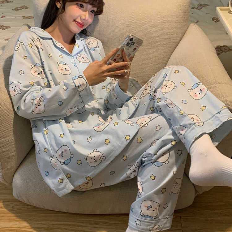 졸린 사람들을 위한 자조적인 곰 잠옷 여성용 봄 가을 긴팔 일본식 만화 학생용 홈웨어 세트 외출용 가능 밀크 실크스토어 가기