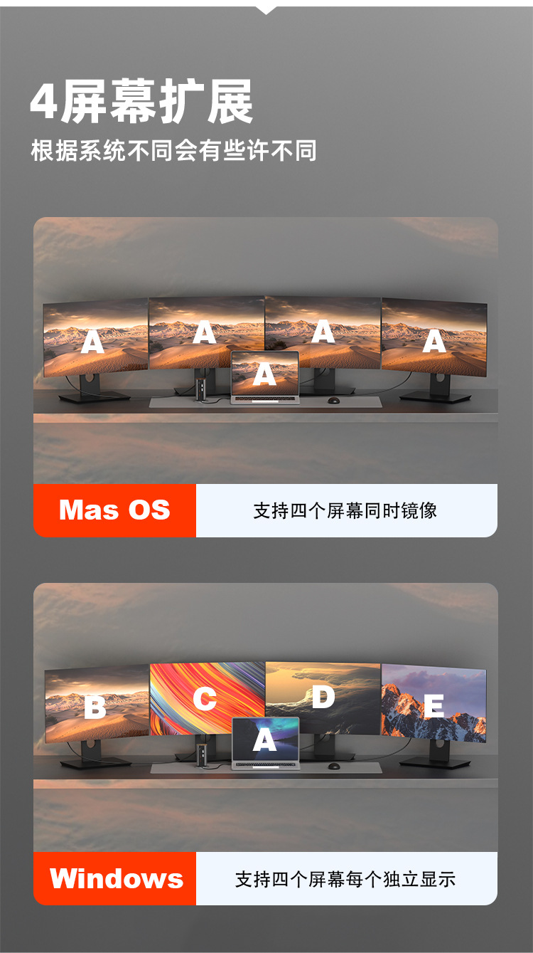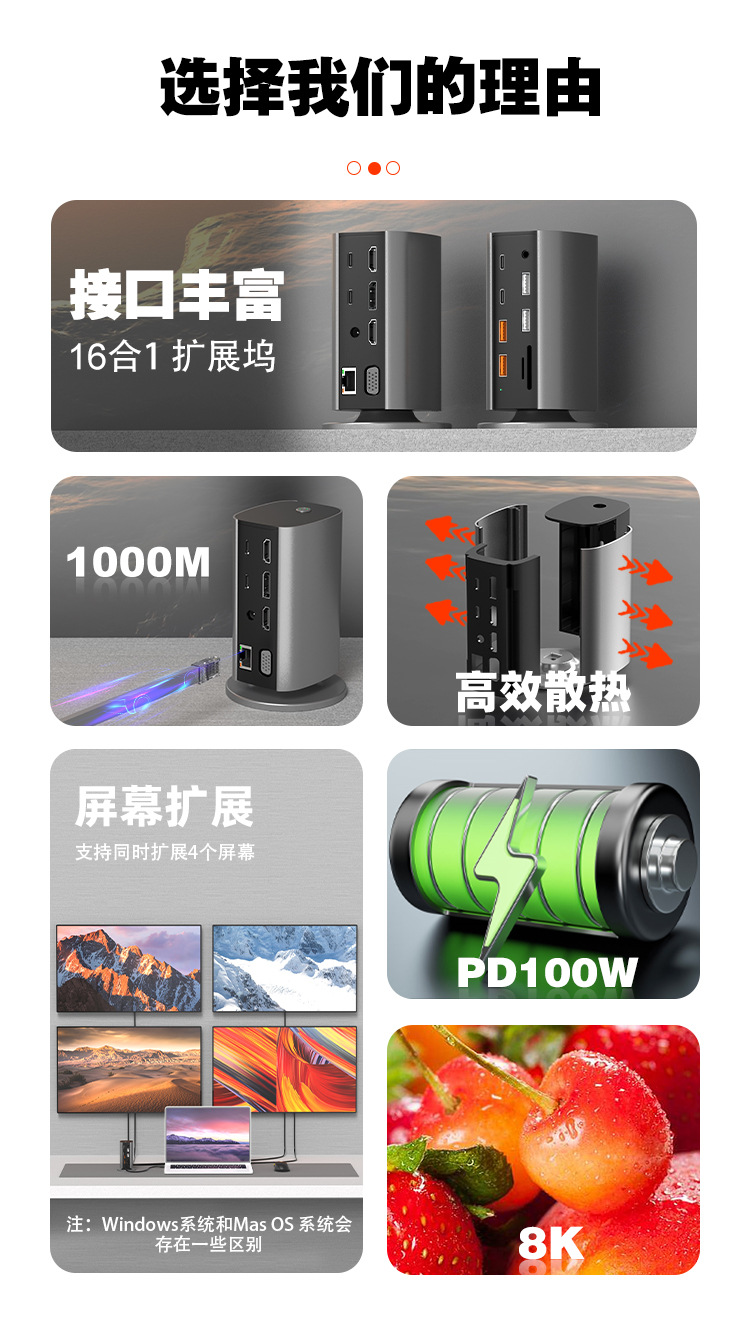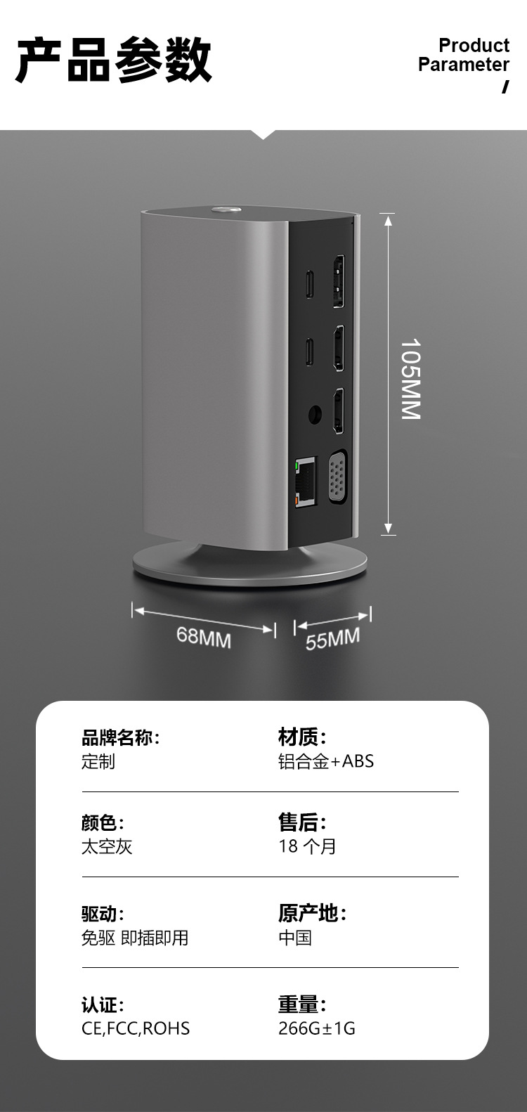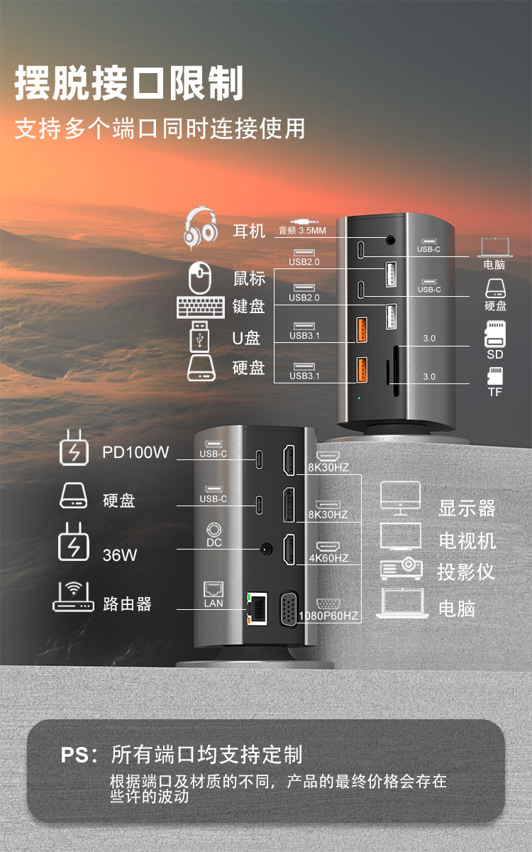16-in-1 Type-C to 2*Type-C+HDMI +HDMI+DisplayPort +VGA+4*USB-A+SD/TF+Audio+RJ45+DC 36W +PD 100W
