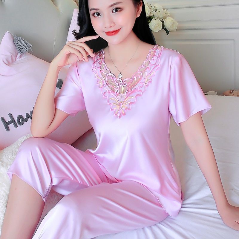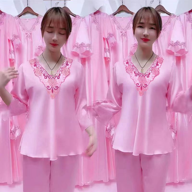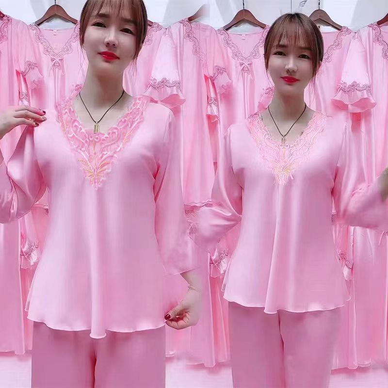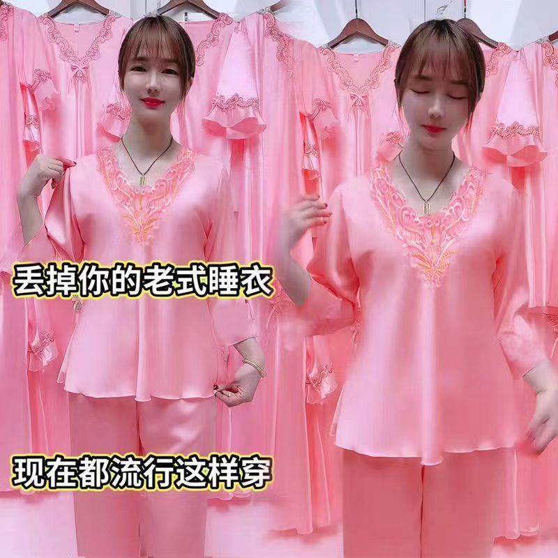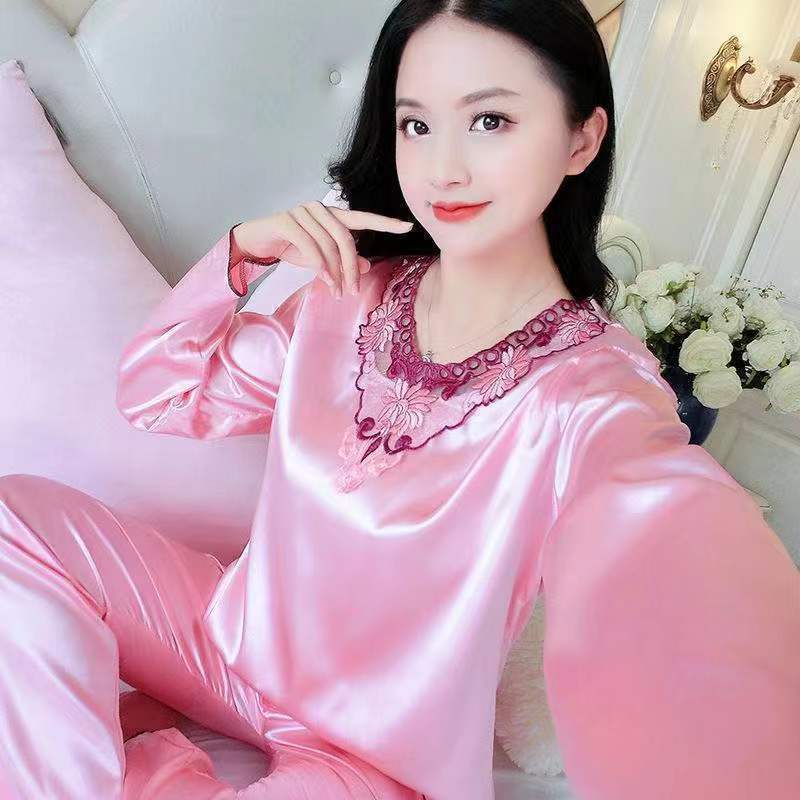 플러스 사이즈 실크 파자마 여성용 여름 얇은 긴팔 바지 투피스 세트 한국식 아이스 실크 봄과 가을 홈 의류스토어 가기