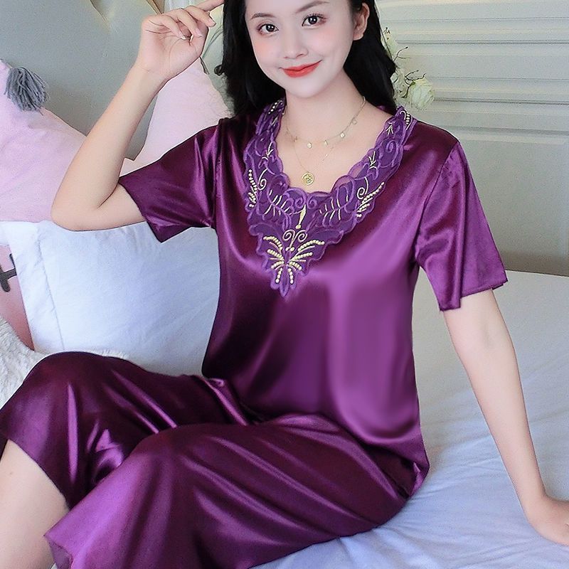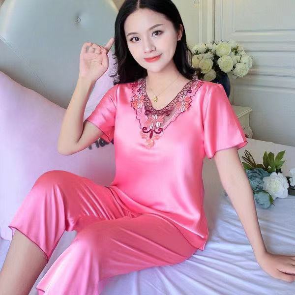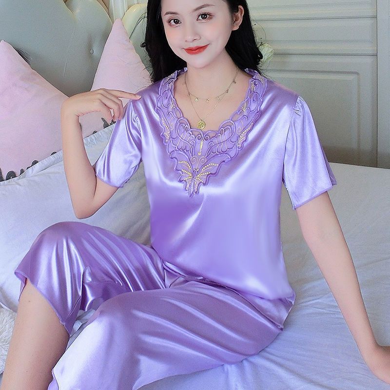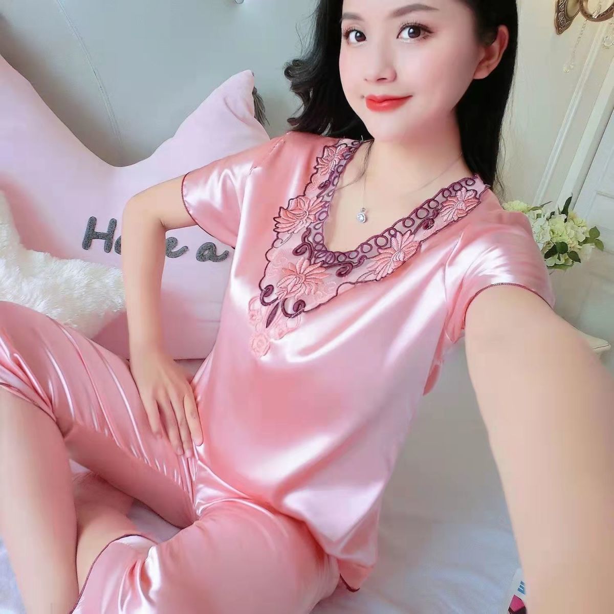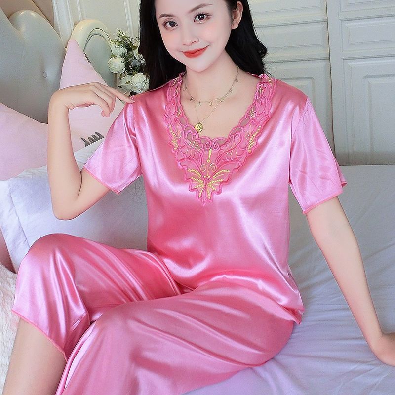 플러스 사이즈 실크 파자마 여성용 여름 얇은 긴팔 바지 투피스 세트 한국식 아이스 실크 봄과 가을 홈 의류스토어 가기