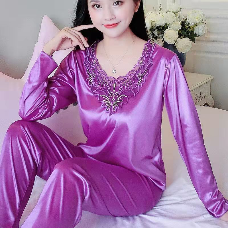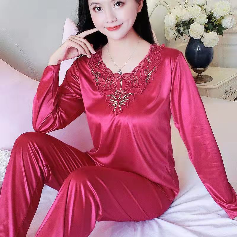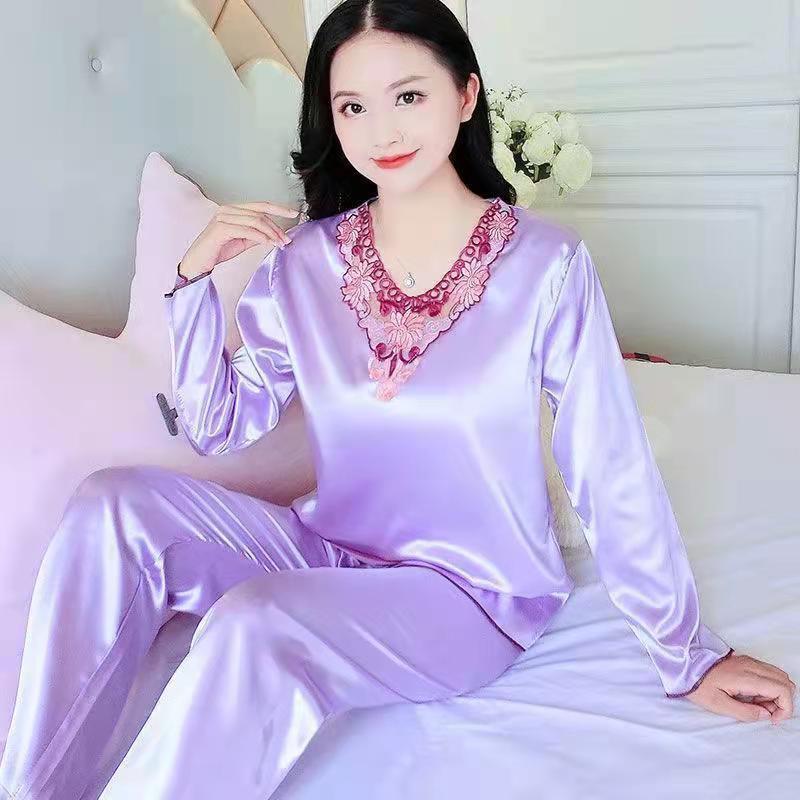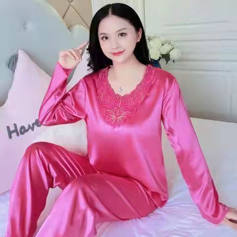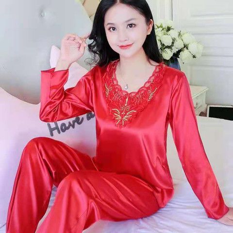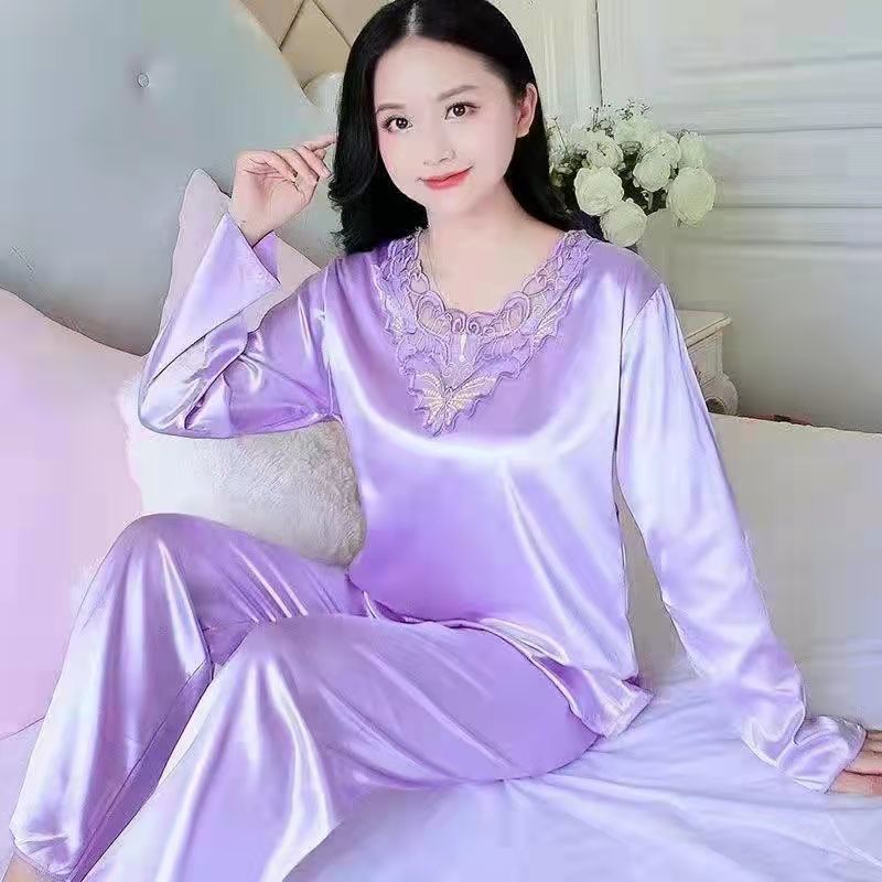 플러스 사이즈 실크 파자마 여성용 여름 얇은 긴팔 바지 투피스 세트 한국식 아이스 실크 봄과 가을 홈 의류