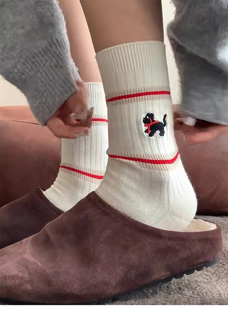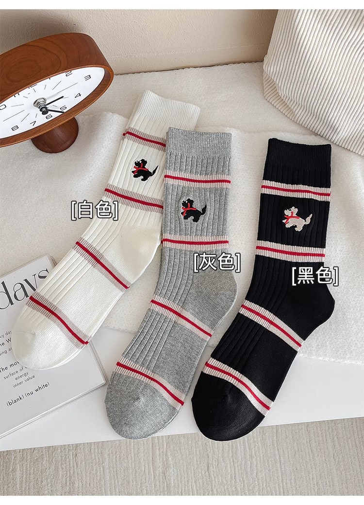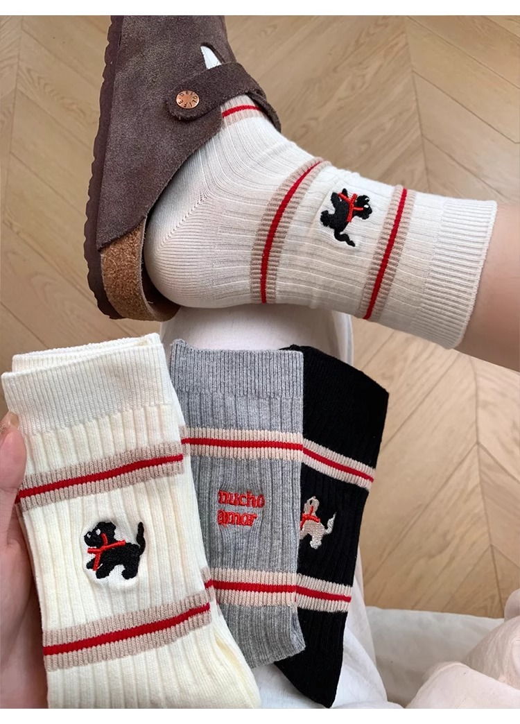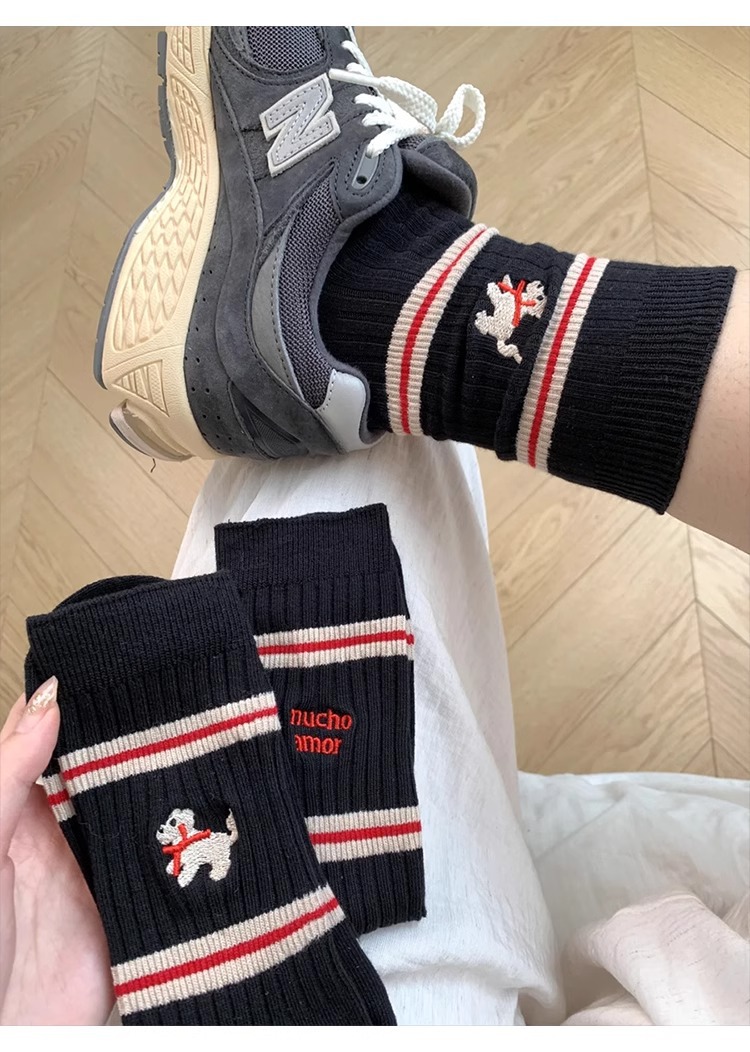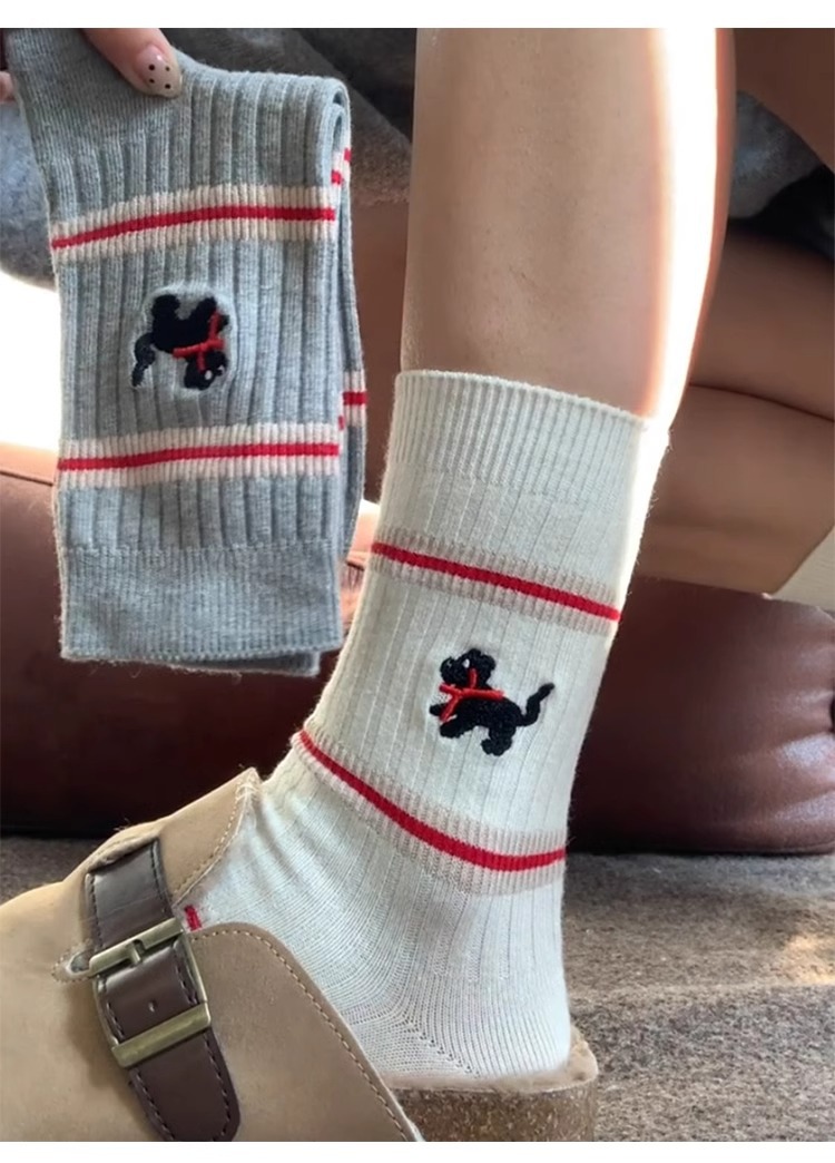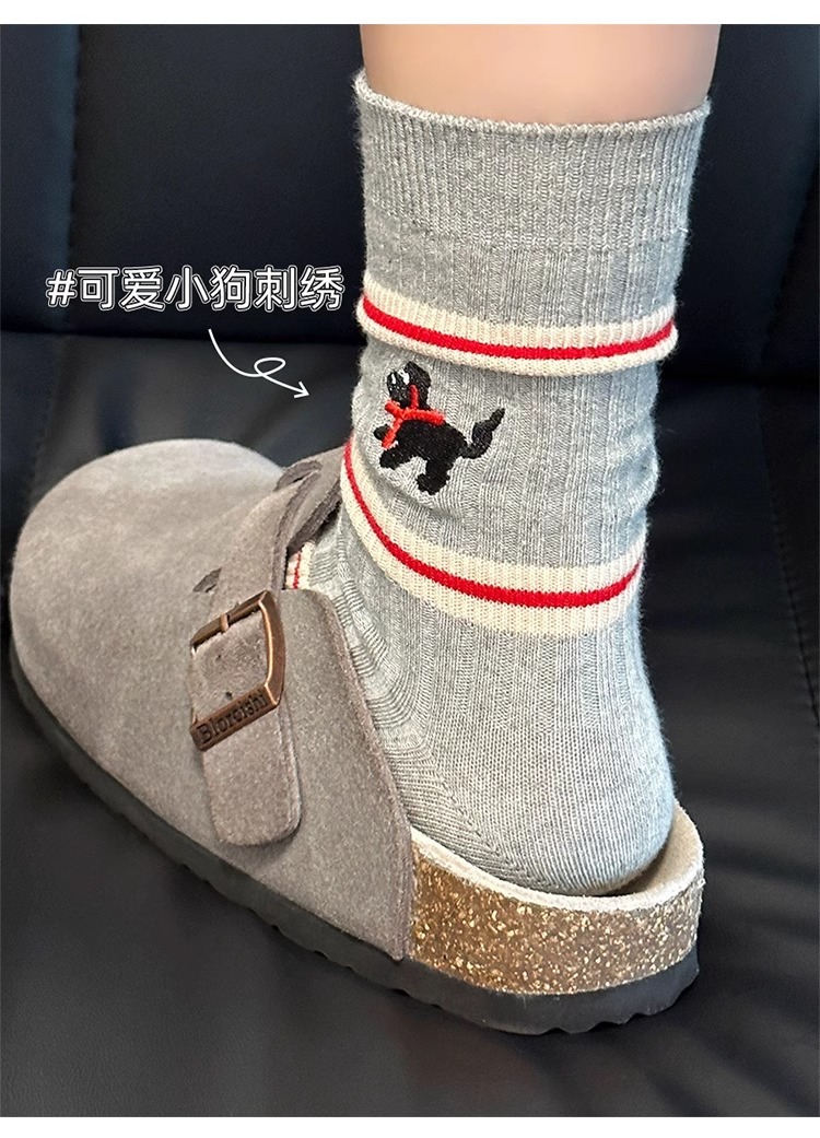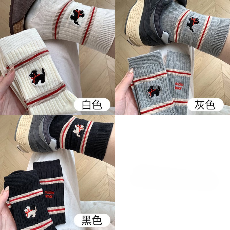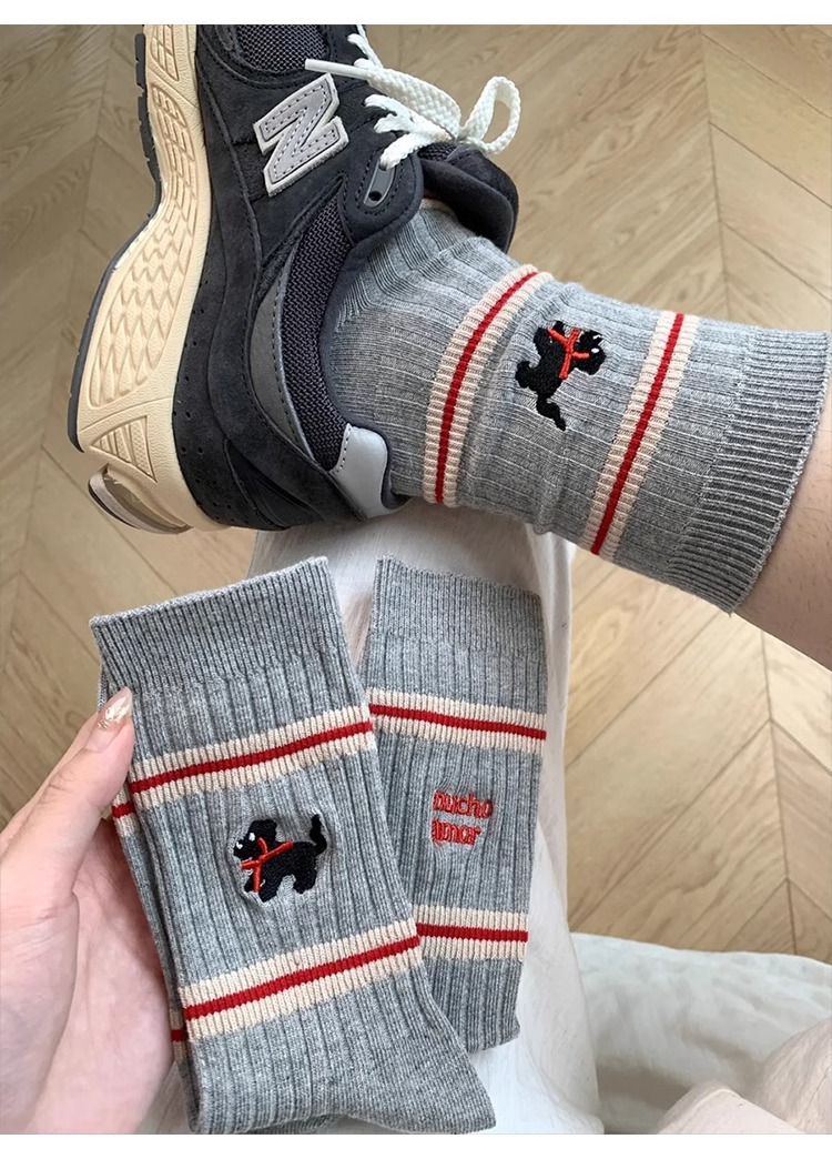 줄무늬 강아지 양말 여성용 중간 길이 양말 봄 가을 귀여운 인스 트렌드 인터넷 유명인 한국 스타일 회색 순면 롱 양말 가을용스토어 가기