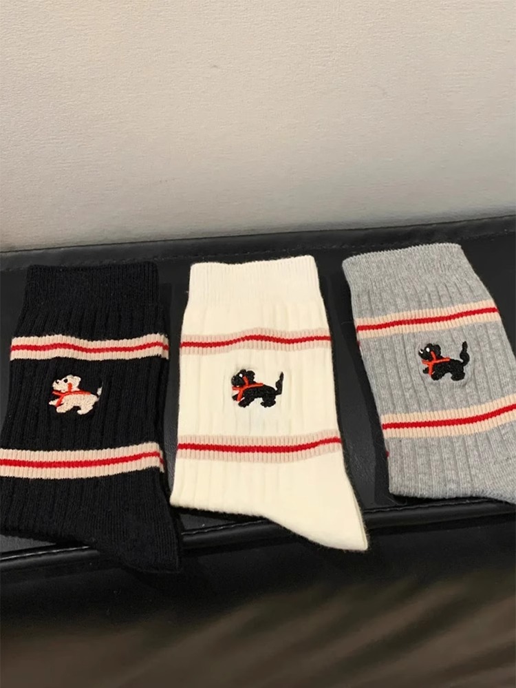 줄무늬 강아지 양말 여성용 중간 길이 양말 봄 가을 귀여운 인스 트렌드 인터넷 유명인 한국 스타일 회색 순면 롱 양말 가을용